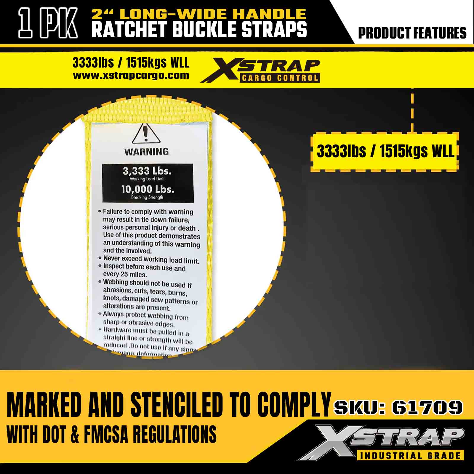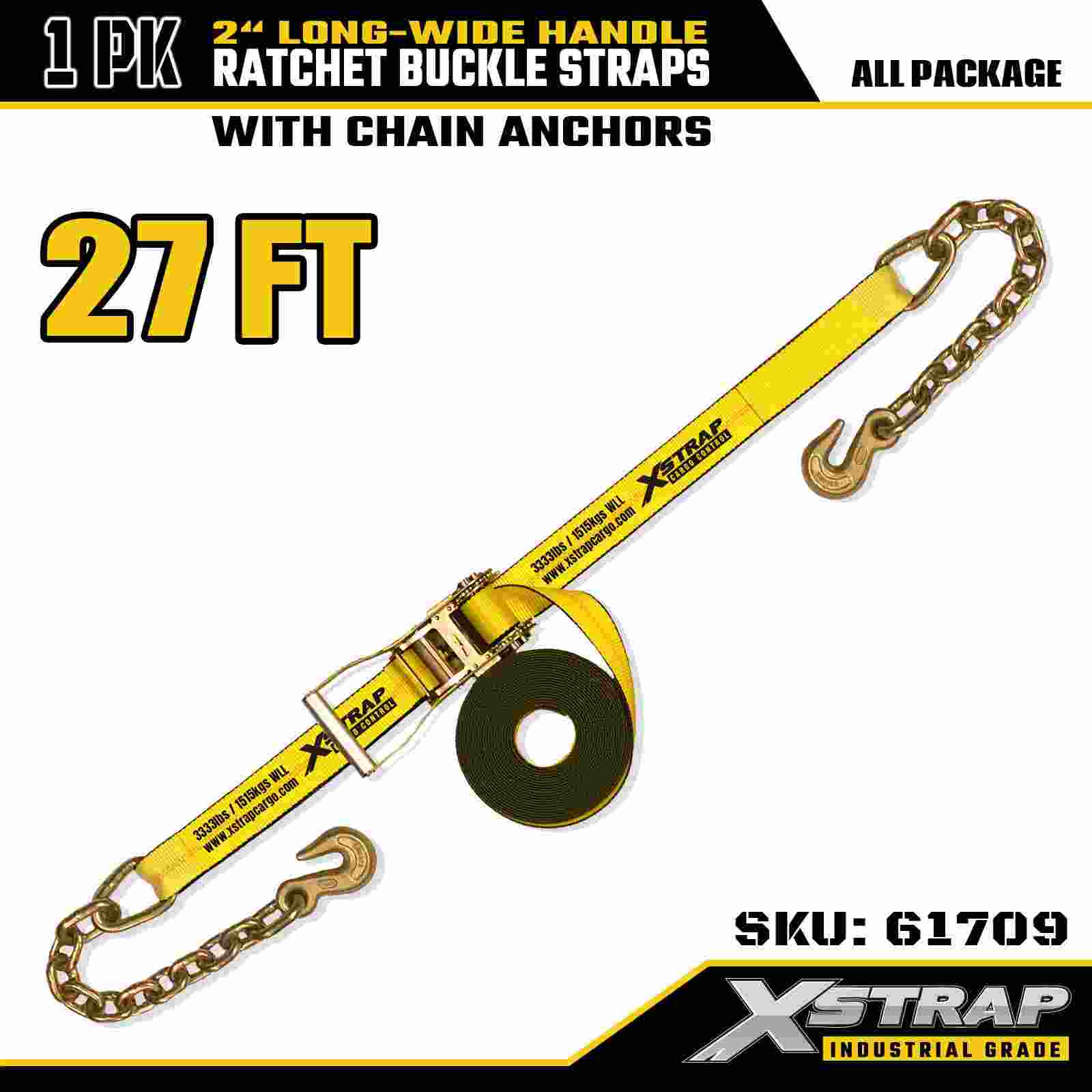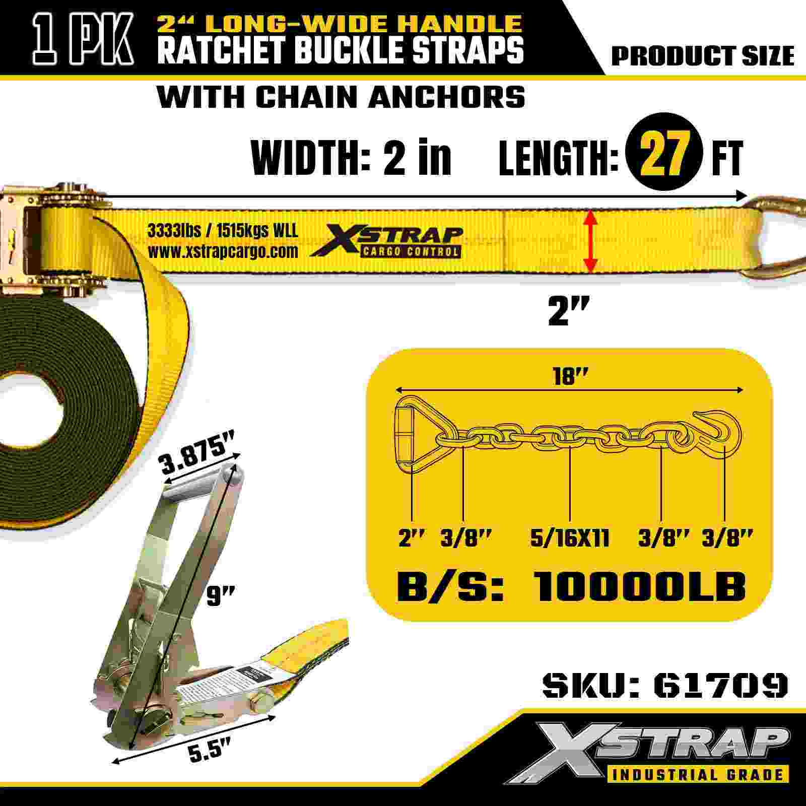 Xstrap 61709 Pitkän leveän kahvan räikkäsoljen hihnat 2" x 27 jalkaa (1 pakkaus) kanssa Ketjukoukut, 10 000 lbs murtolujuus, raskas sidontahihna turvalliseen kuljetukseen