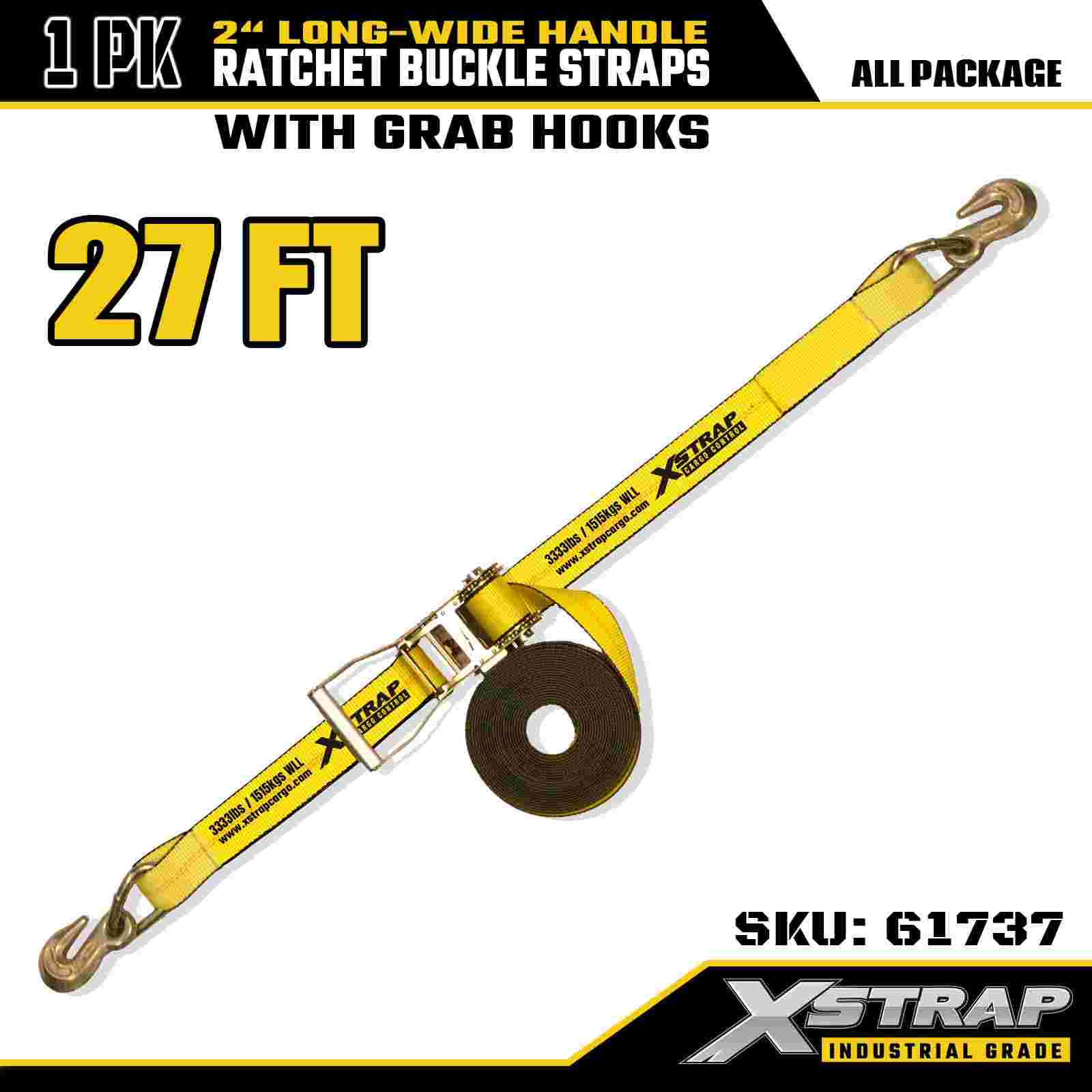 Xstrap 61737 Heavy Duty 2" x 27" 1PK räikkähihna tartuntakoukuilla keltainen, WLL 3 333 lbs, pitkä leveä räikkänauha koneita ja laitteita varten
