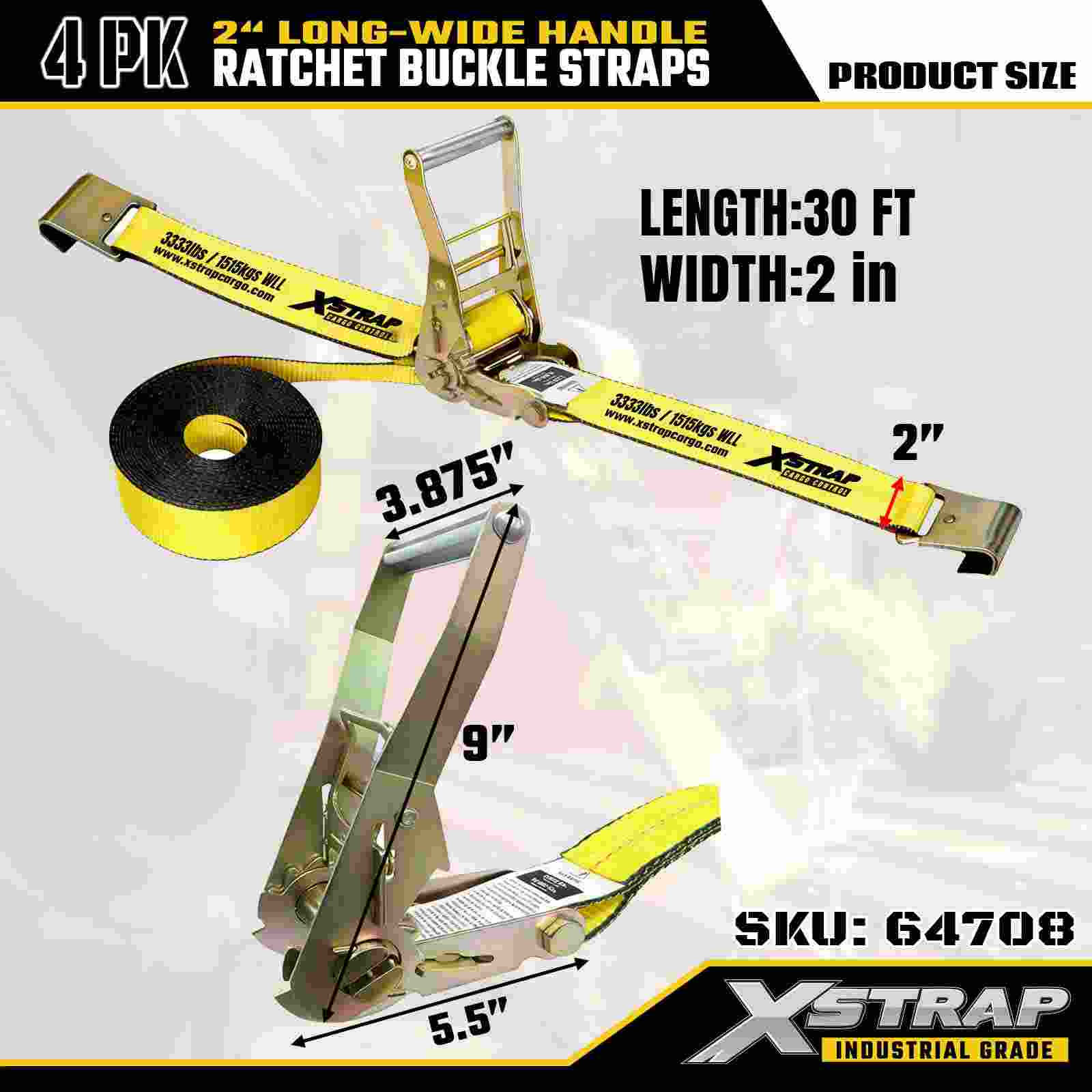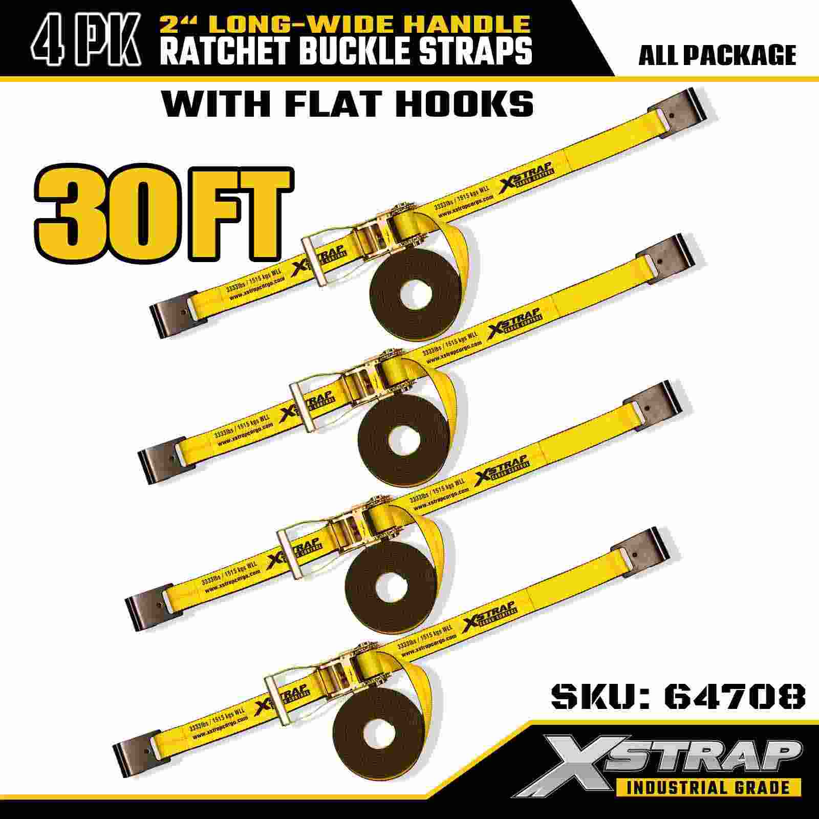 Xstrap 64708 2" x 30 jalkaa pidennetyn kahvan räikkäsoljen hihnat (4 kpl) – litteät koukut, nimellislujuus 10 000 paunaa, teollinen lastinhallintaratkaisu