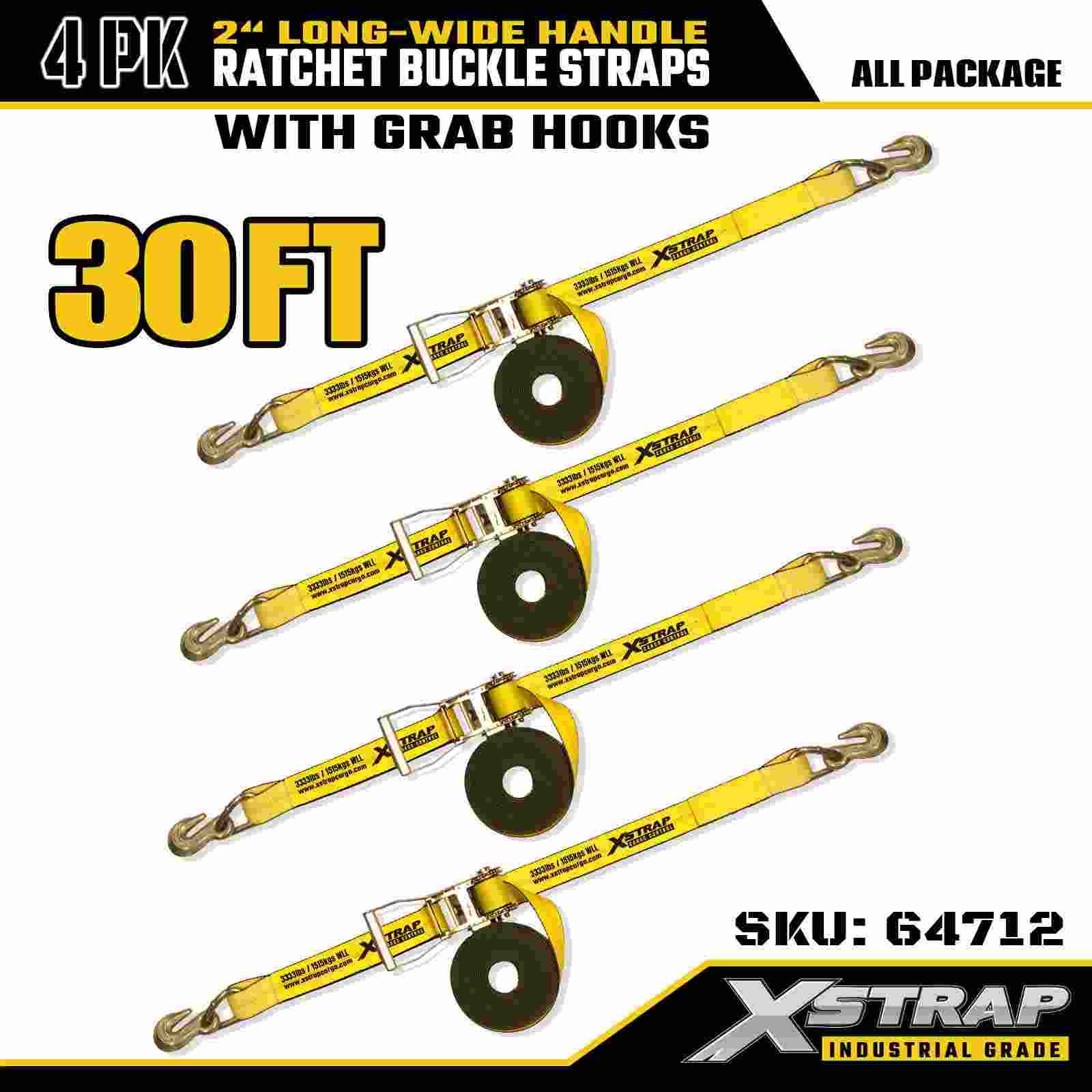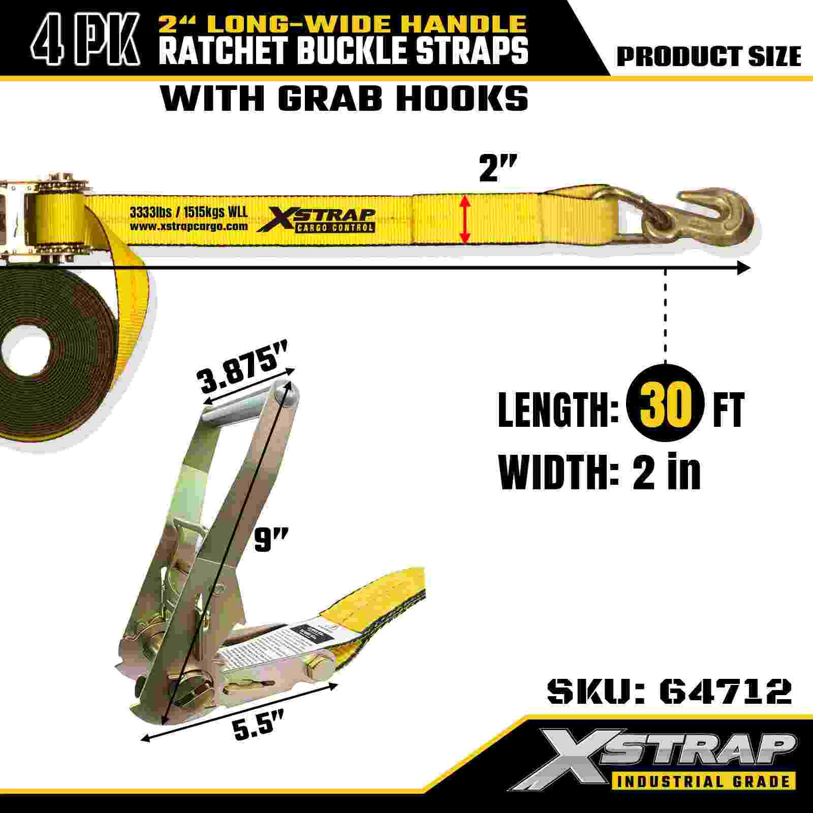 Xstrap 64712 2" x 30 jalkaa pitkät leveät räikkäsoljen hihnat (4 kpl) – tartuntakoukut, kapasiteetti 10 000 lbs, raskas sidonta suurten laitteiden kuljetukseen