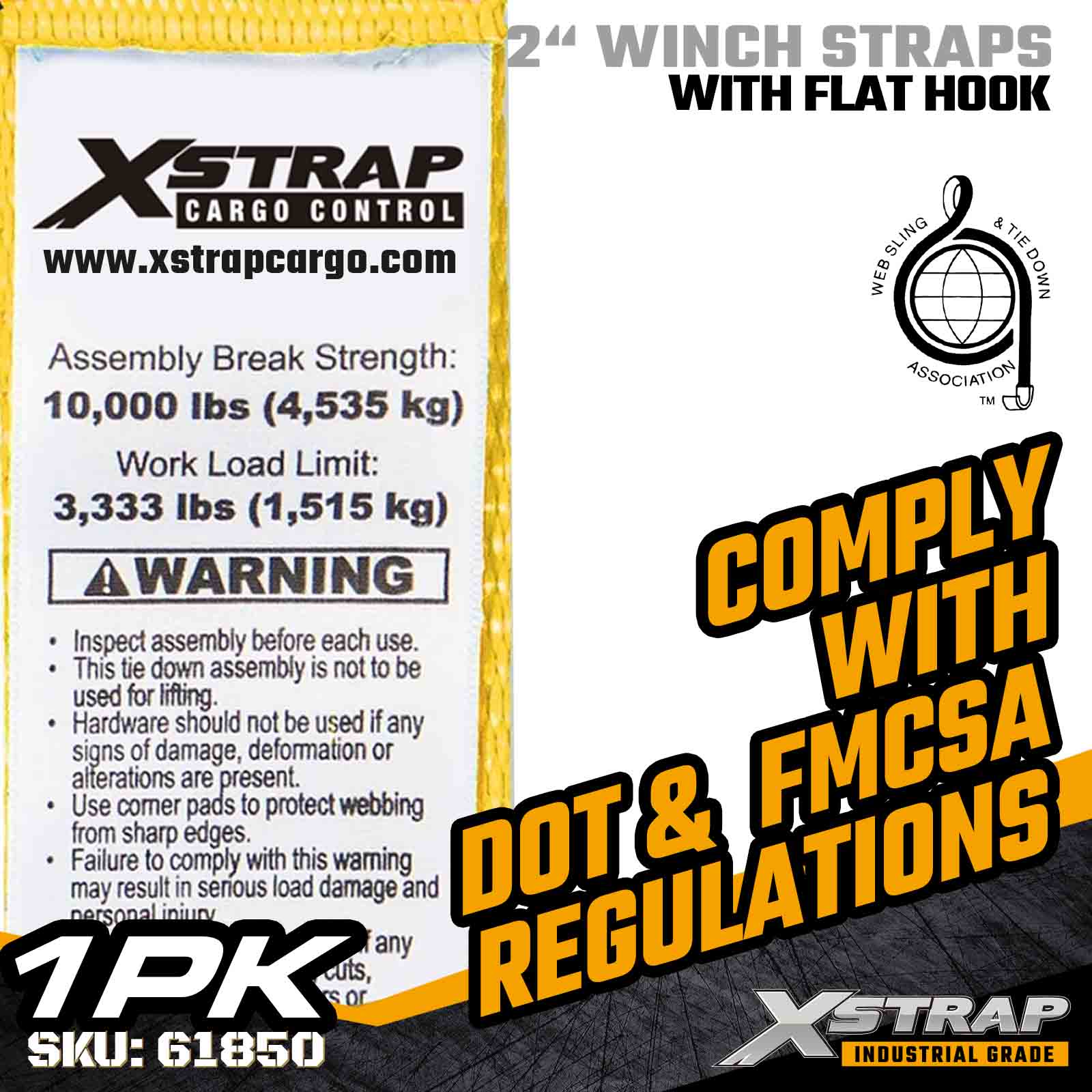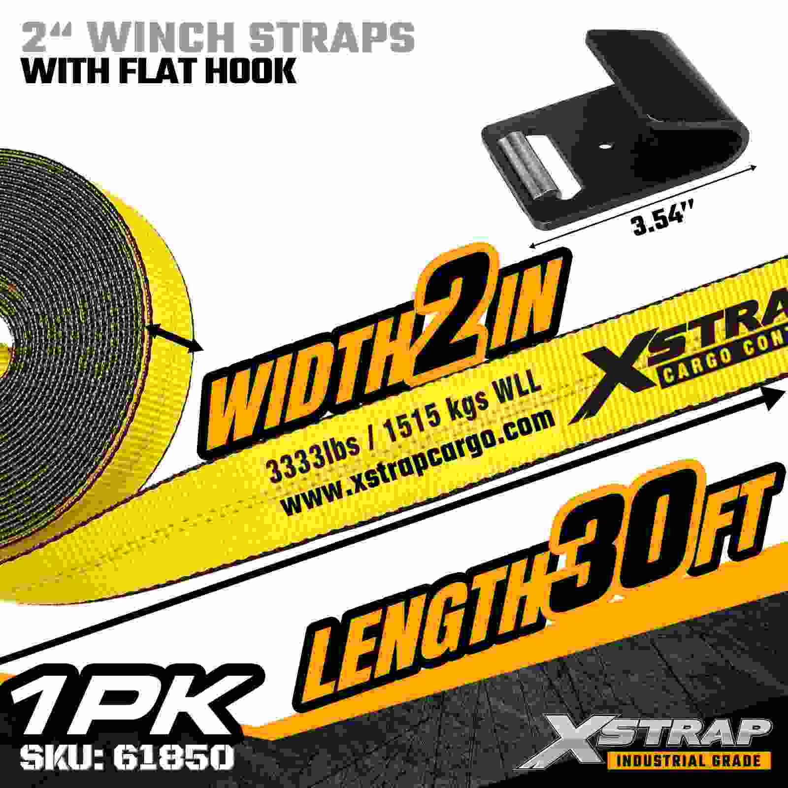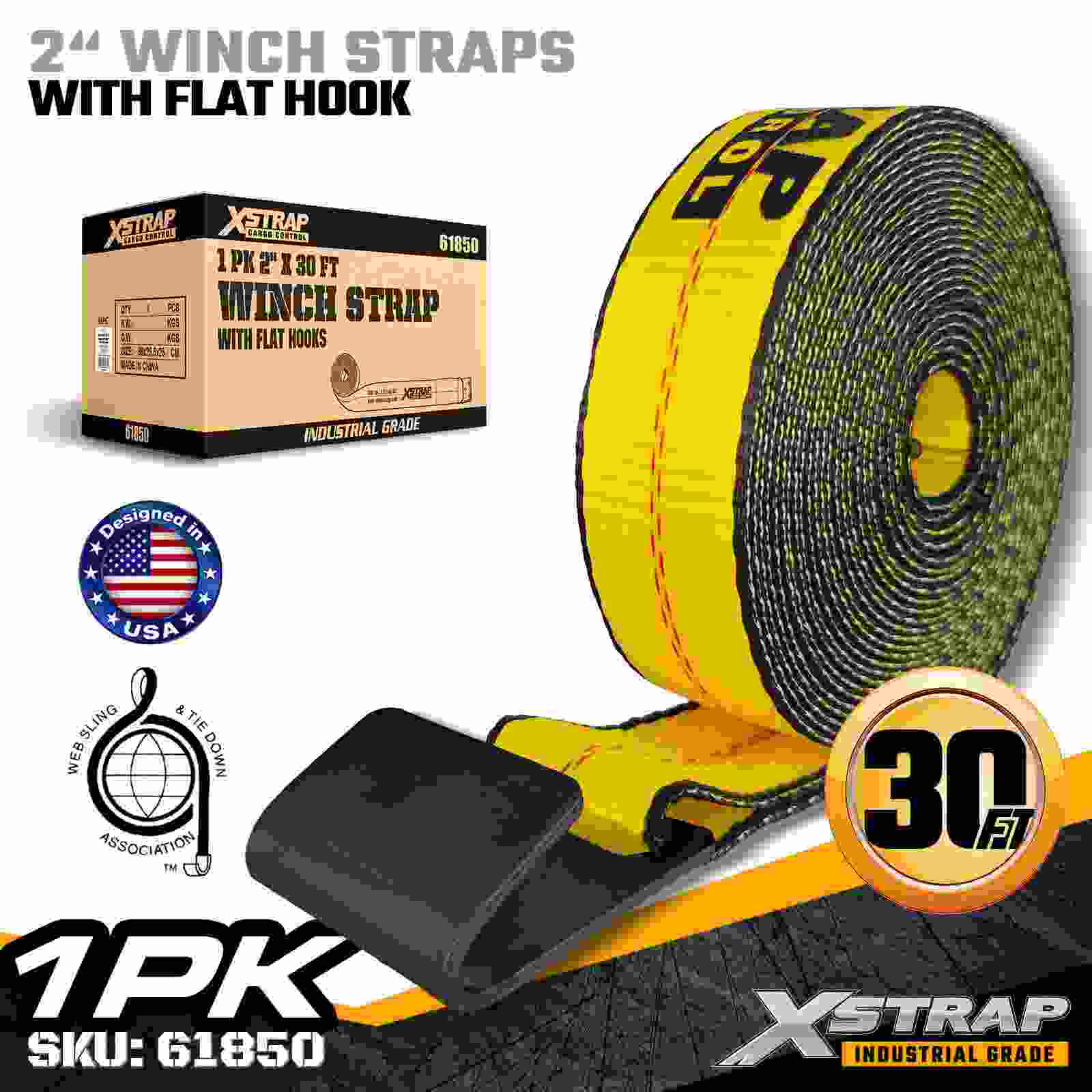 Xstrap 61850 2" × 30 jalkaa vakiovinssihihna on rakennettu luotettavaa tasolastin kiinnitystä varten, ja siinä on vahvistettu Flat Hook ja korkealujuus polyesterinauha. 3 333 lbs:n työkuormitusrajan ja 10 000 lbs:n murtolujuuden ansiosta se tarjoaa kestävää, kestävää kuormitusta. putket ja yleiset logistiikkasovellukset.