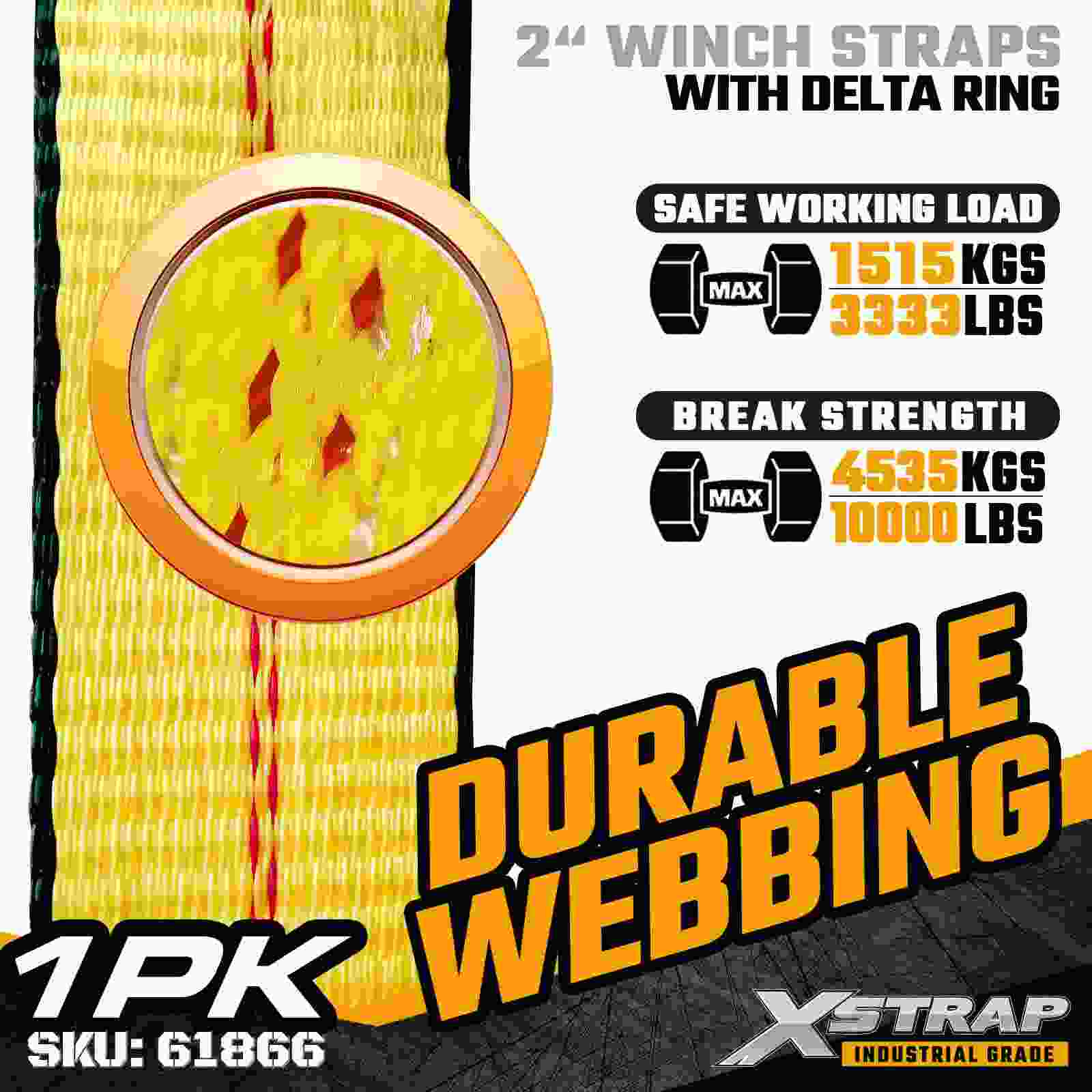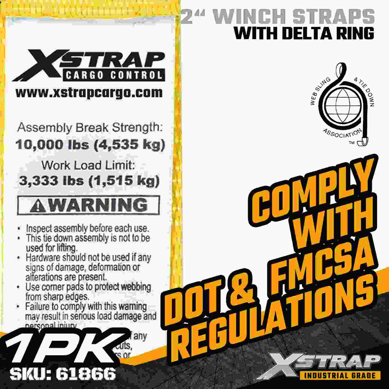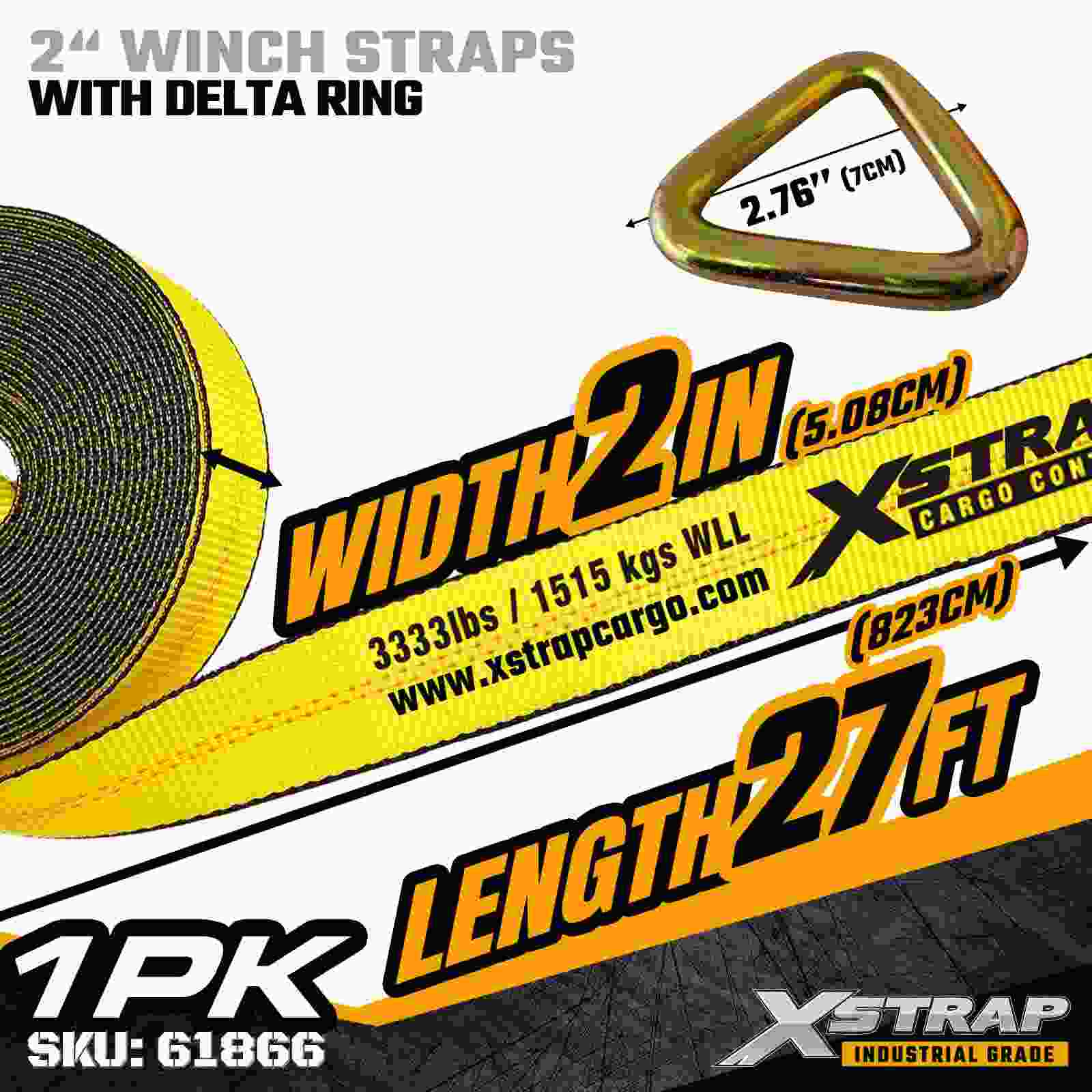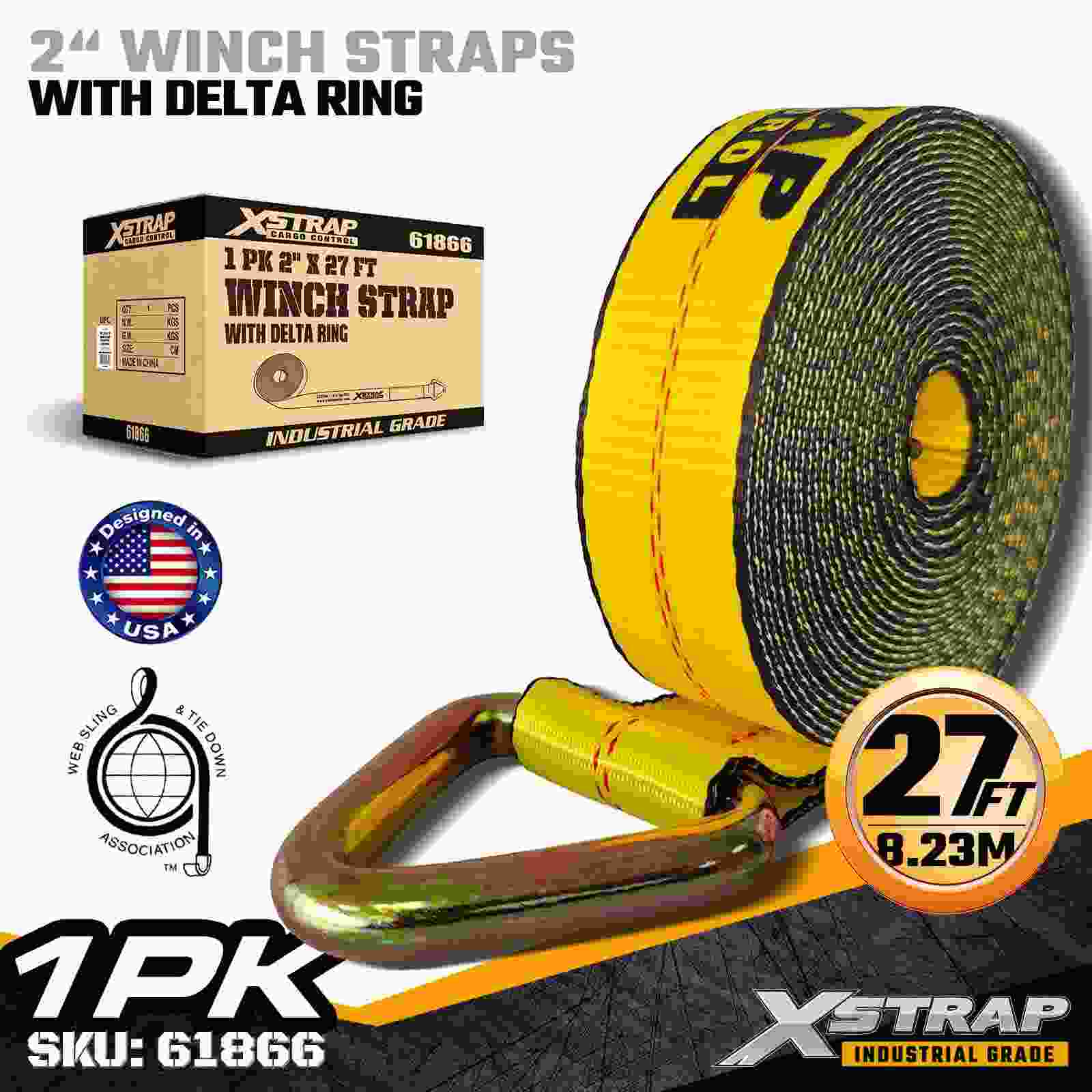 Xstrap 61866 St. 2" × 27 jalkaa Standard Winch Strap on kestävä ja luotettava lastinkiinnityshihna, joka on suunniteltu lavaperävaunuihin ja ammattikuljetuksiin. Vahvalla Delta rengas -renkaalla ja erittäin lujalla polyesterinauhalla varustettu 2 tuuman vinssihihna tarjoaa 3 333 lbs:n työkuorman 0,0akthb. sopii erinomaisesti kuormalavojen, puutavaran, putkien, koneiden ja yleisen rahdin kiinnittämiseen päivittäisten kuljetusoperaatioiden aikana.
