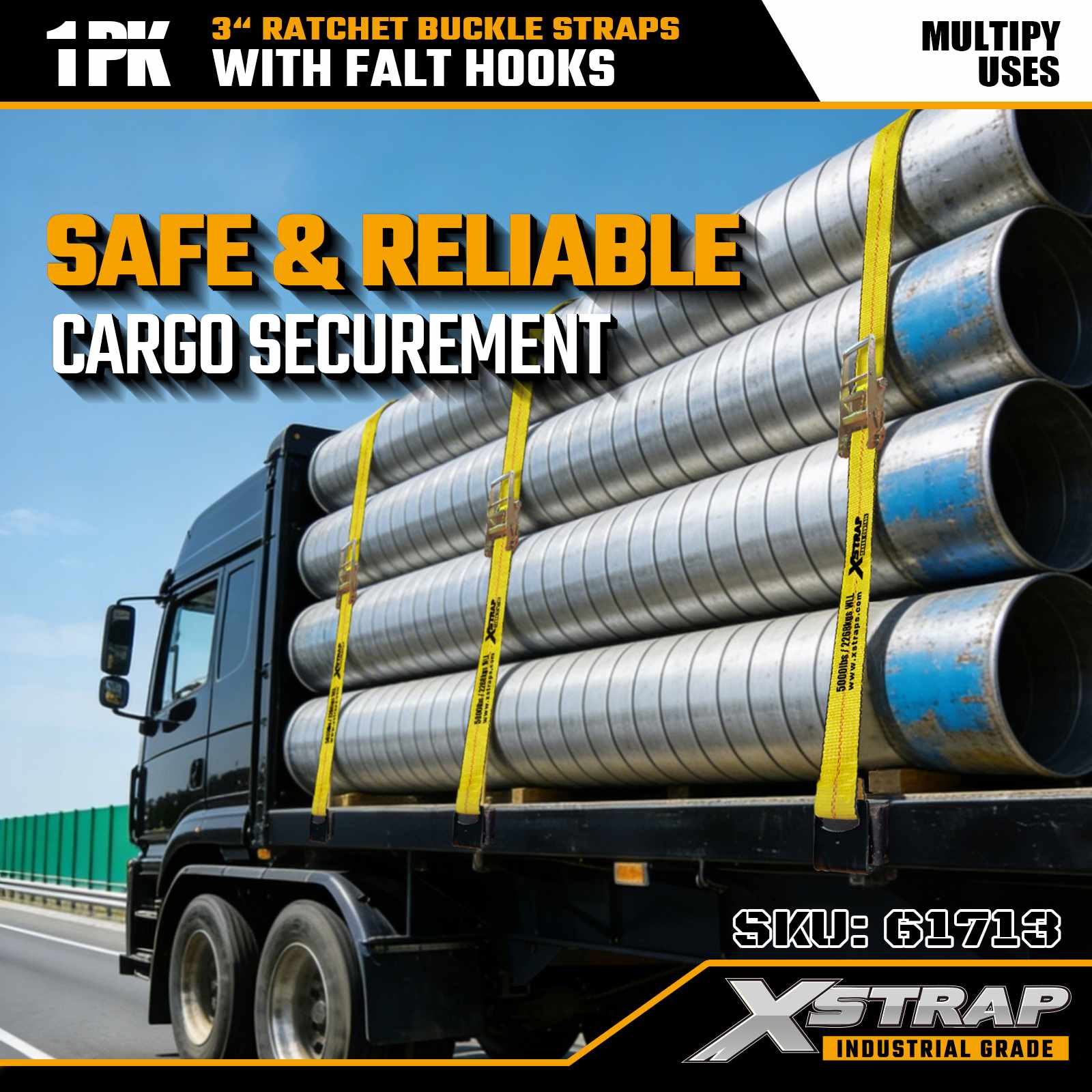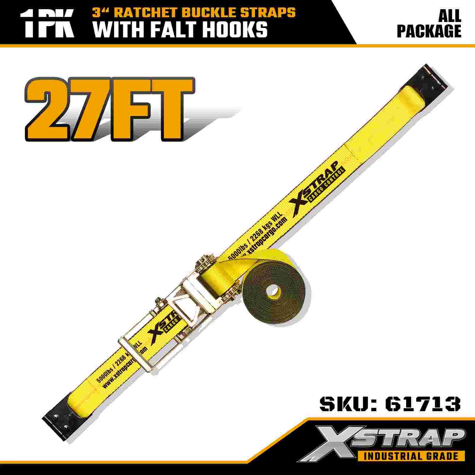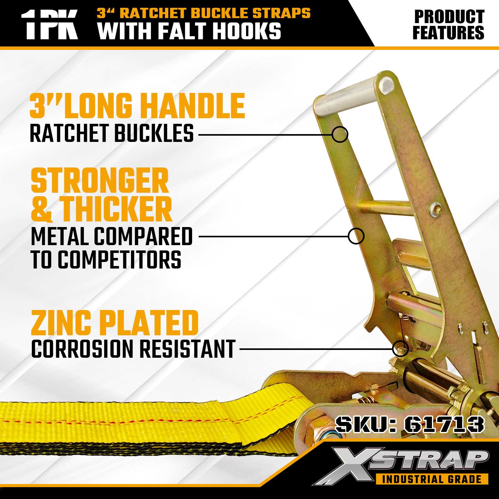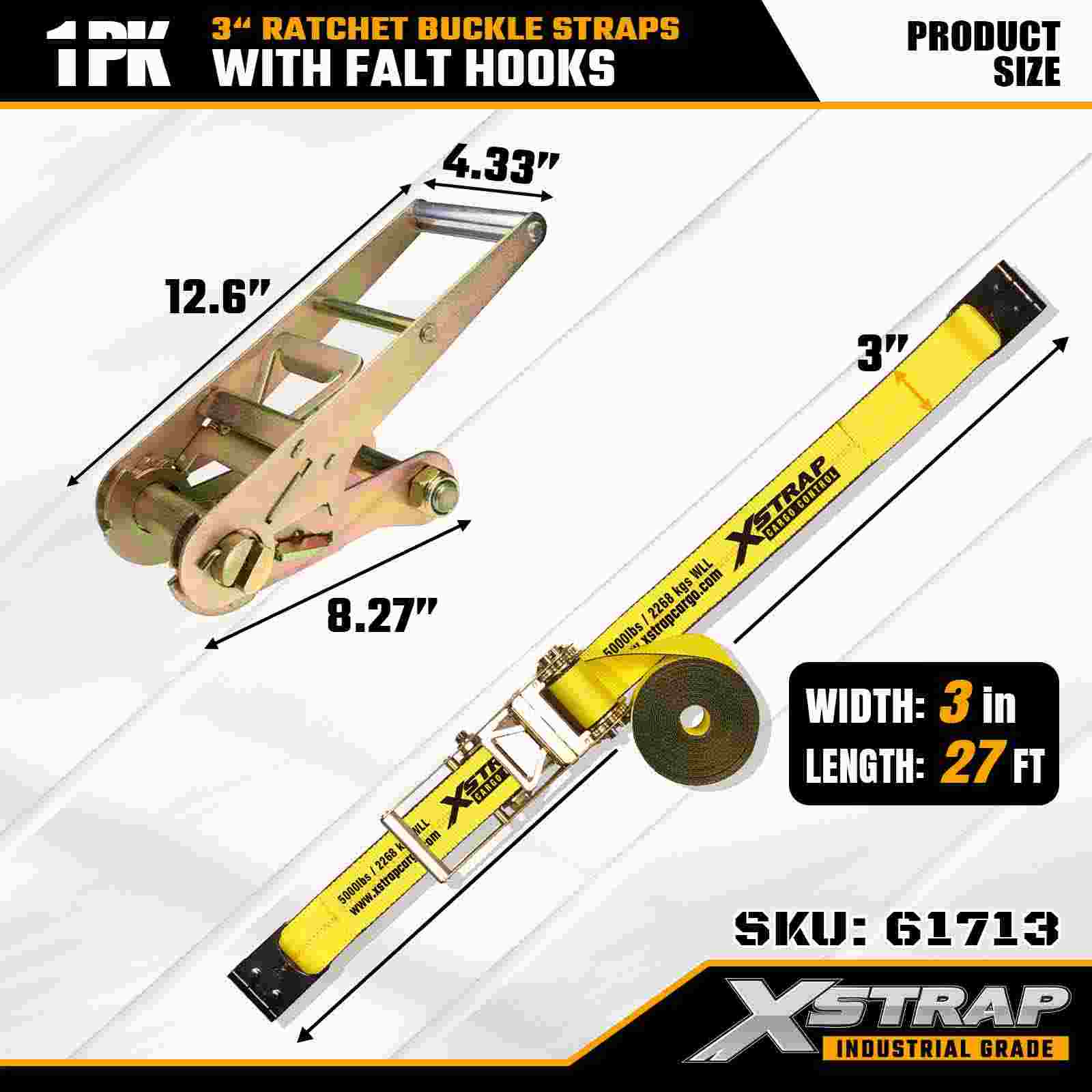 Xstrap 61713 3" x 27 jalkaa räikkäsoljen hihnat (1 kpl) litteät koukut, 5 000 paunaa kantavuus 15 000 paunaa murtolujuus, raskas sidonta kuorma-autoihin, perävaunuihin ja teollisuusrahtikuljetuksiin.