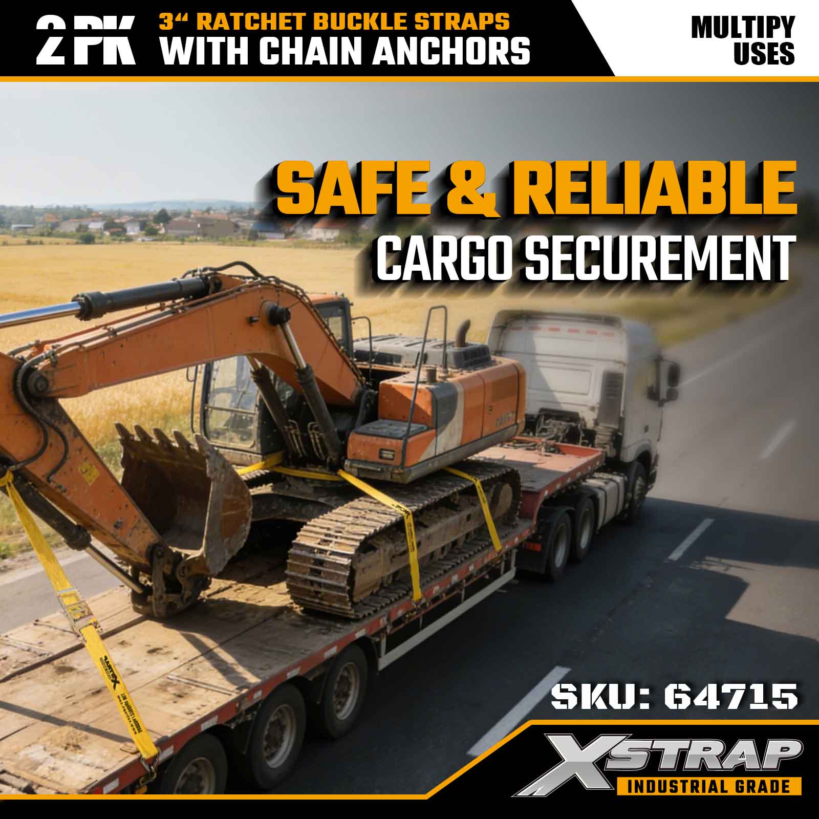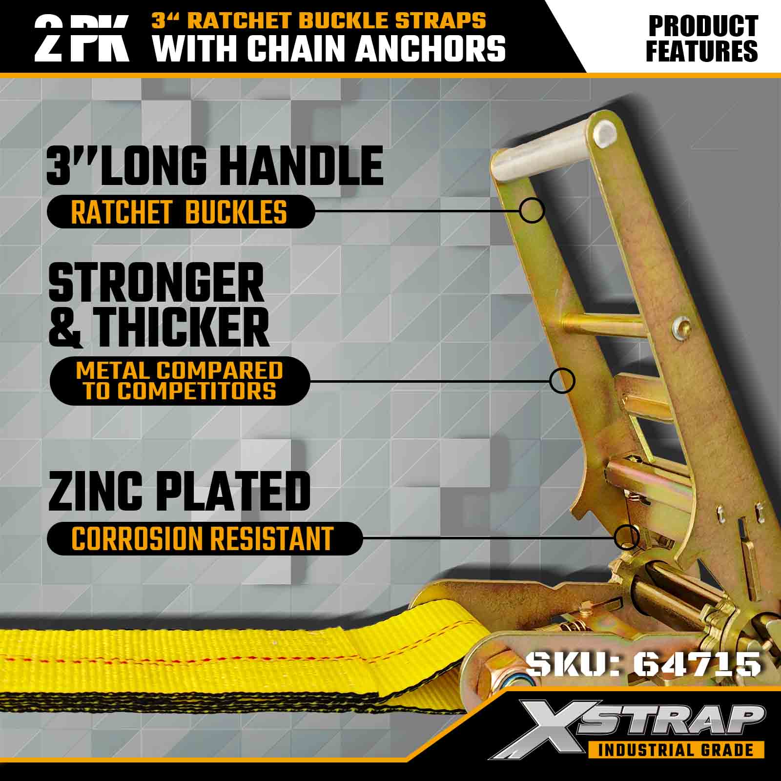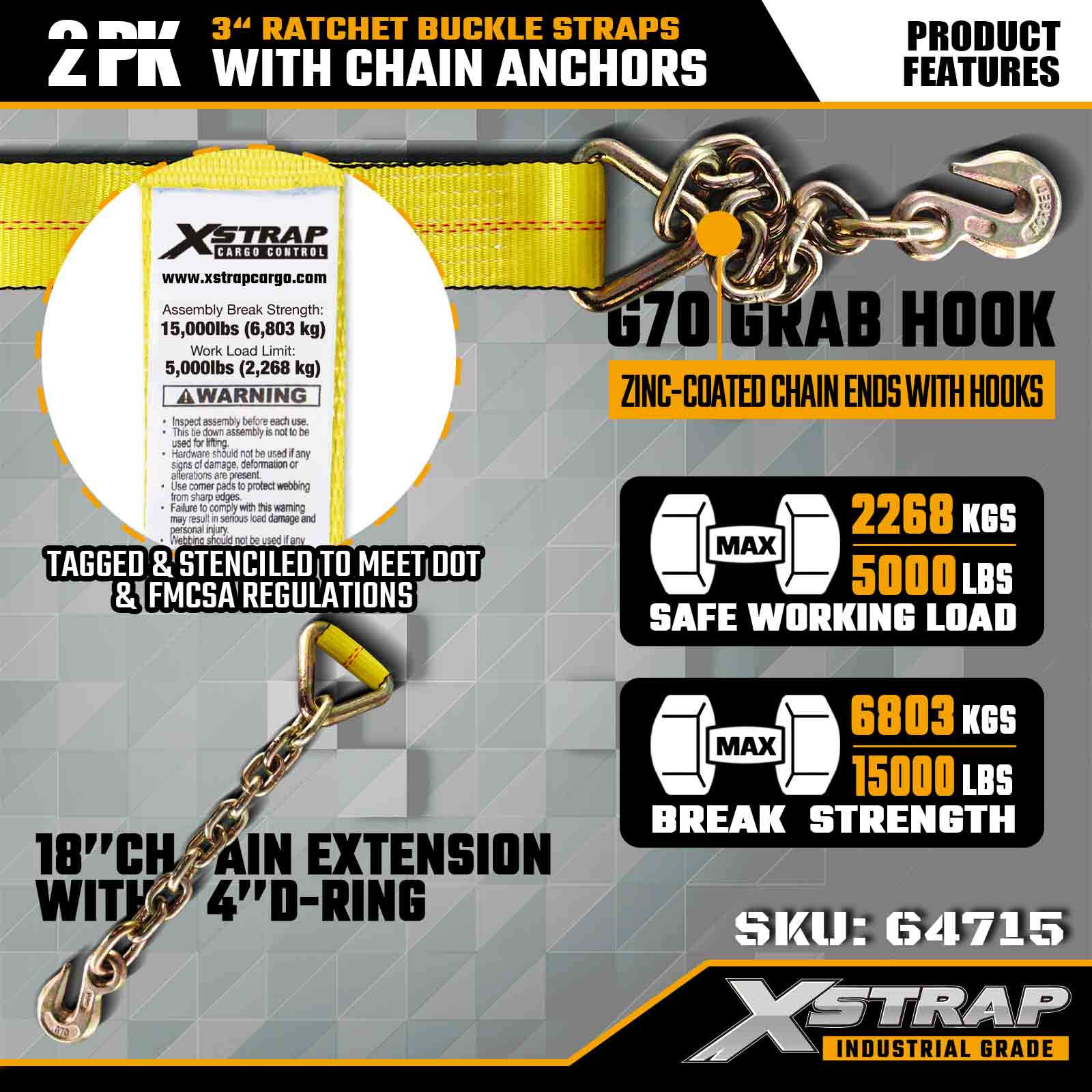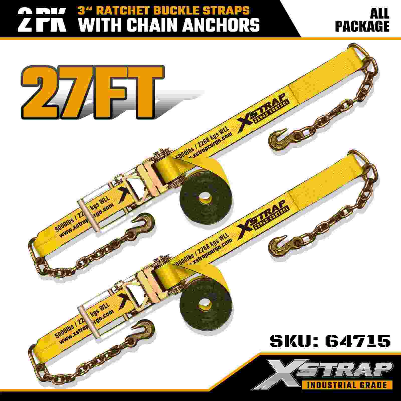 Xstrap 64715 3" × 27 jalan räikkäsolkihihnat (2 kpl) – varustettu raskaitilla ketjuankkureilla, jotka on suunniteltu vaativiin lastiympäristöihin. 5 000 naulan työkuormitusrajan ja 15 000 paunan murtumislujuuden ansiosta nämä litteät hihnat ovat ammattimaisia, turvallisia ja turvallisia. konekuljetukset ja teollinen kuljetus.