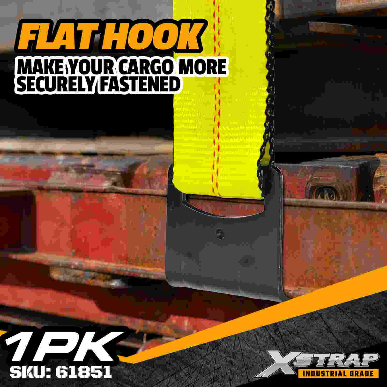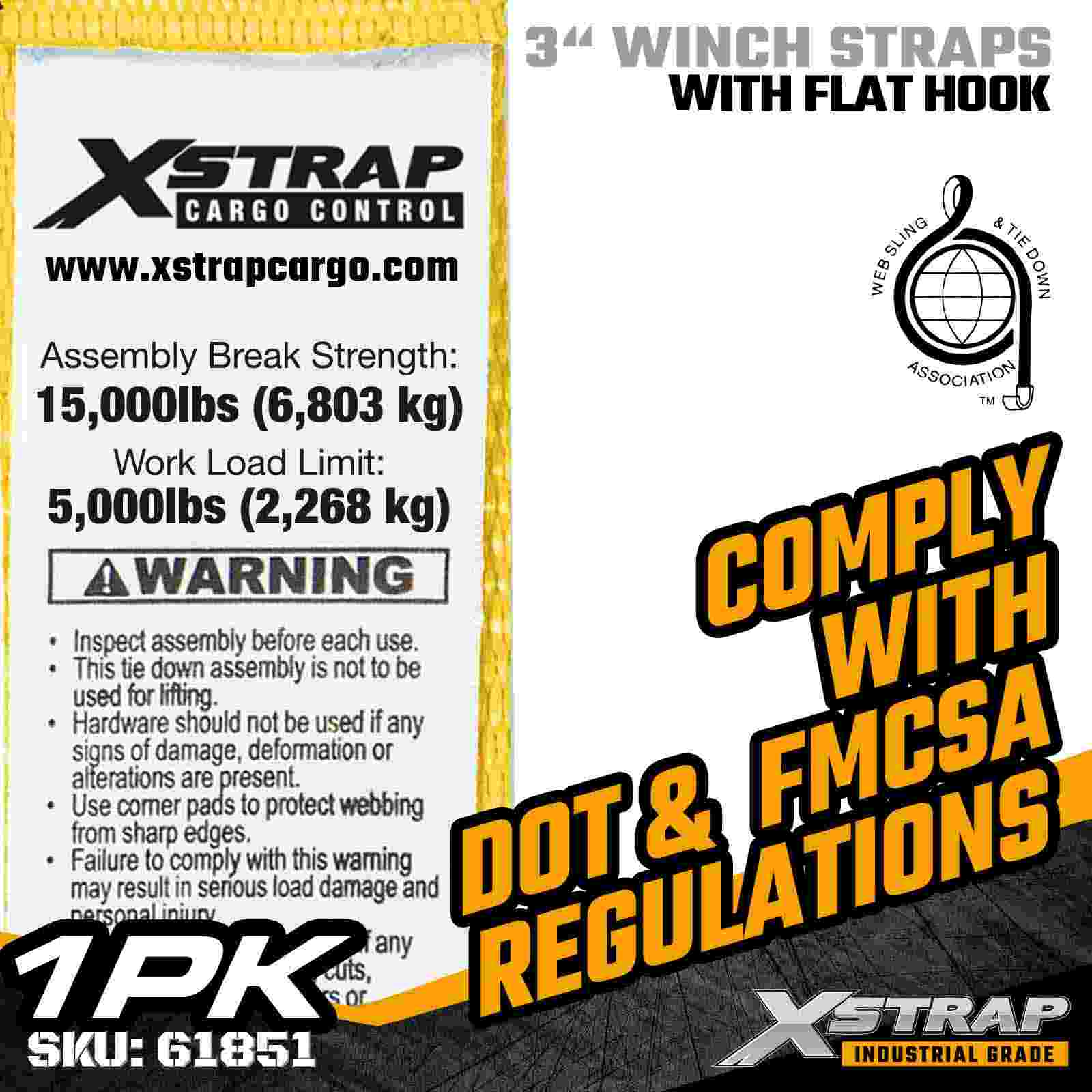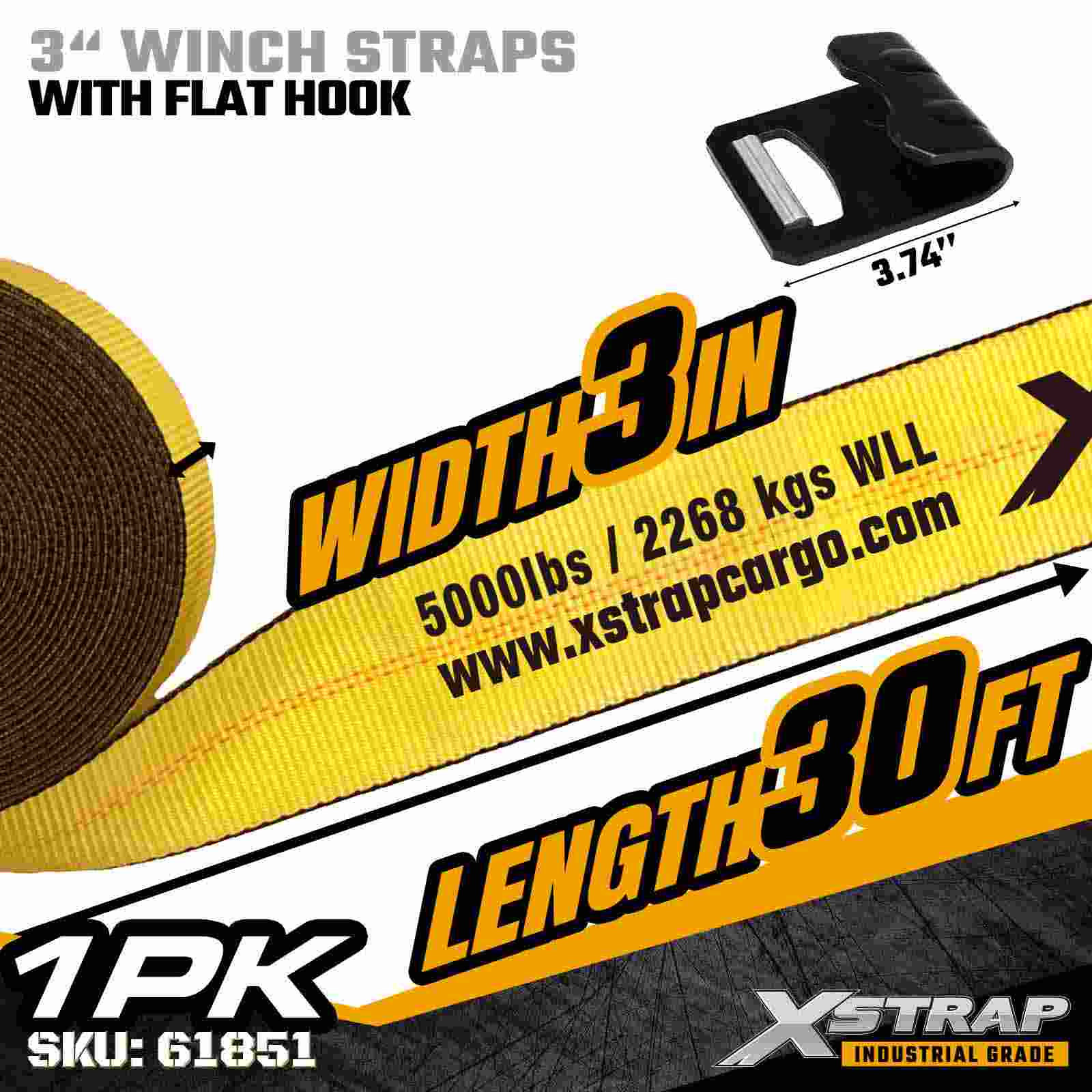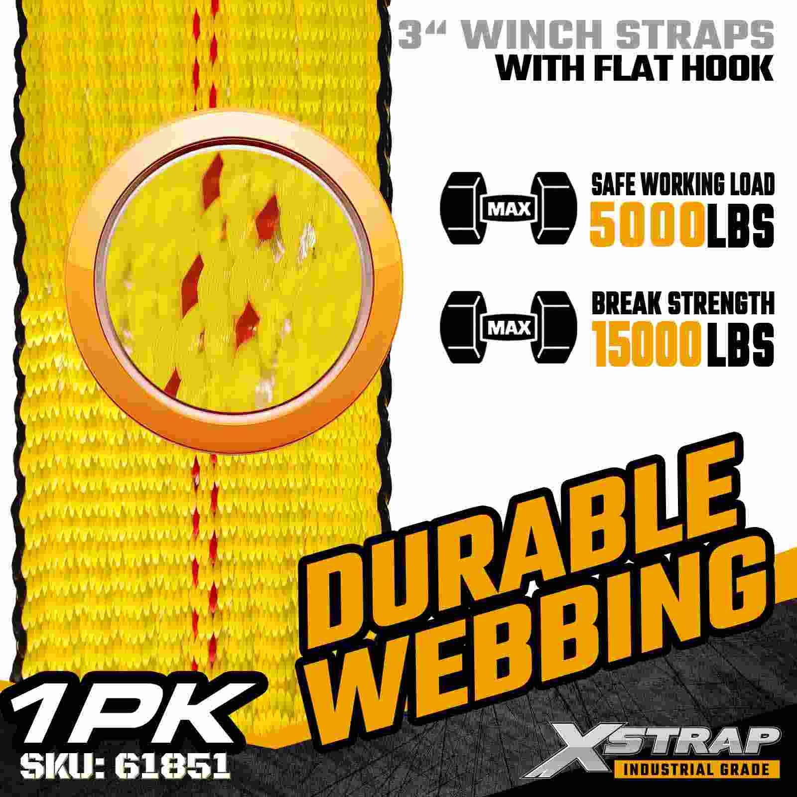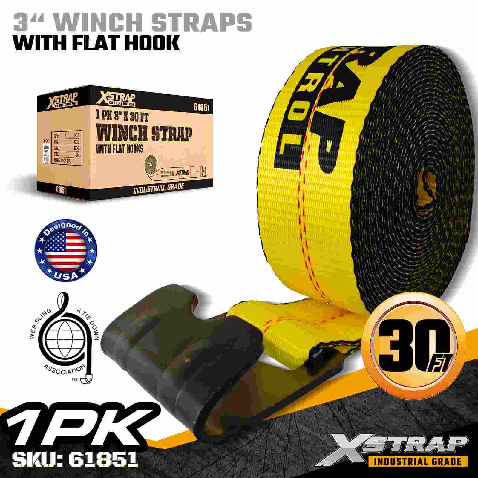 Xstrap 61851 3" × 30 jalkaa Standard Winch Strap on raskaaseen kuormankiinnityshihna, joka on suunniteltu lavaperävaunuihin ja suuren kapasiteetin kuljetuksiin. Vahvistettu Litteä koukku -koukku ja erittäin leveä 3 tuuman polyesterinauha. lbs Break Strength Se on ihanteellinen sahatavaran, teräksen, koneiden ja teollisuusrahdin kiinnittämiseen vaativien kuljetusten aikana.