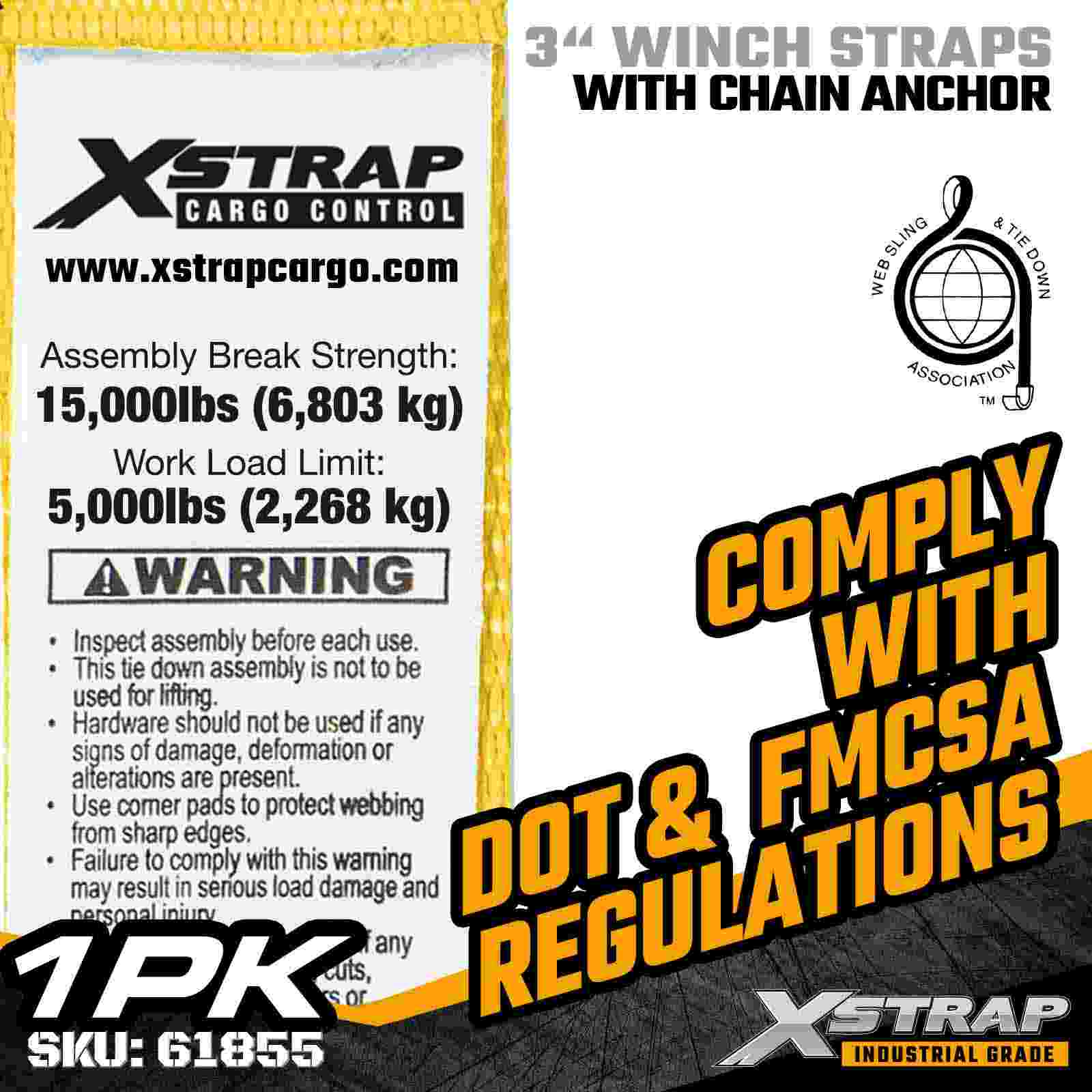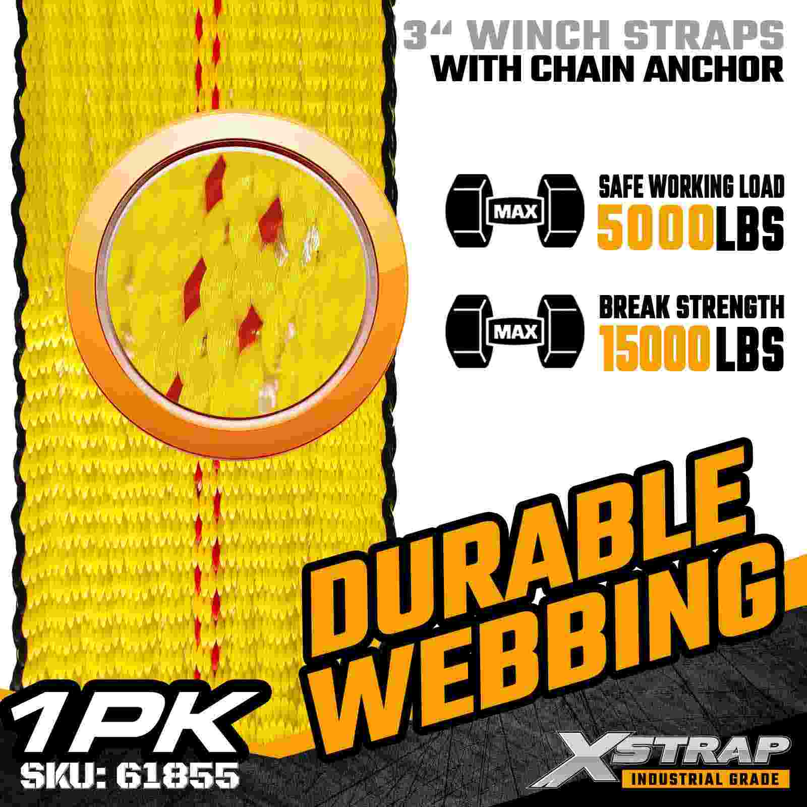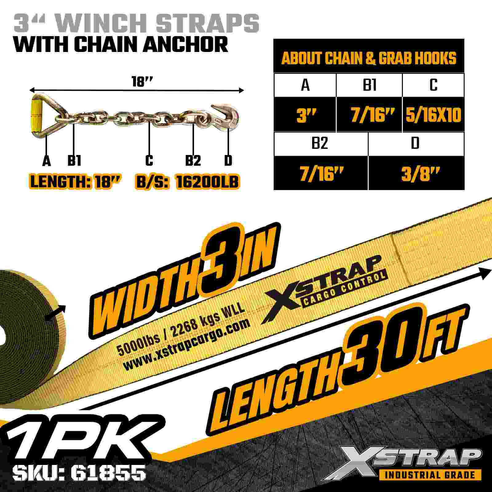 Xstrap 61855 3" × 30 jalkaa Standard Winch Strap on raskaaseen teolliseen kuormankiinnityshihna, joka on suunniteltu lavaperävaunuihin ja ylimitoitettuihin rahtikuljetuksiin. Varustettu taotulla ketjuankkurilla ja erittäin leveällä 3 tuuman polyesterinauhalla, tämä 3 tuuman vinssihihna tarjoaa 5,0 0,010 ja 5,00 010 0,00 0,00 x 0,00 x 0,00 x 0,00 mm. lbs Break Strength Pidennetty 30 jalkaa tekee siitä ihanteellisen leveämpien, korkeampien tai epäsäännöllisen muotoisten kuormien kiinnittämiseen, jotka vaativat lisää ulottuvuutta ja vakautta.