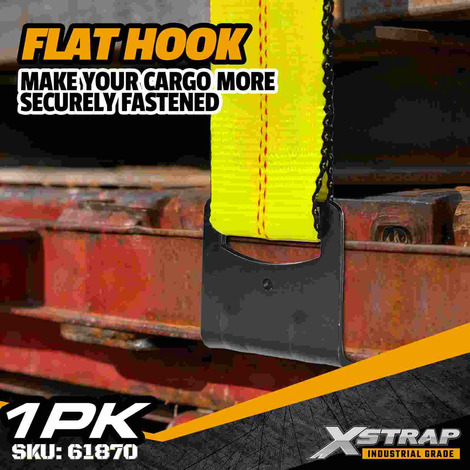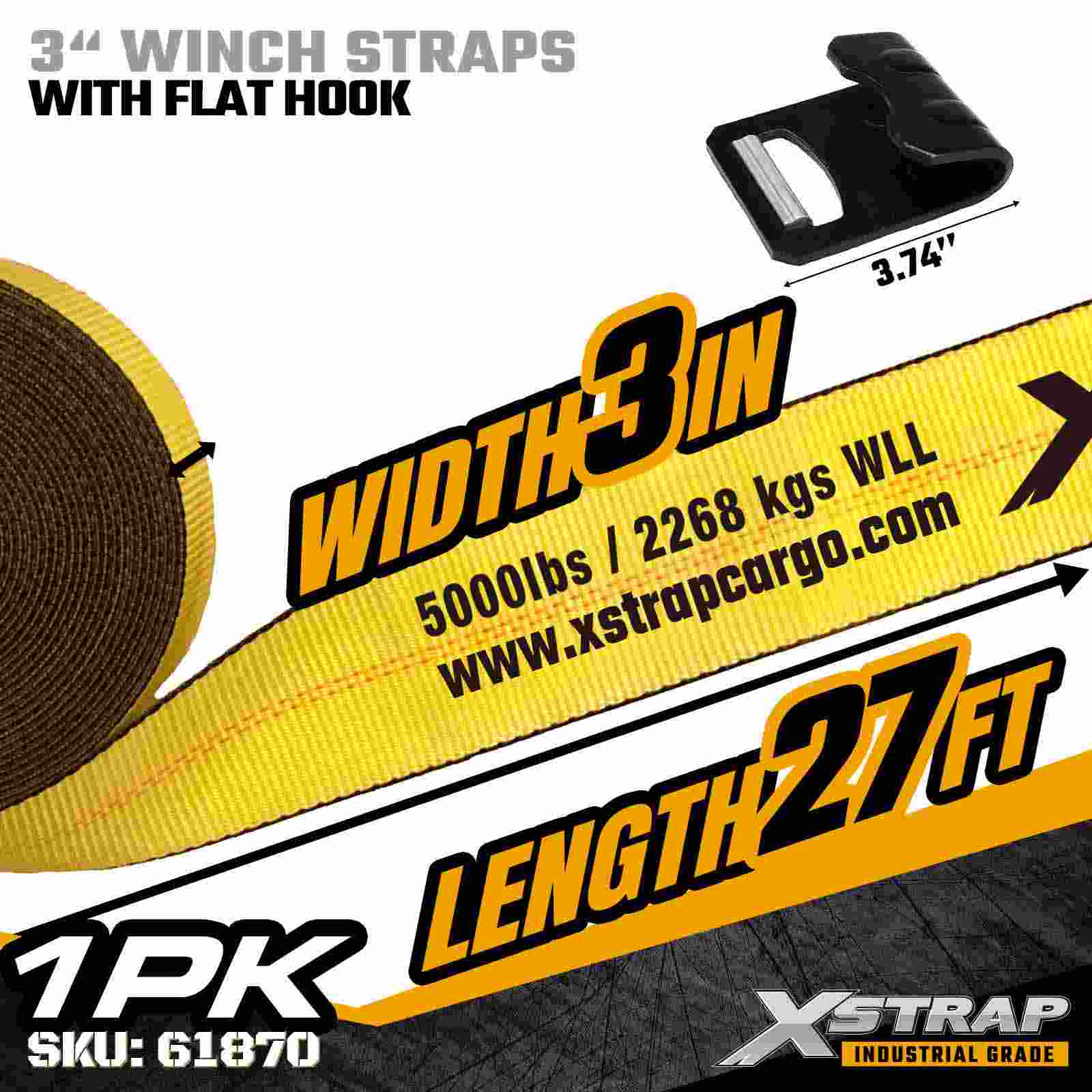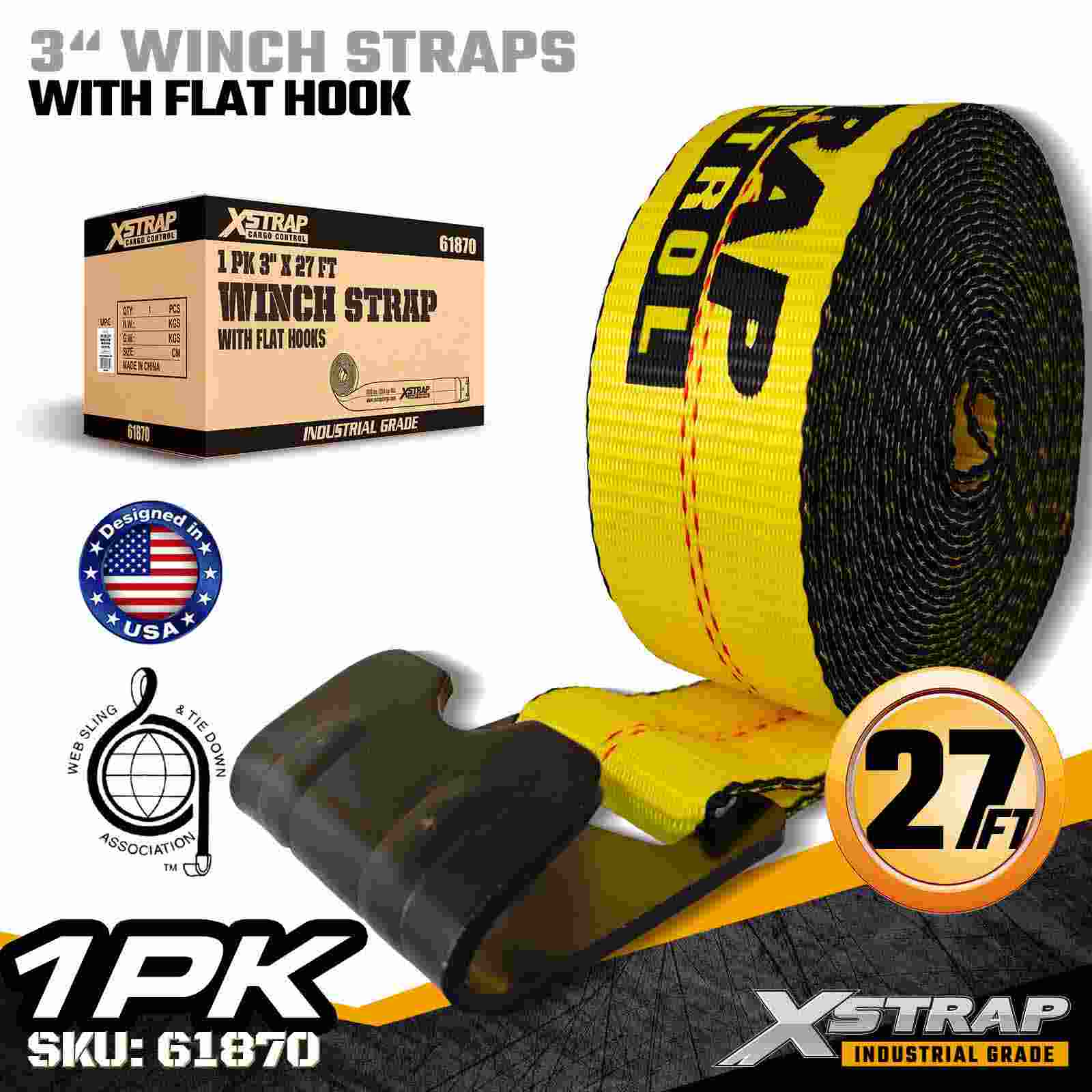 Xstrap 61870 3" × 27 jalkaa Standard Winch Strap on raskaaseen kuormankiinnityshihna, joka on suunniteltu lavaperävaunuihin ja suuren kapasiteetin kuljetuksiin. Vahvistettu Litteä koukku ja erittäin leveä 3 tuuman polyesterinauha. lbs Break Strength Se on ihanteellinen sahatavaran, teräksen, koneiden ja teollisuusrahdin kiinnittämiseen vaativien kuljetusten aikana.