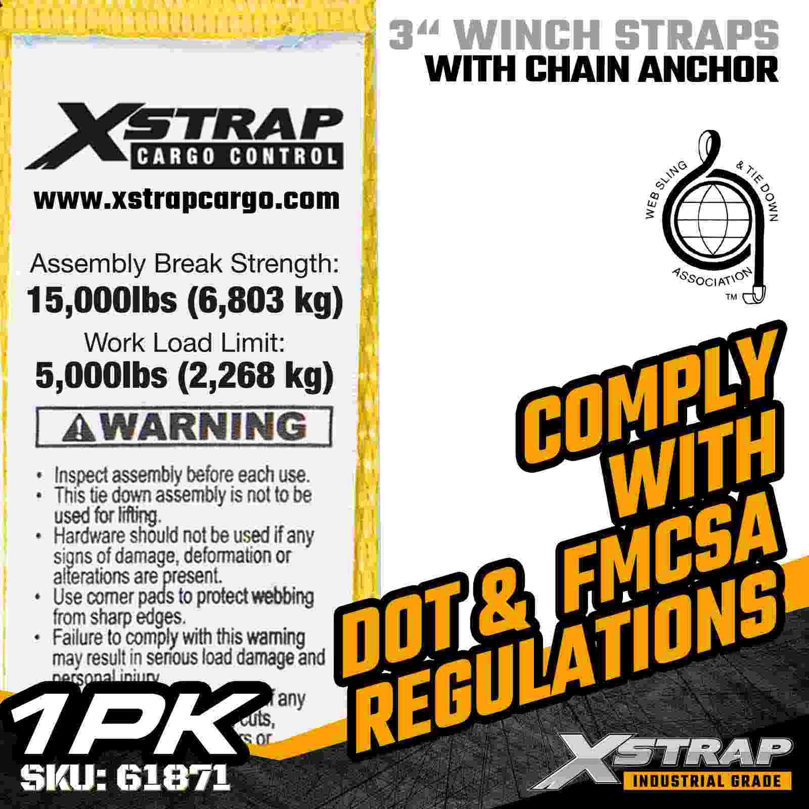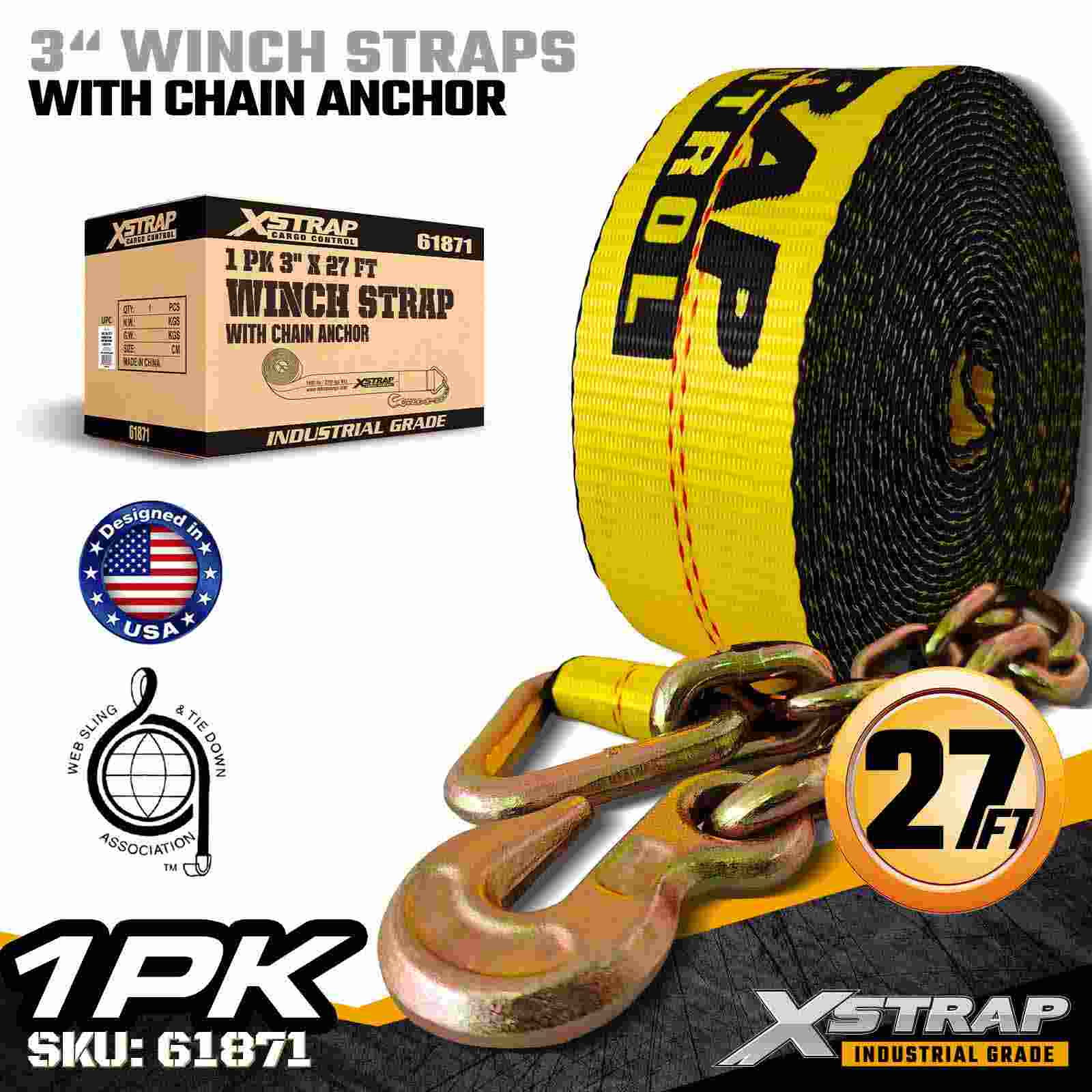 Xstrap 61871 3" × 27 jalkaa vakiovinssihihna on suunniteltu raskaaseen kuorman kiinnittämiseen lavaperävaunuissa. Taotun ketjuankkuri ja erittäin leveä 3 tuuman polyesterinauha, tämä 3 tuuman vinssihihna tarjoaa 5 000 lbrengin ja 0,0 lbt 0akl.0akl. Se on suunniteltu vaativiin teollisuussovelluksiin, joissa vaaditaan maksimaalista pitovoimaa ja vakautta.