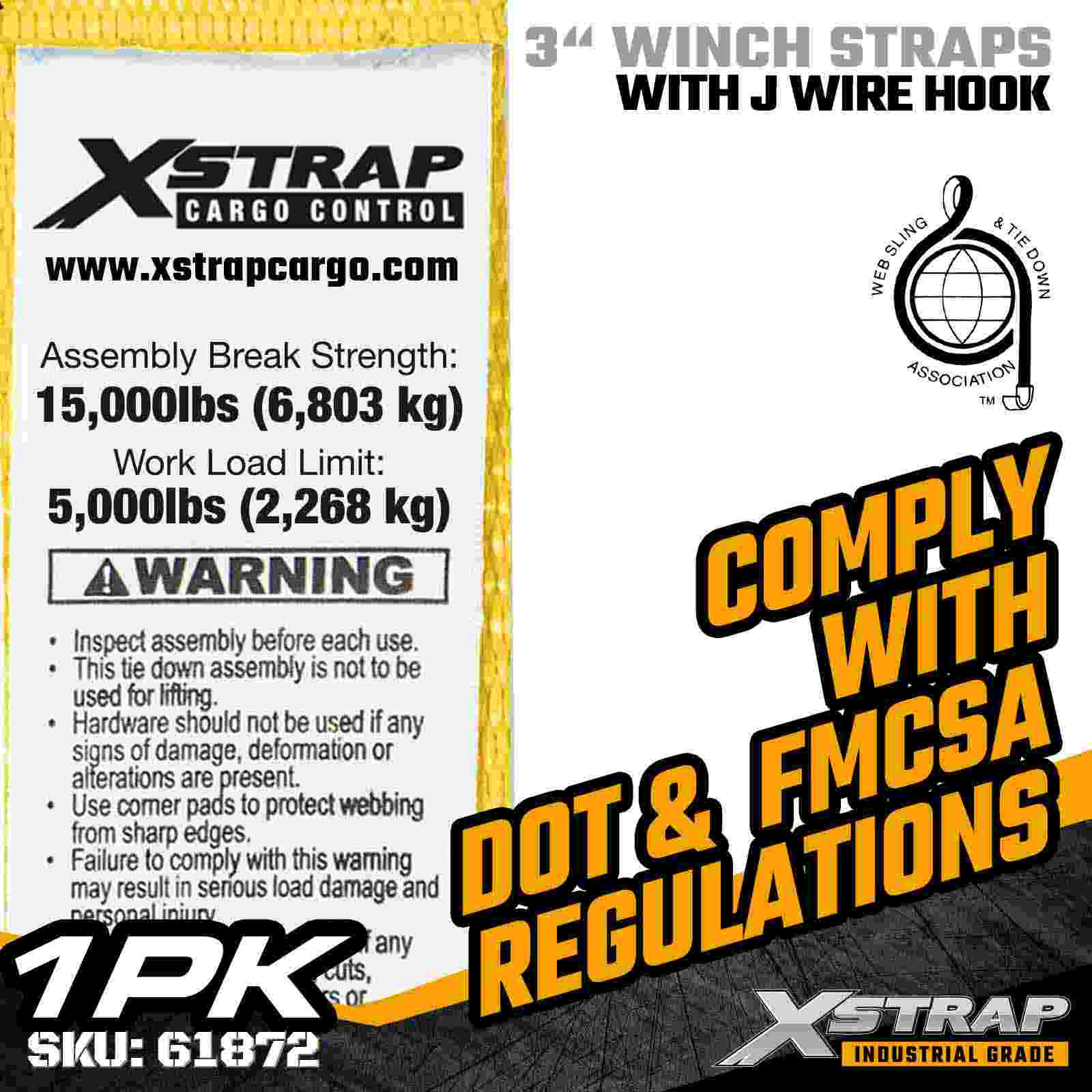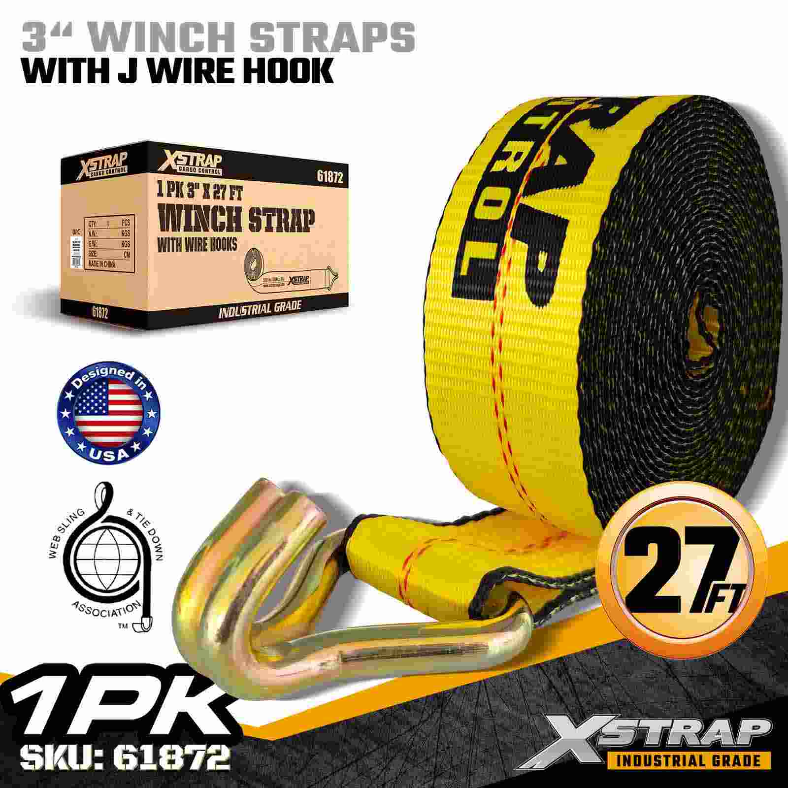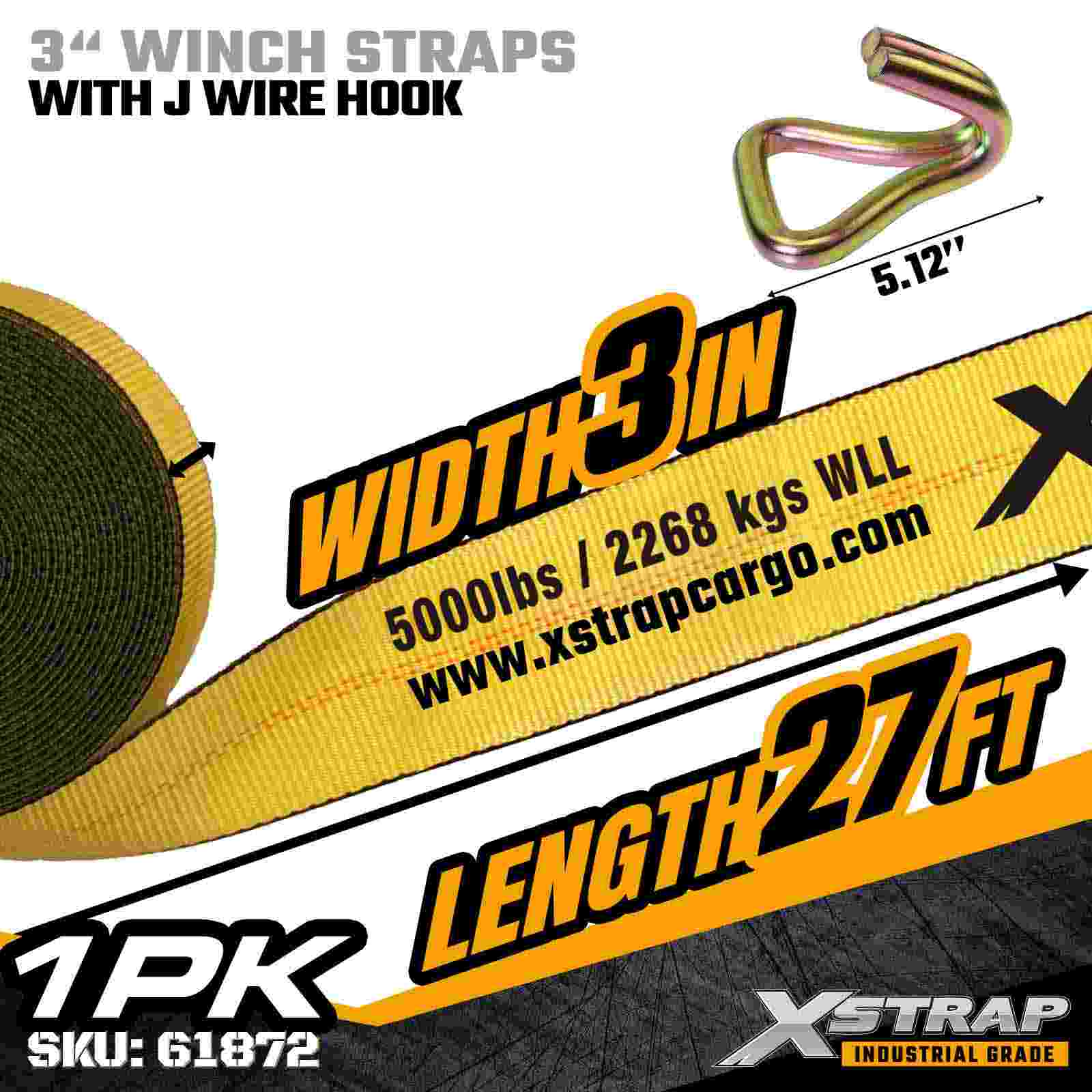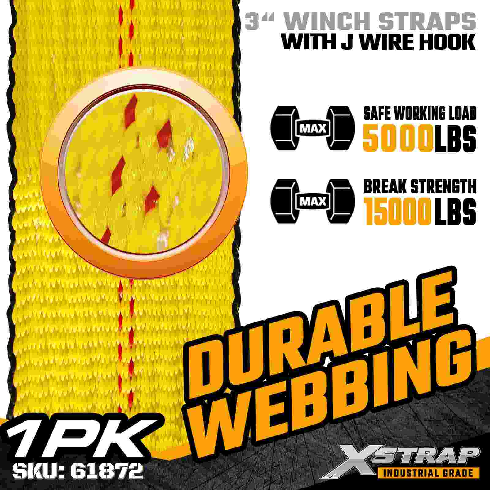 Xstrap 61872 3" × 27 jalkaa Standard Winch Strap on raskaaseen kuormankiinnitysratkaisu, joka on suunniteltu lavaperävaunuihin ja teollisuuskuljetuksiin. Vahvistetulla lankakoukulla ja erittäin leveällä 3 tuuman polyesterinauhalla varustettu 3 tuuman vinssihihna tarjoaa 5 000 Loadmits0akl ja 150 lbs0akl. Vahvuus Lanka koukku -rakenne tarjoaa joustavia kiinnitysvaihtoehtoja, mikä tekee siitä ihanteellisen käyttäjille, jotka tarvitsevat nopeita ja monipuolisia liitoskohtia päivittäisten kuljetusten aikana.