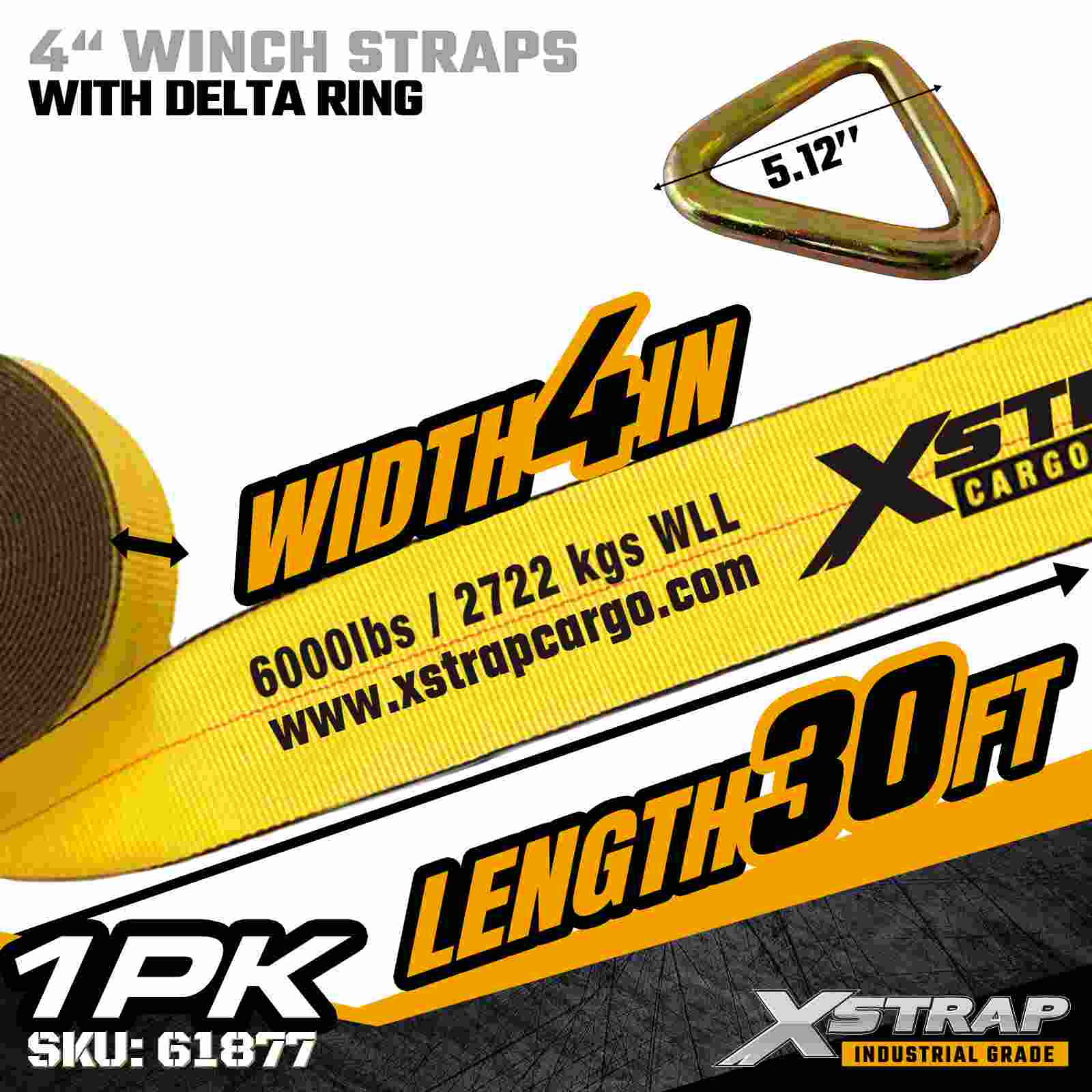 Xstrap 61877 4" × 30 jalkaa Standard Winch Strap on suurikapasiteettinen, ulottuva lastinkiinnityshihna, joka on suunniteltu lavaperävaunuihin ja ylimitoitettuihin teollisuusrahtikuljetuksiin. Vahvistettu Delta rengas ja ultraleveä 4 tuuman polyesterinauha. 18 000 lbs murtolujuus Jatkettu 30 jalkaa lisää ulottuvuutta, mikä tekee siitä ihanteellisen leveiden, korkeiden tai epäsäännöllisen muotoisten kuormien kiinnittämiseen, jotka vaativat monisuuntaista ankkurointia ja parempaa vakautta.