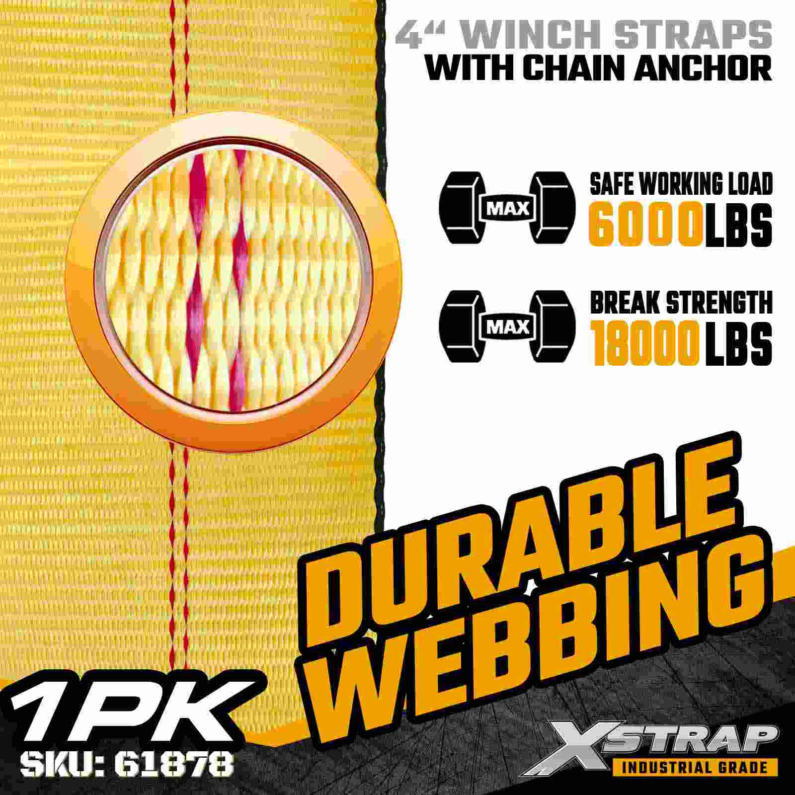 Xstrap 61878 4" × 27 jalkaa Standard Winch Strap on raskaaseen kuormankiinnityshihna, joka on suunniteltu lavaperävaunuihin ja äärimmäisiin kuormitusolosuhteisiin. Taotulla ketjuankkurilla ja ultraleveällä 4 tuuman polyesterinauhalla, tämä 4 tuuman vinssihihna tarjoaa 6 000 ja Li001,001,001 000 000 l/0000 työvoiman. lbs Break Strength Ketjuankkurirakenne tarjoaa vertaansa vailla olevan pidon ja kestävyyden, mikä tekee siitä ihanteellisen teräksen, koneiden ja muiden korkean jännityksen rahdin kiinnittämiseen.