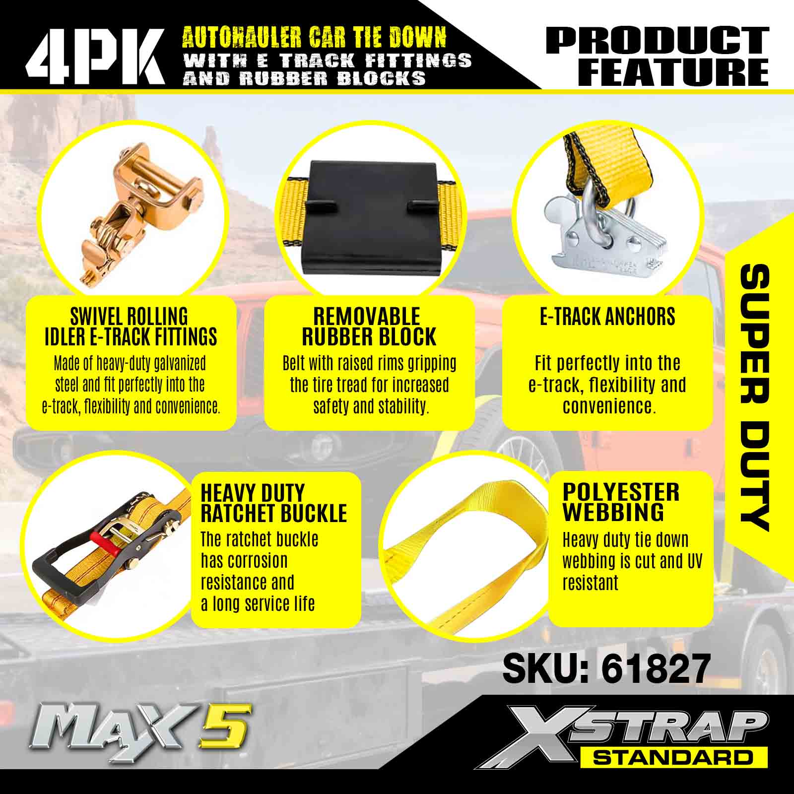 - Heavy Duty Hardware: Sisältää korroosionkestävät räikkäsoljet ja tukevat E-track-ankkurit, jotka varmistavat turvallisen ja kestävän kiinnityksen kaikkiin raskaan auton kuljetusvaatimuksiin