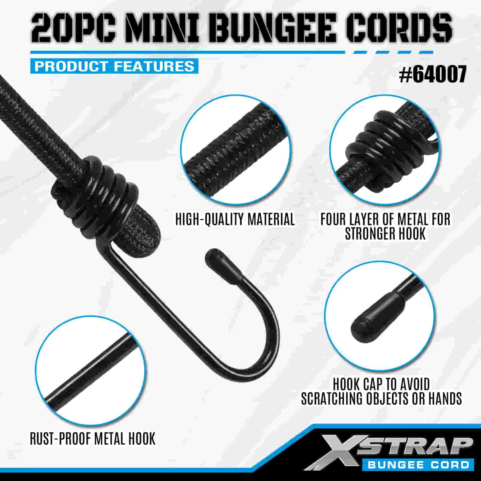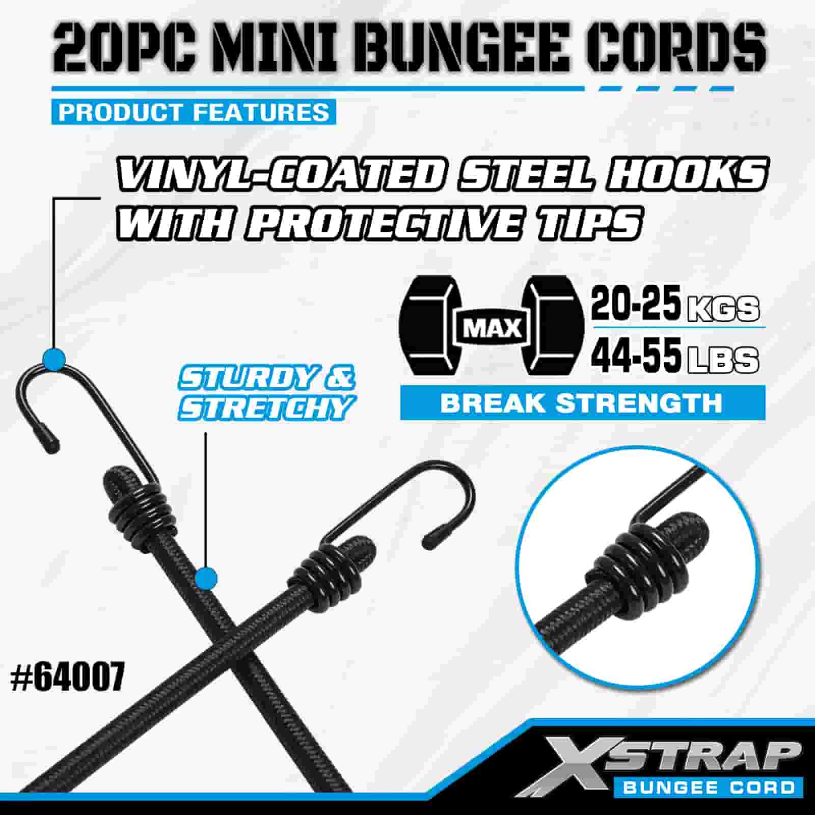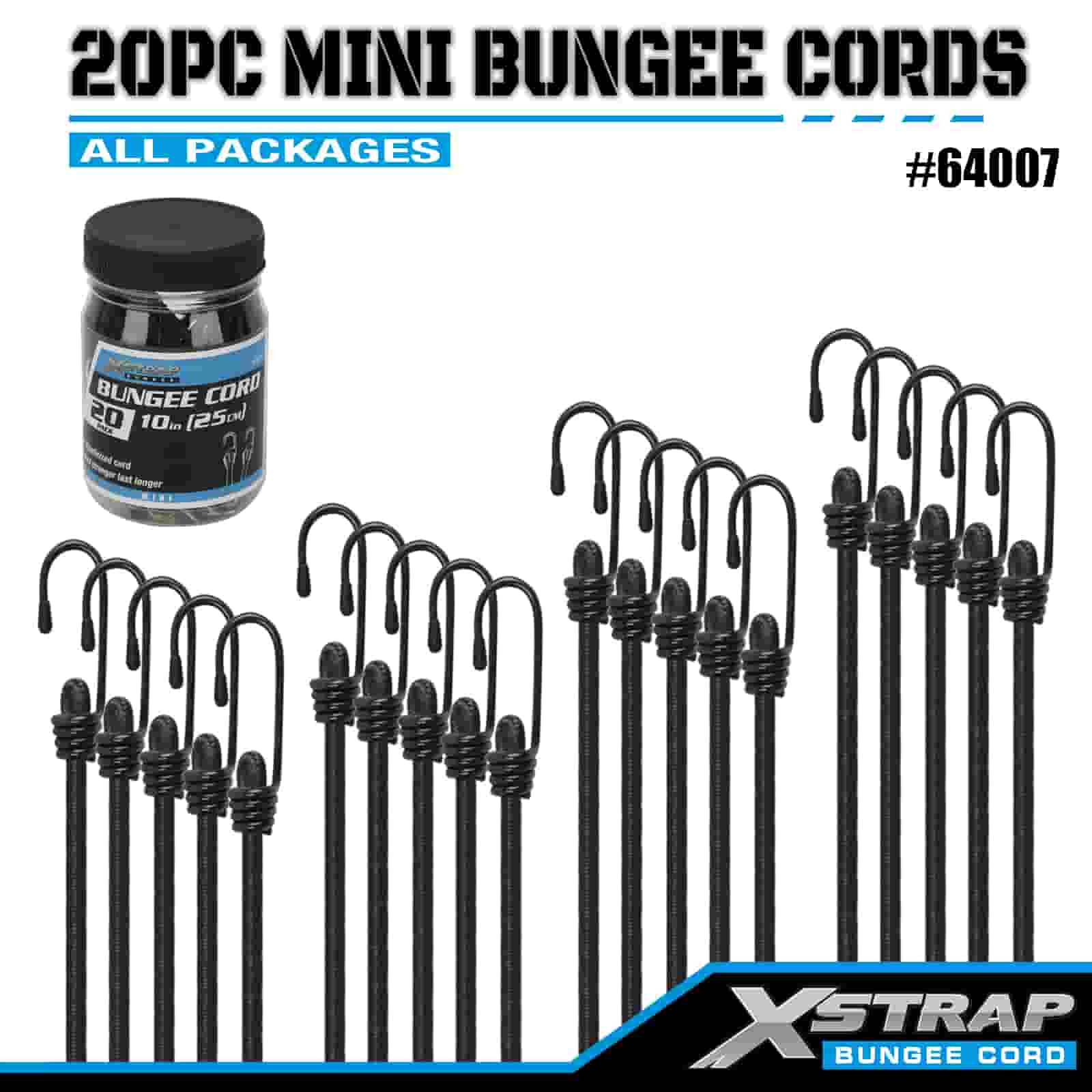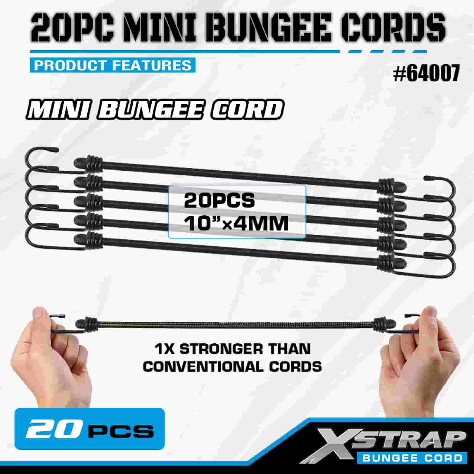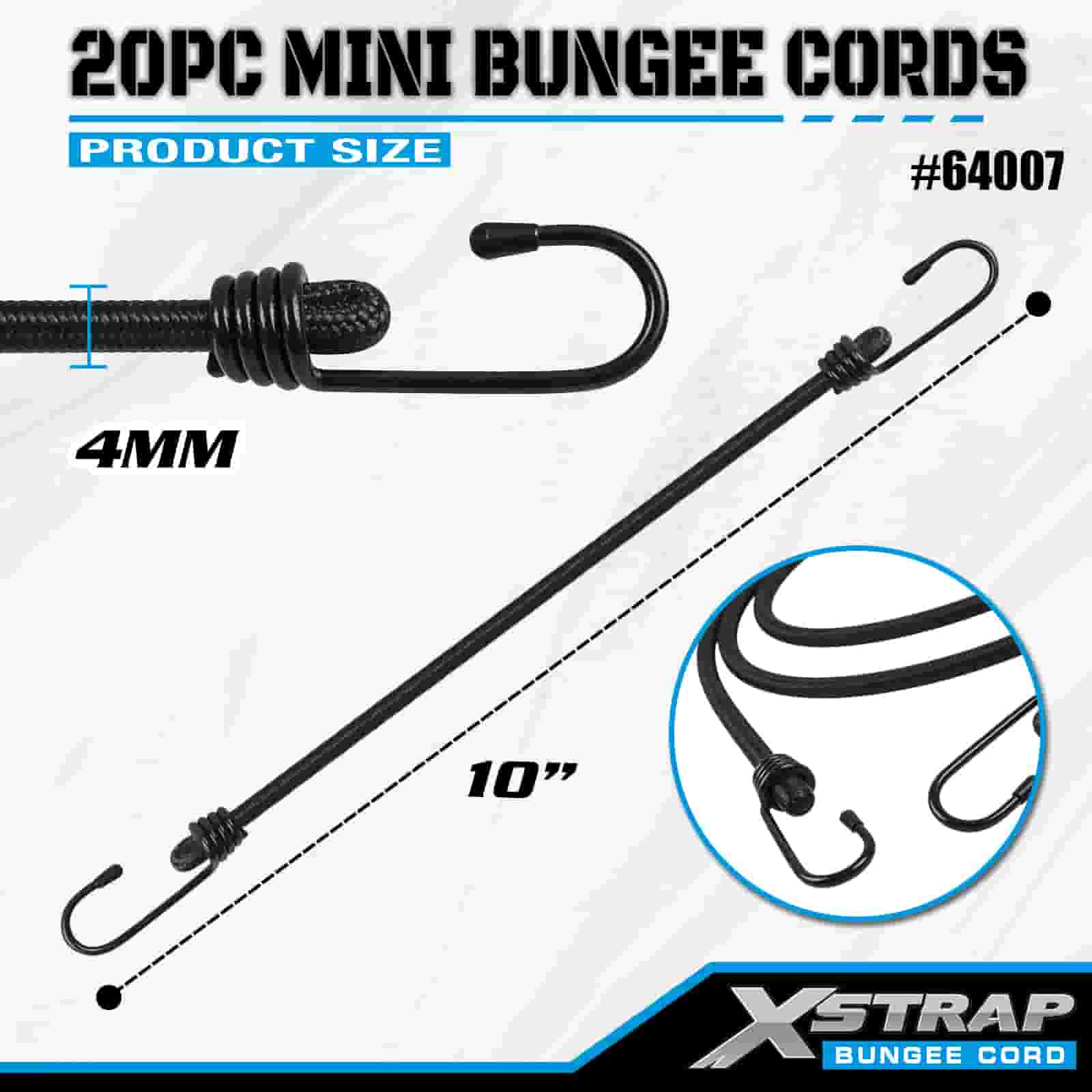 Xstrap 20PK MINI Bungee -johdot 4 mm x 10", 44-55 lbs murtolujuus teräskoukuilla, joissa on suojakärjet ja vakiojousikoukut.
