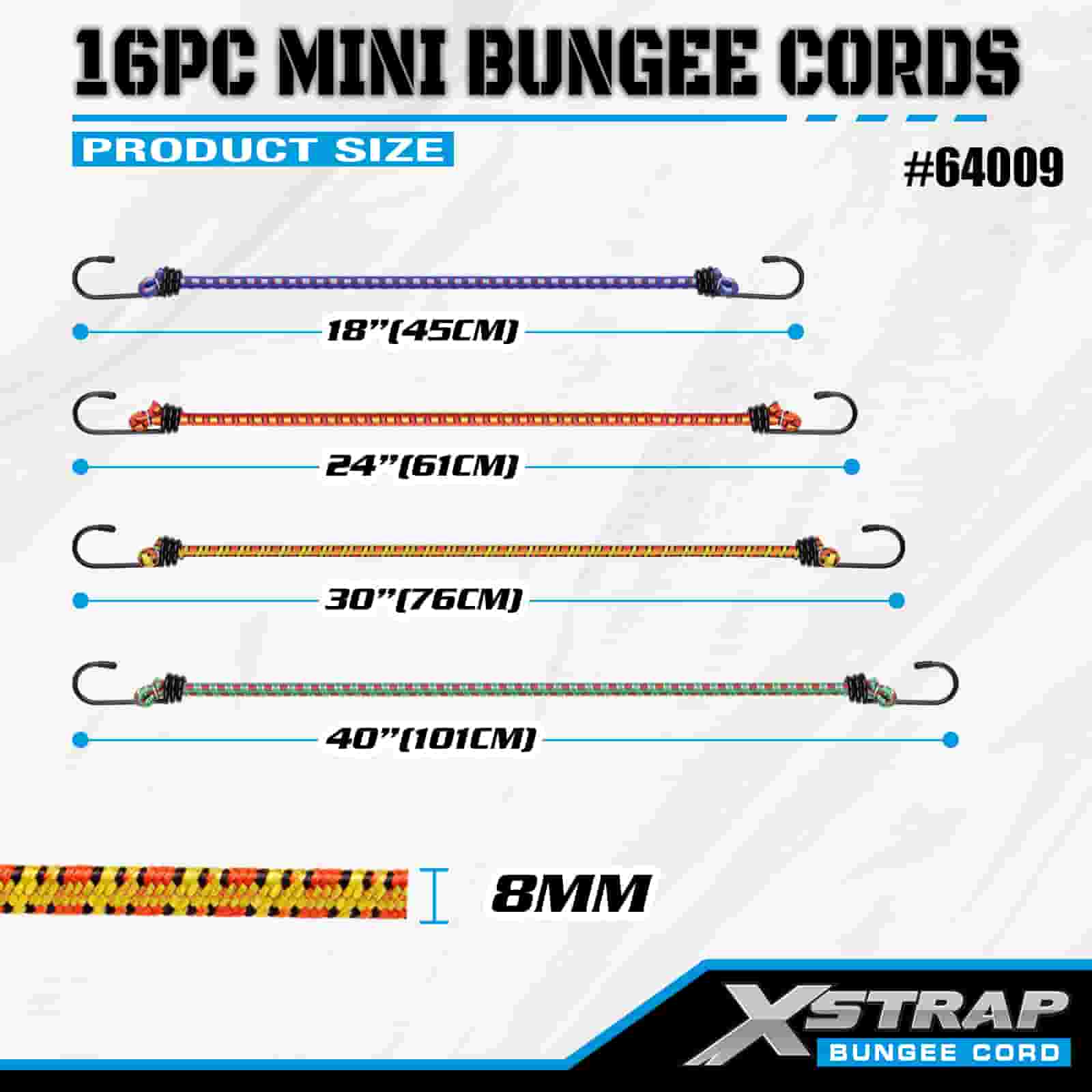 Xstrap 16PK Bungee-johdot 8 mm x 18”/24” /30”/40”, 44–55 lbs murtolujuus teräskoukuilla, joissa on suojakärjet ja vakiojousikoukut.