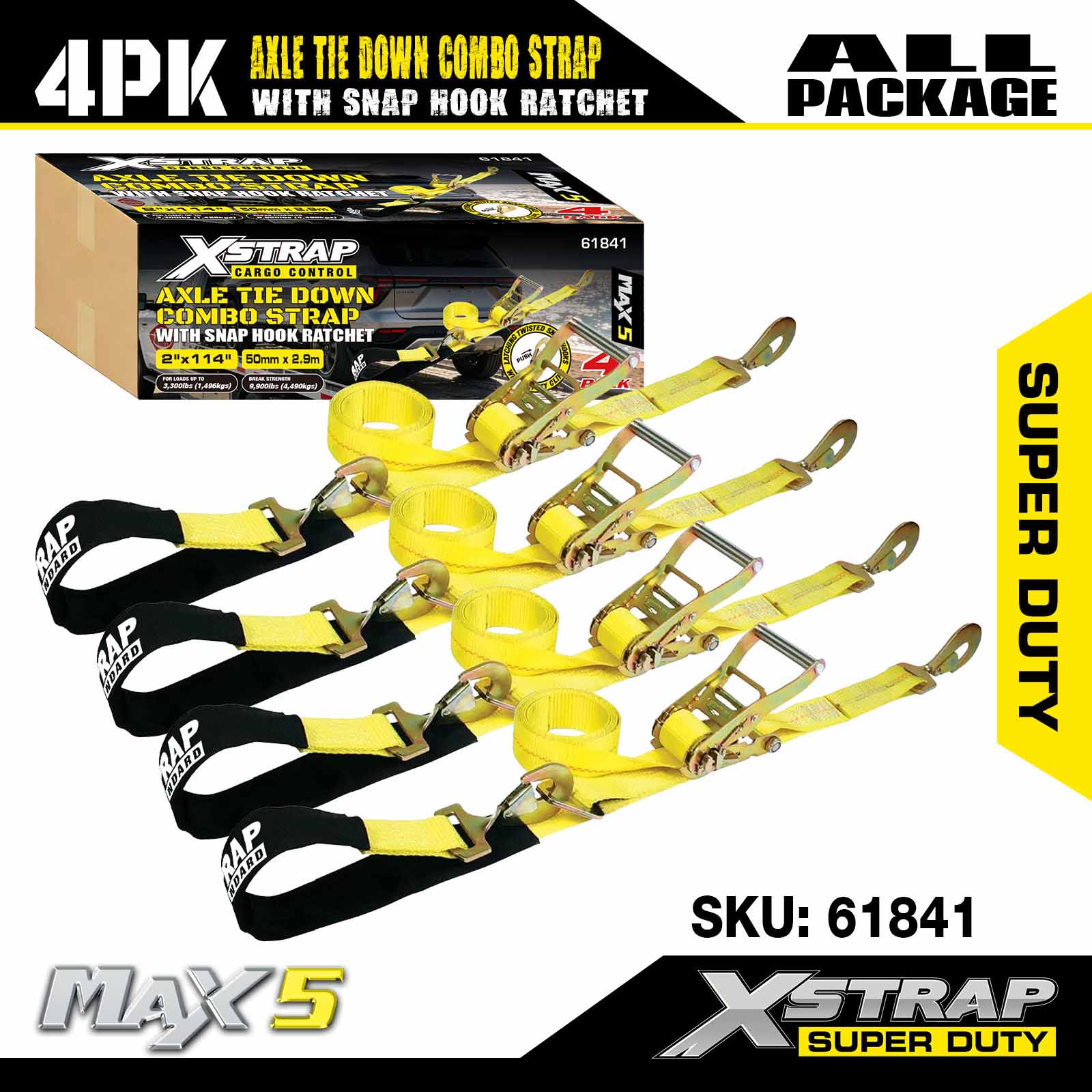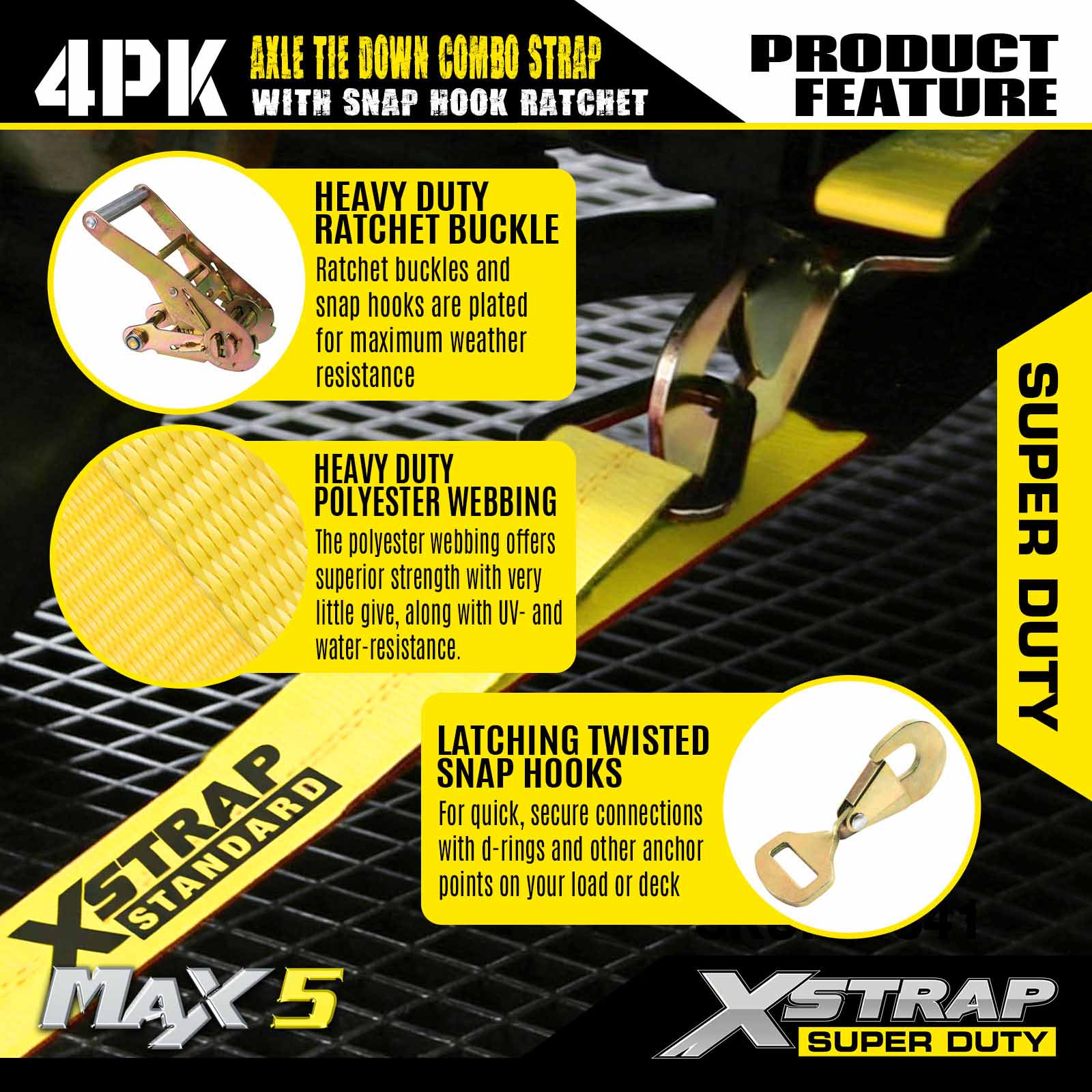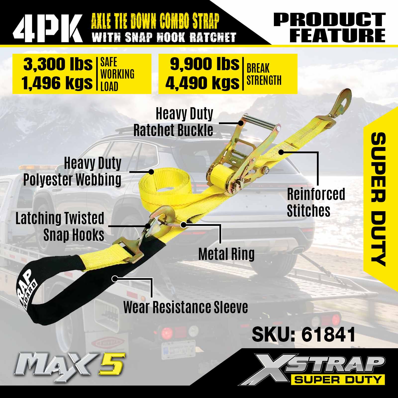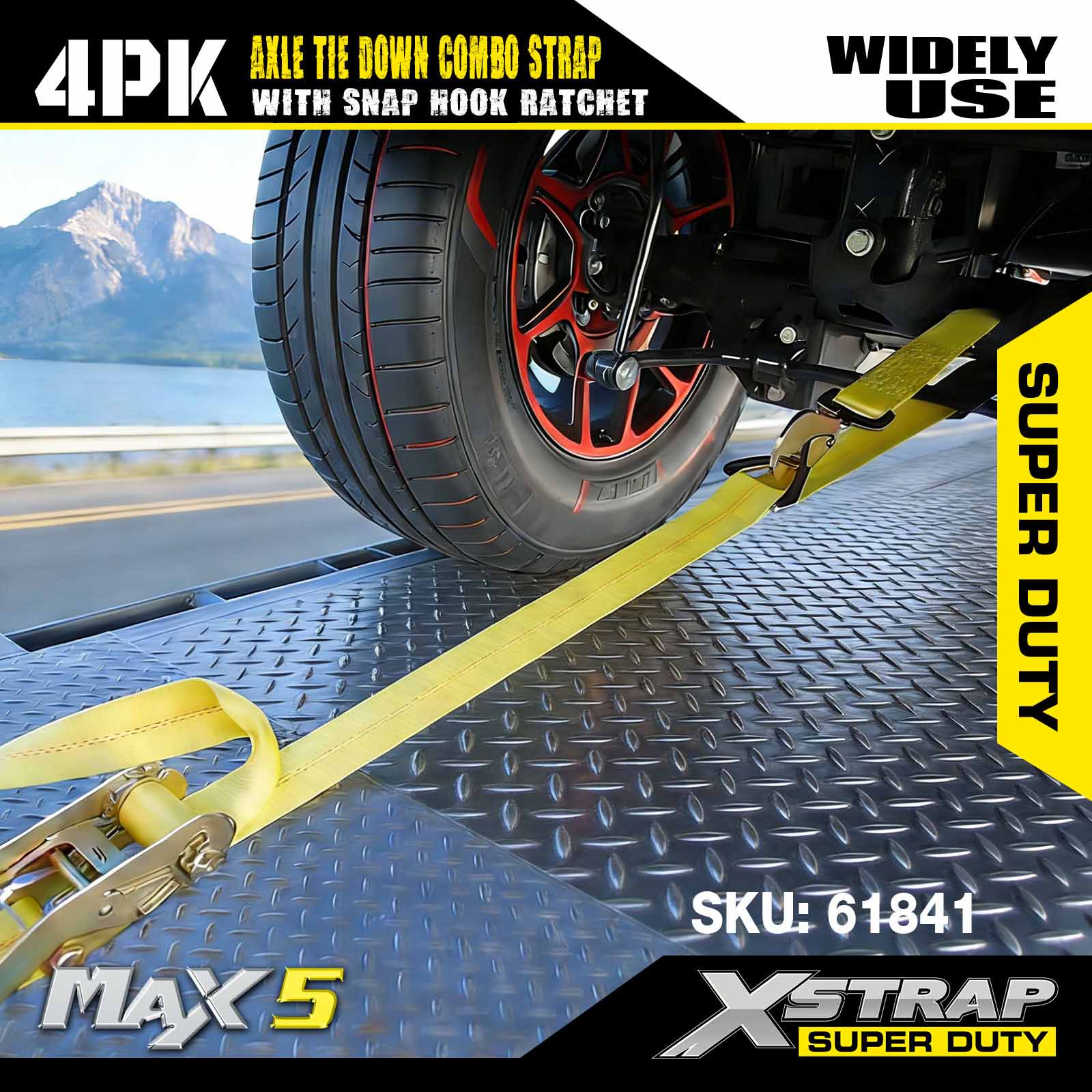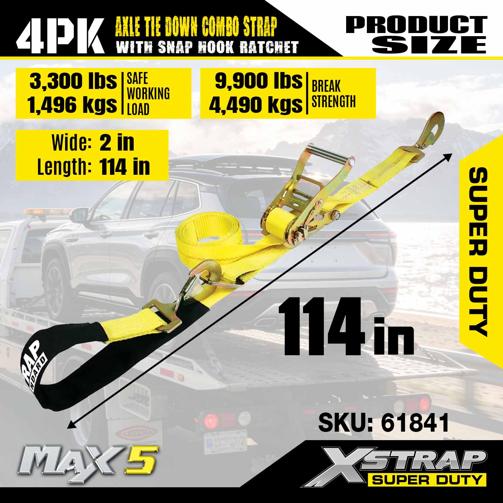 - 4 Pack 114” AxleStraps: Monipuolista lasso-automaattisidontaa käytetään kuljetettavan ajoneuvon vanteiden läpi, ja ne voidaan myös kiinnittää mihin tahansa kiinteään pyörän, akselin tai rungon osaan.