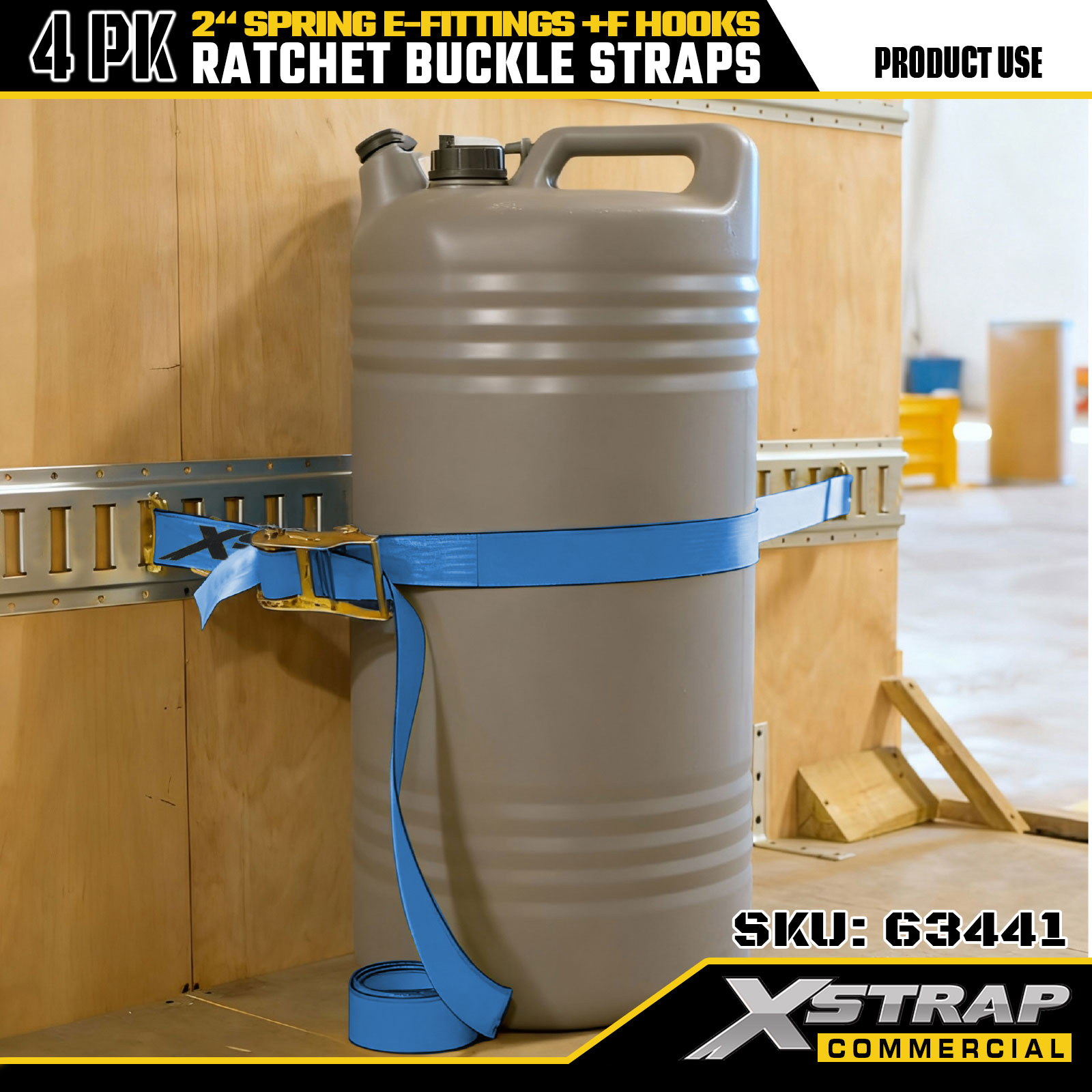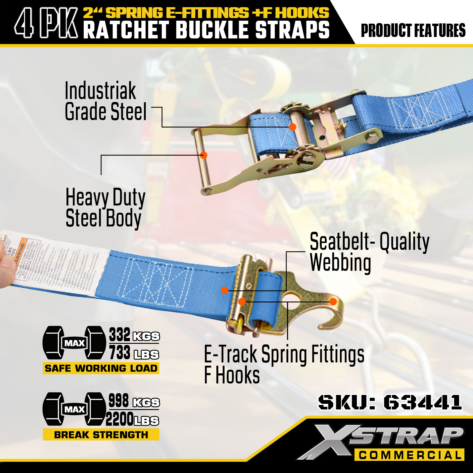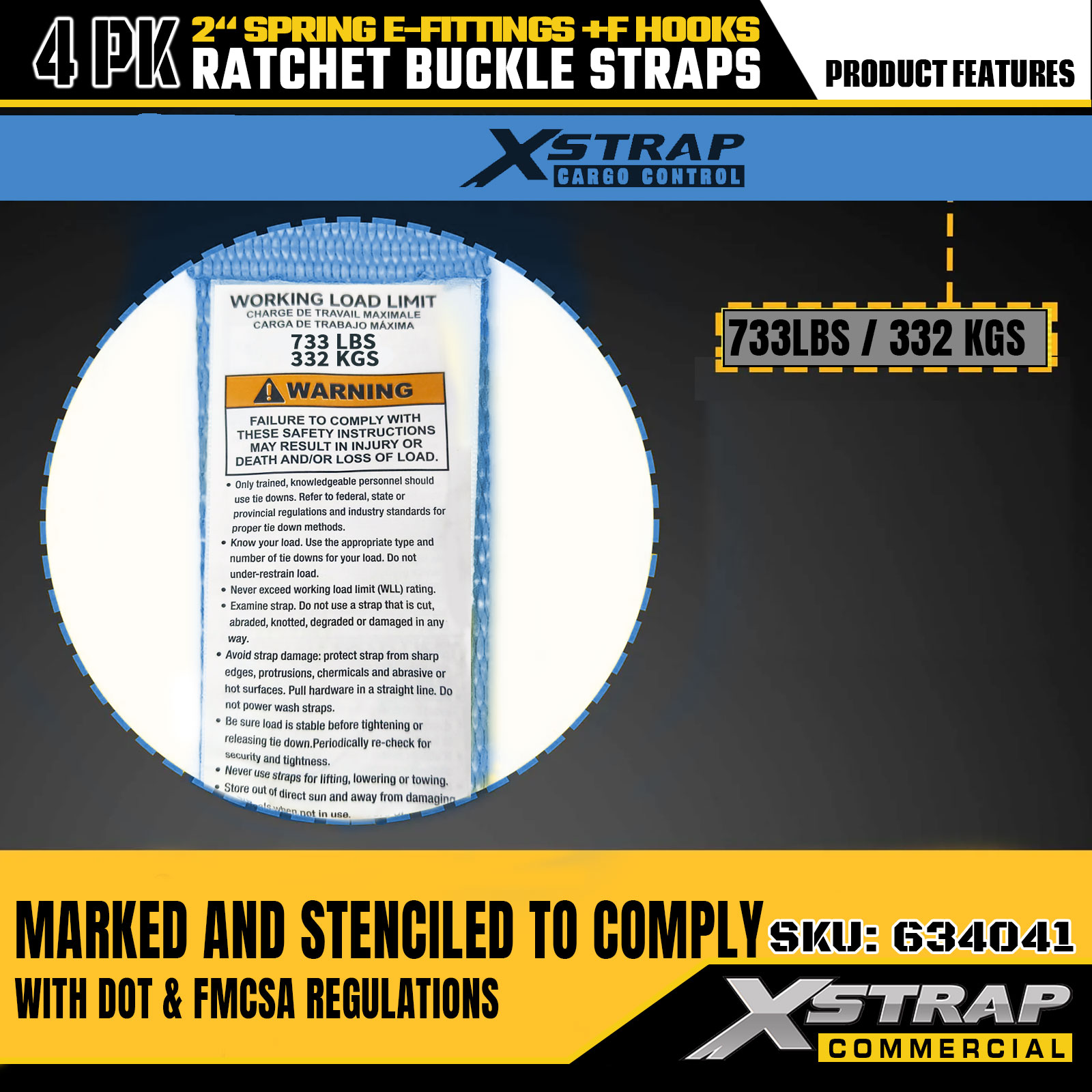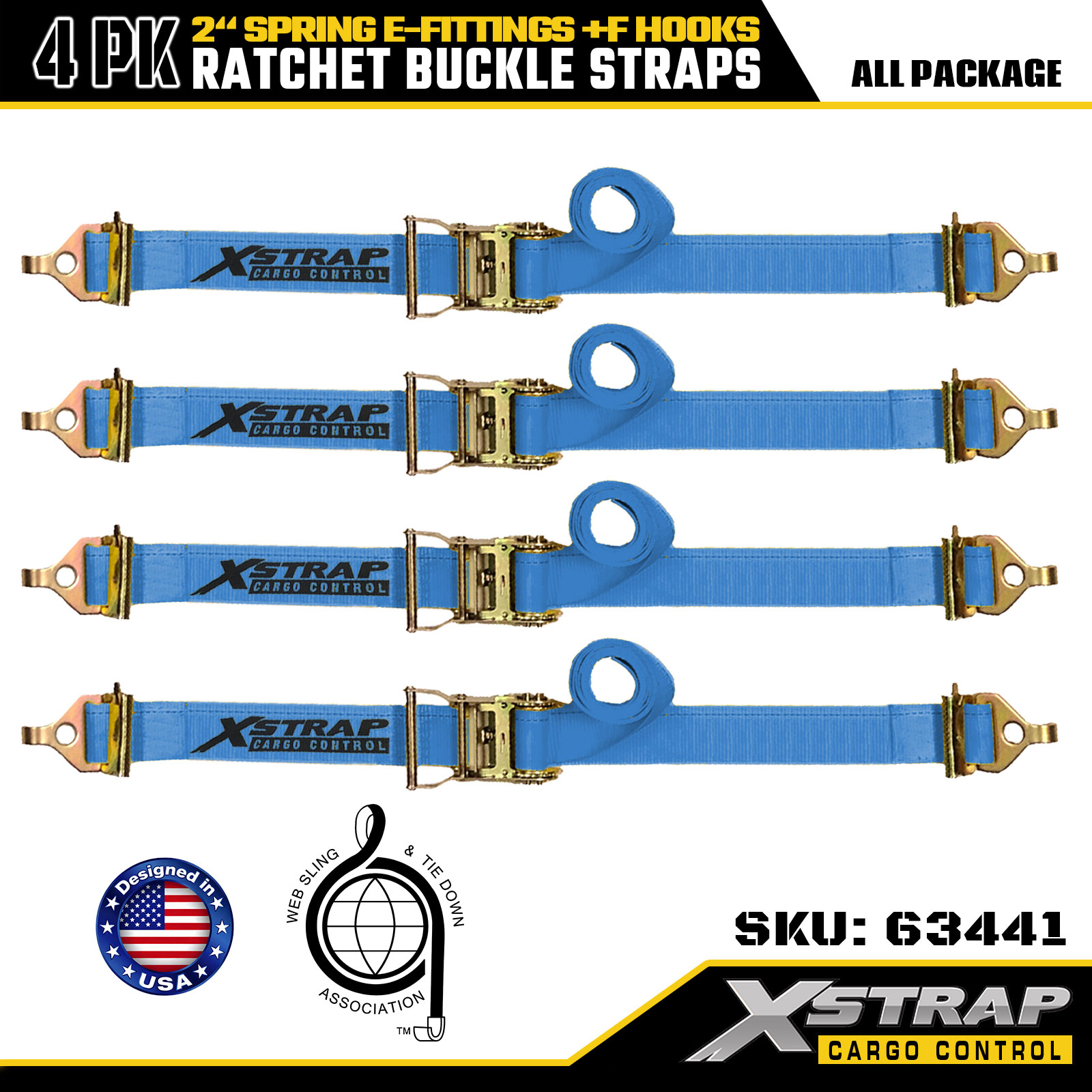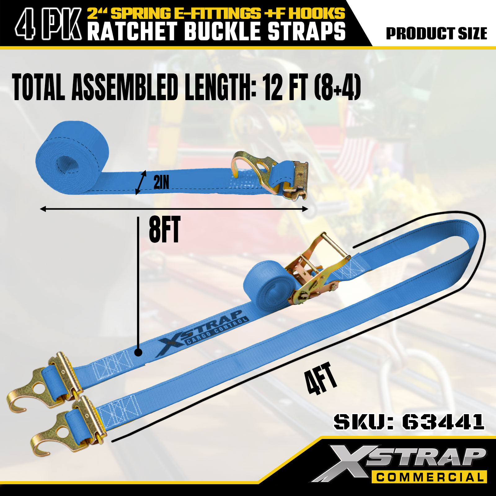Xstrap 4 Pack Räikkä sidottavat hihnat 2" x 12" polyesteri jousilla E-liittimillä ja F-koukkuilla, 733 lbs SWL & 332 lbs murtolujuus kuorma-autoihin, liikkumiseen ja yleiseen rahtikuljetukseen