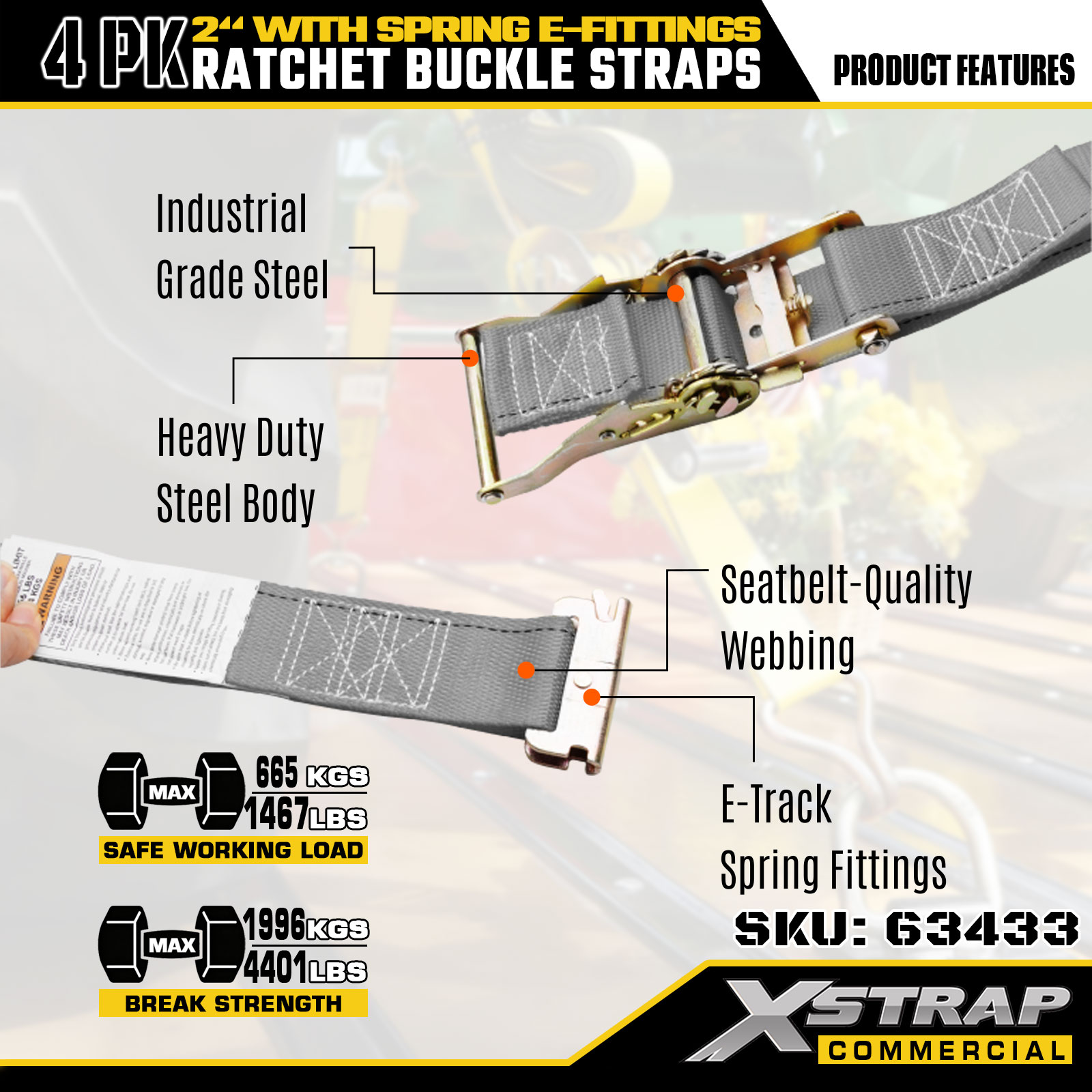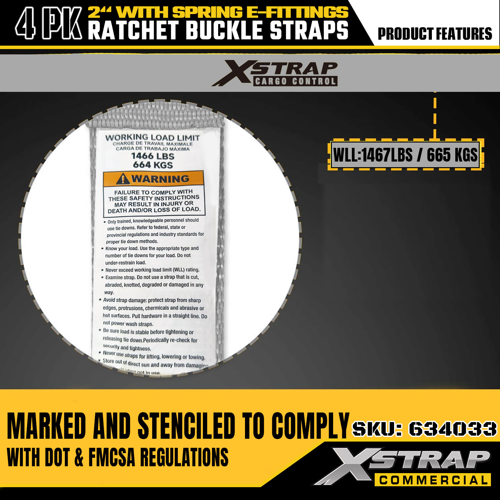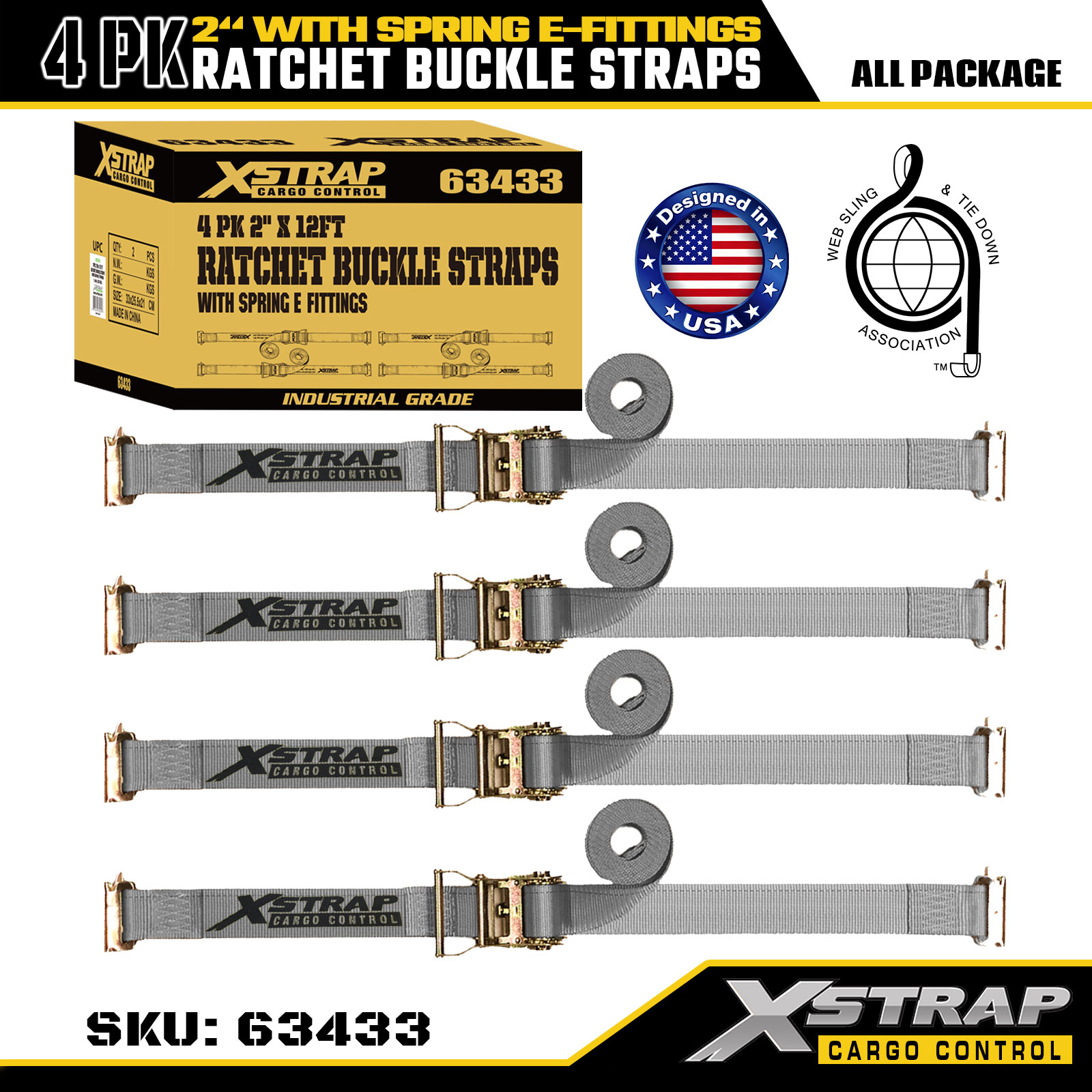 Xstrap 4 Pack Räikkäkiinnityshihnat, 2" x 16" polyesterilastin kiinnityshihnat, 1467 paunaa turvallinen työkuorma ja 4401 paunaa murtolujuus, metalliset E-koukut kuorma-autoille, ruohonleikkureille ja mönkijöille2. Tuotetiedot: