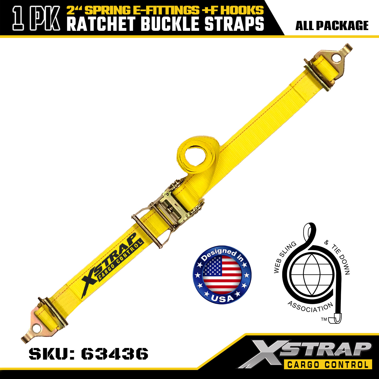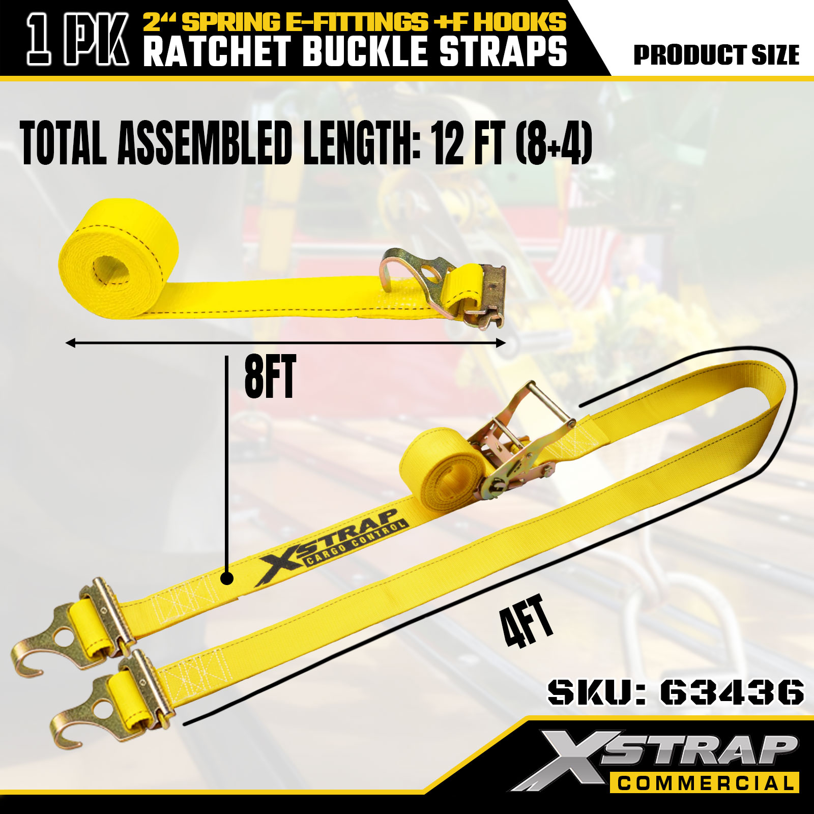 Xstrap 1-pack solmittavat räikkähihnat, 2" x 12" Heavy Duty lastin kiinnitysjouset E-liittimet ja F-koukut (keltainen), 733 lbs kapasiteetti perävaunuihin, kuorma-autoihin, pakettiautoihin ja moottoripyörien kiinnitykseen