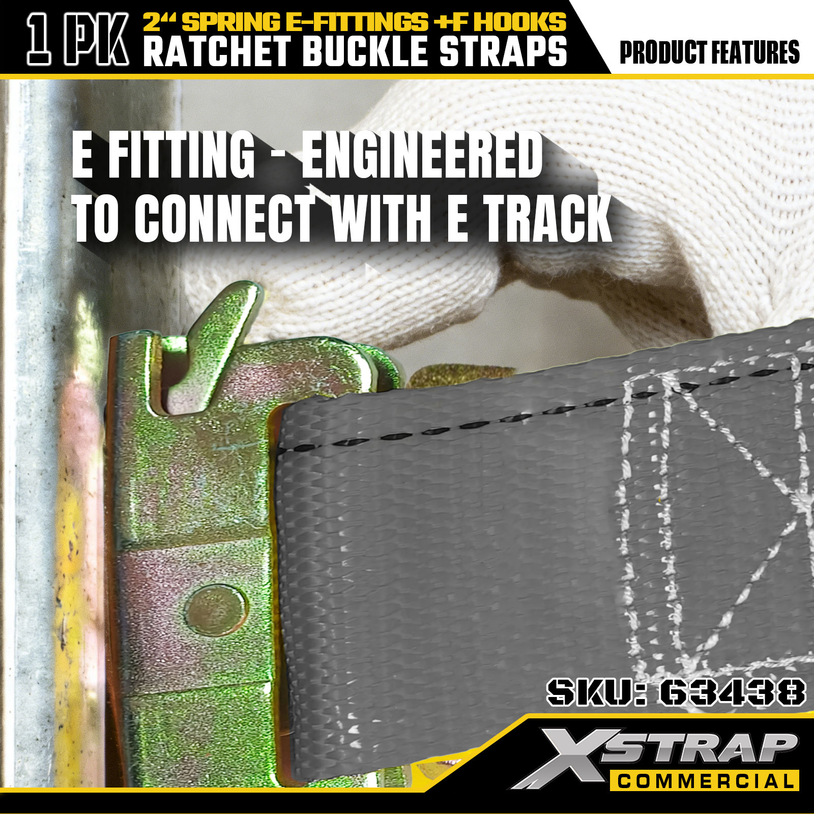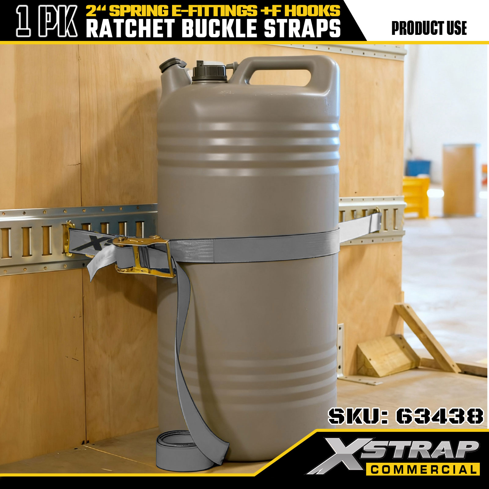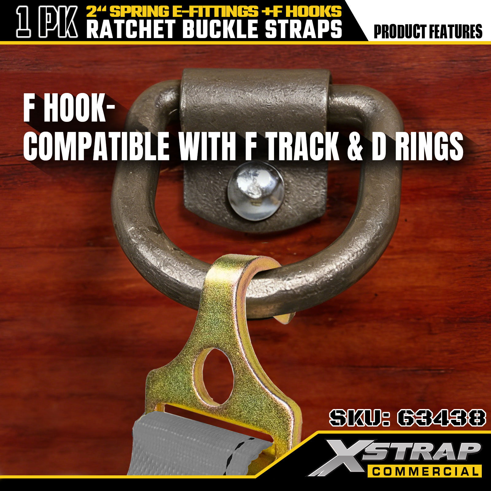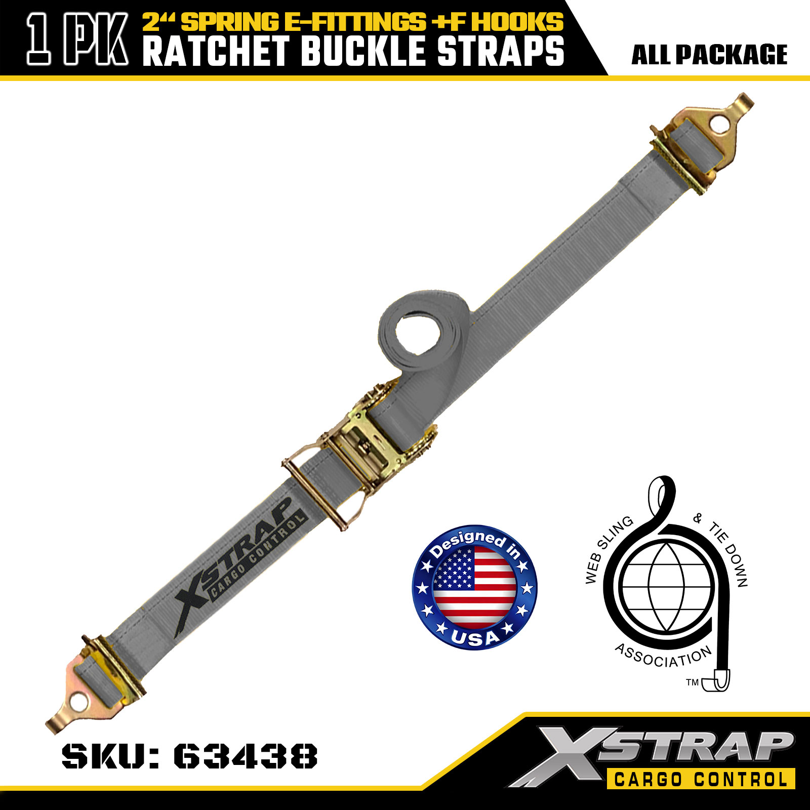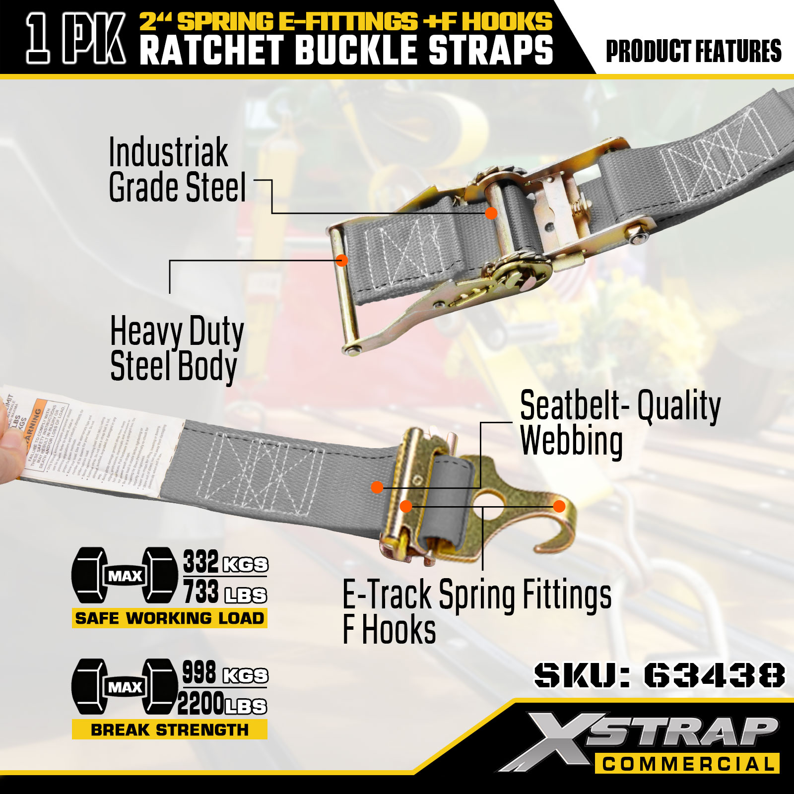 Xstrap 1 Pack Ratchet Kiinnitettävät hihnat 2" x 16" Polyesteri jousilla E-liittimillä ja F-koukkuilla, 733 lbs SWL & 332 lbs murtolujuus kuorma-autoihin, liikkumiseen ja yleiseen tavarakuljetukseen