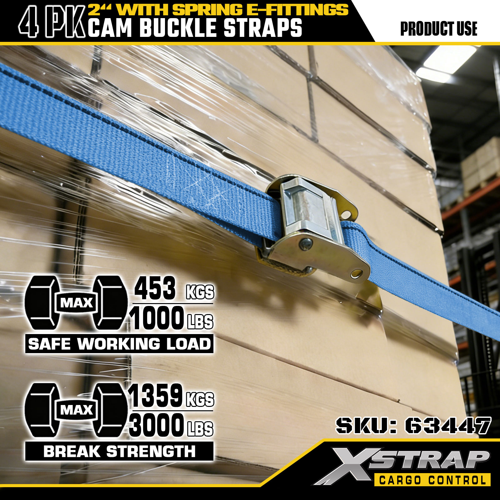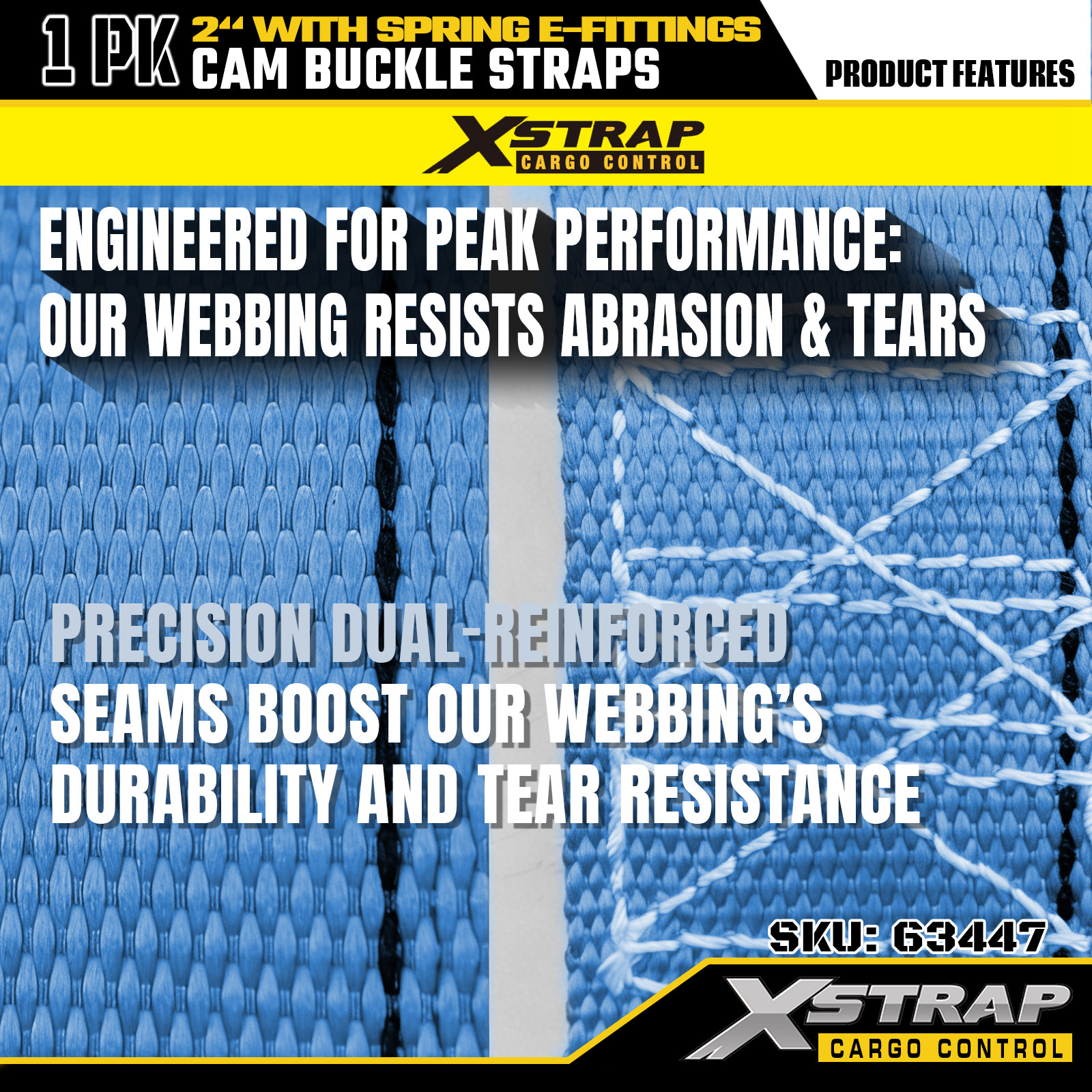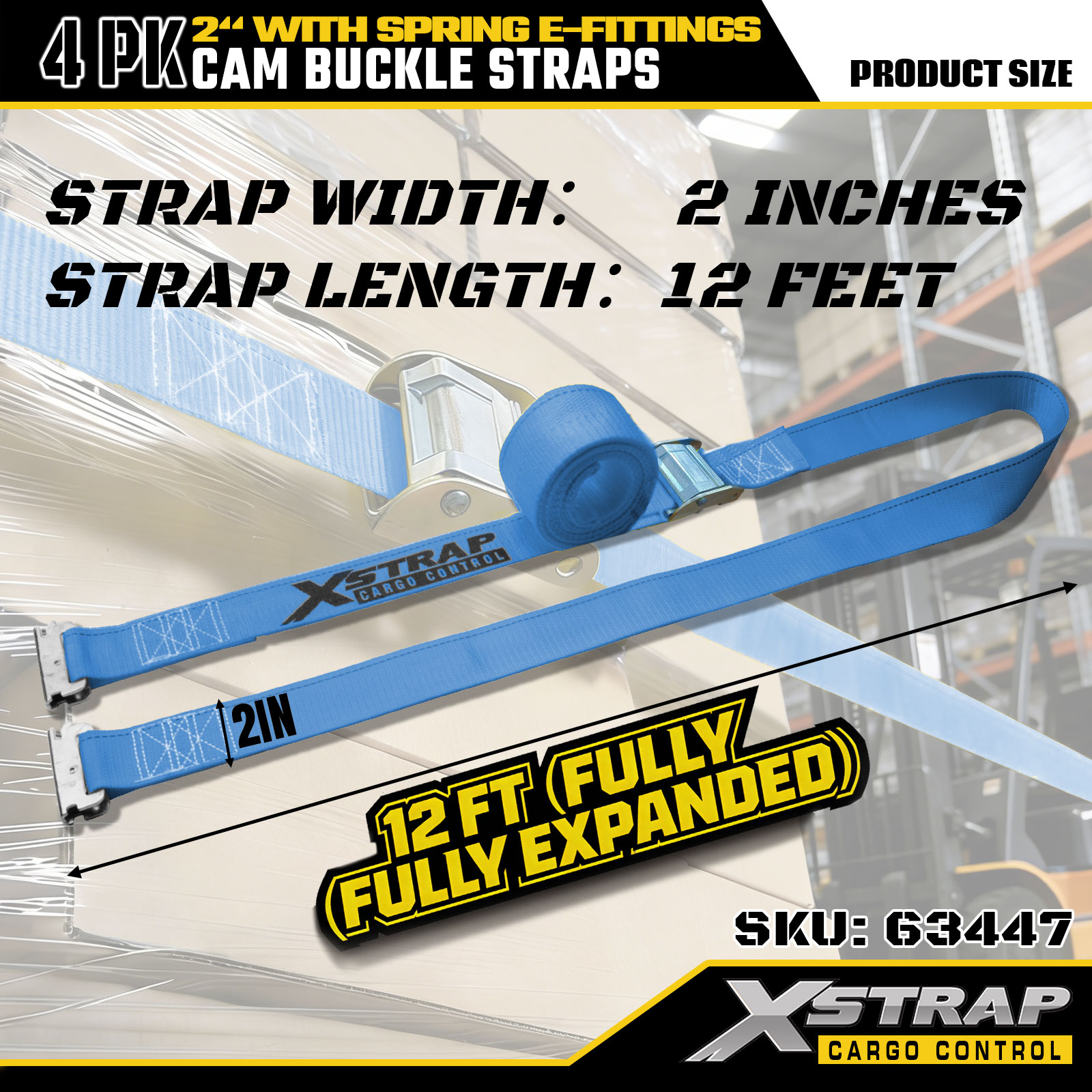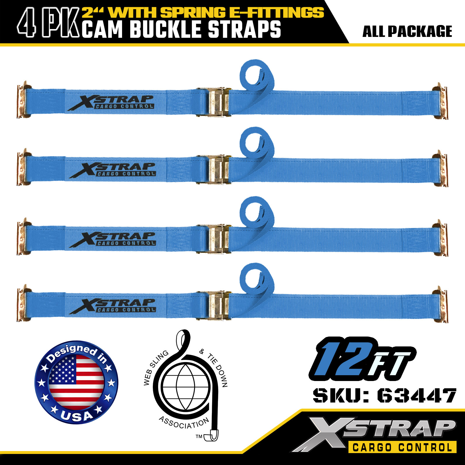 Xstrap 63447 4 pakkaus 2" x 12" siniset räikkähihnat jousilla E-liittimillä ja F-koukuilla, 733 lbs SWL & 332 lbs murtolujuus lastin hallintaan, liikkumiseen ja kuljetukseen