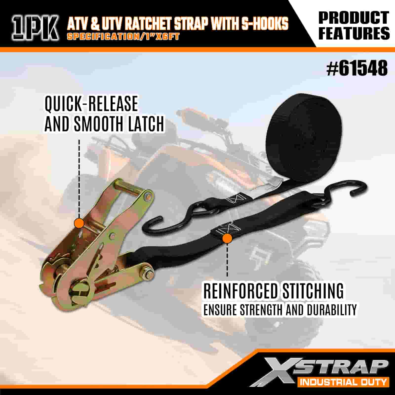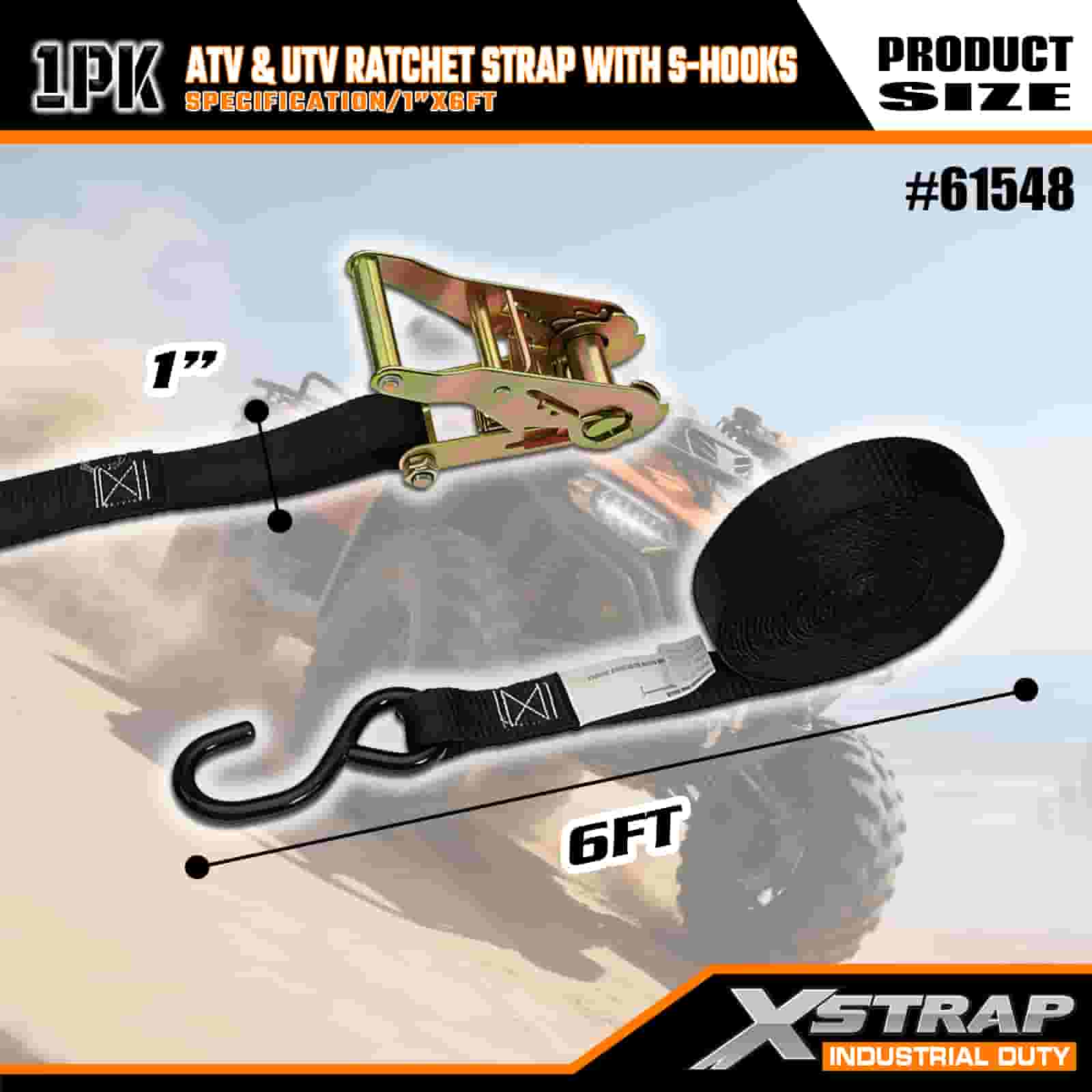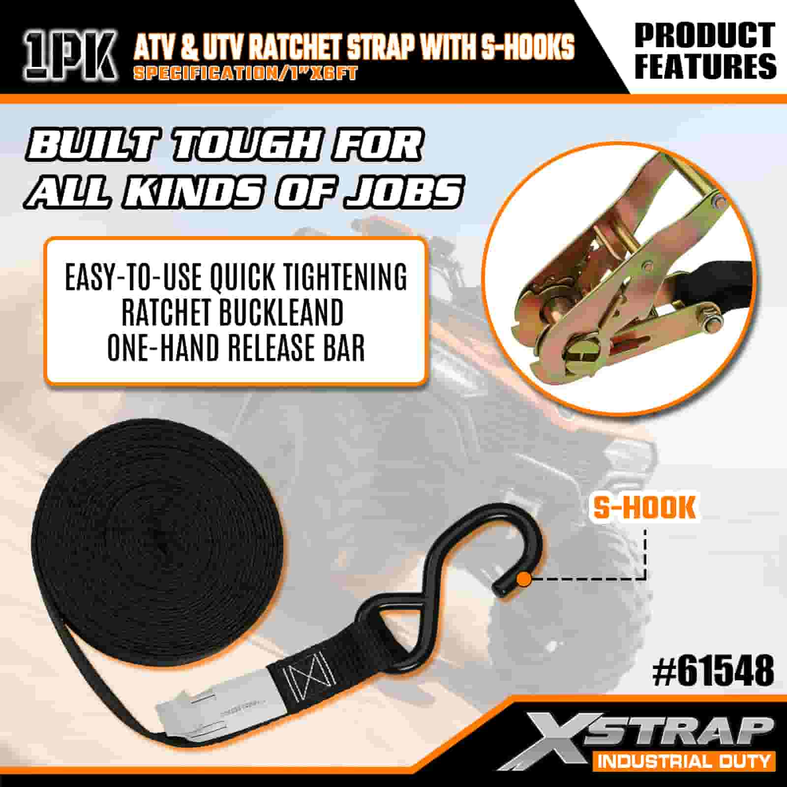 Xstrap ATV- ja AUV-räikkähihna S-koukuilla, 1 x 6 tuumainen polyesterisidontahihna, räikkähihna, 833 lbs:n kuormankiinnityshihnat S-koukuilla perävaunuun, peräkärryyn tarkoitettuun hiihtoveneeseen, pieniin autoihin, raskaisiin varusteisiin.