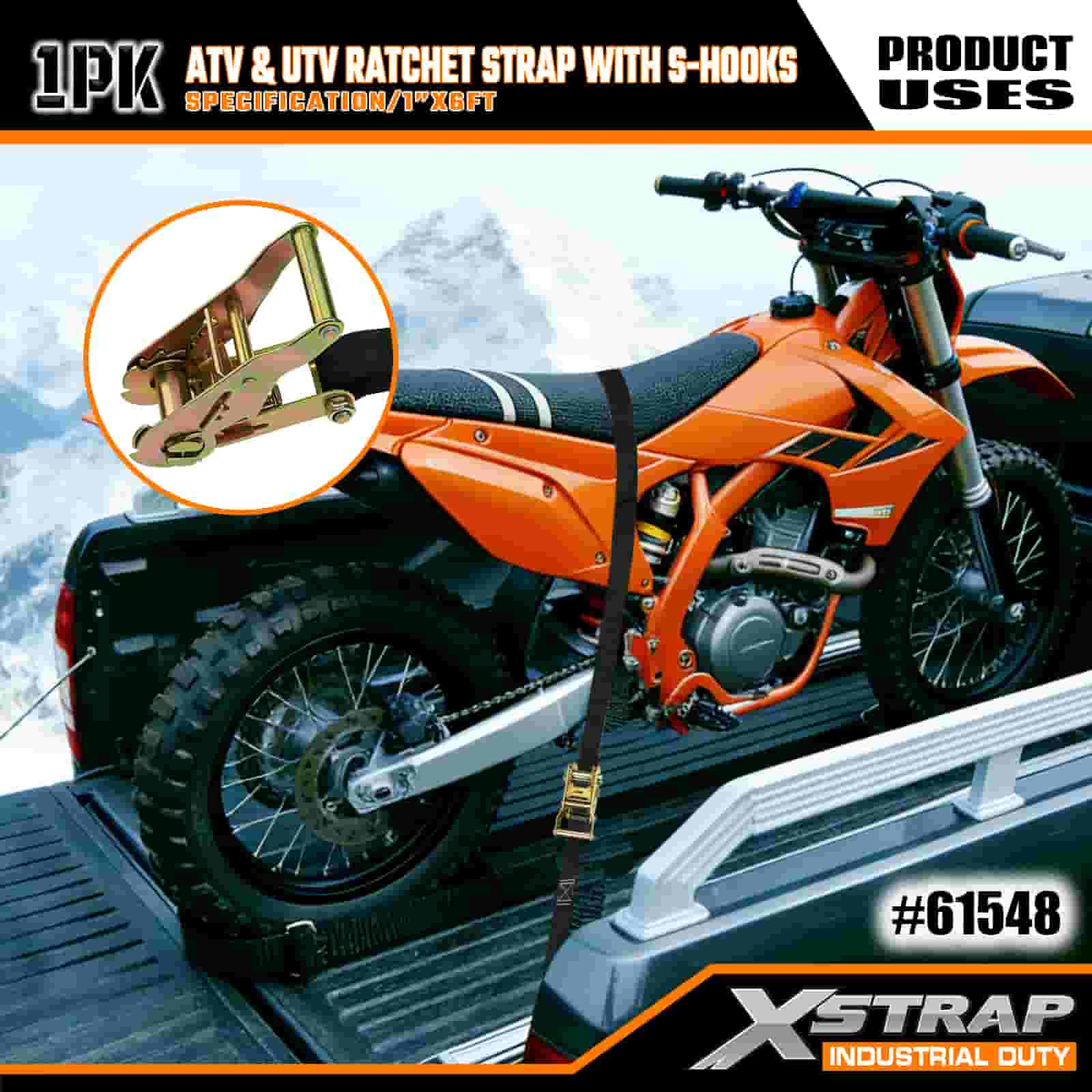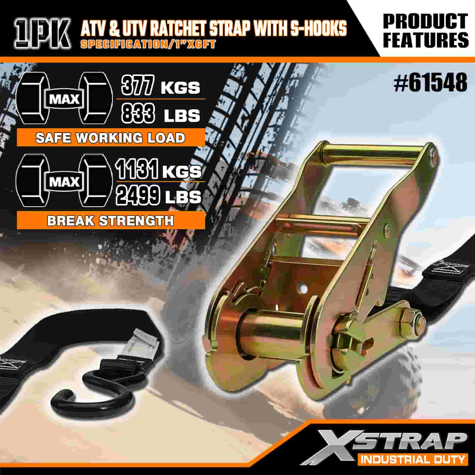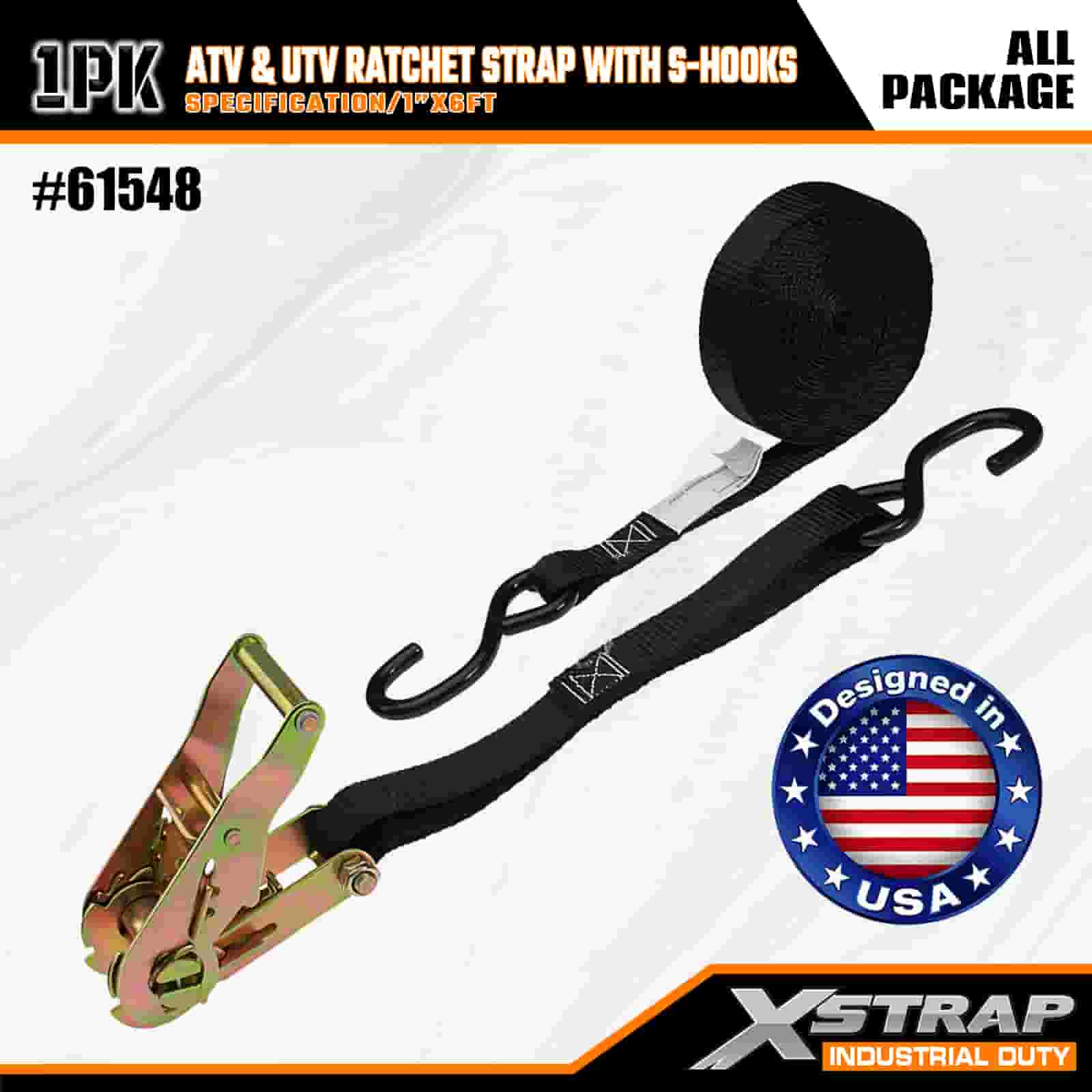 Xstrap ATV- ja AUV-räikkähihna S-koukuilla, 1 x 6 tuumainen polyesterisidontahihna, räikkähihna, 833 lbs:n kuormankiinnityshihnat S-koukuilla perävaunuun, peräkärryyn tarkoitettuun hiihtoveneeseen, pieniin autoihin, raskaisiin varusteisiin.