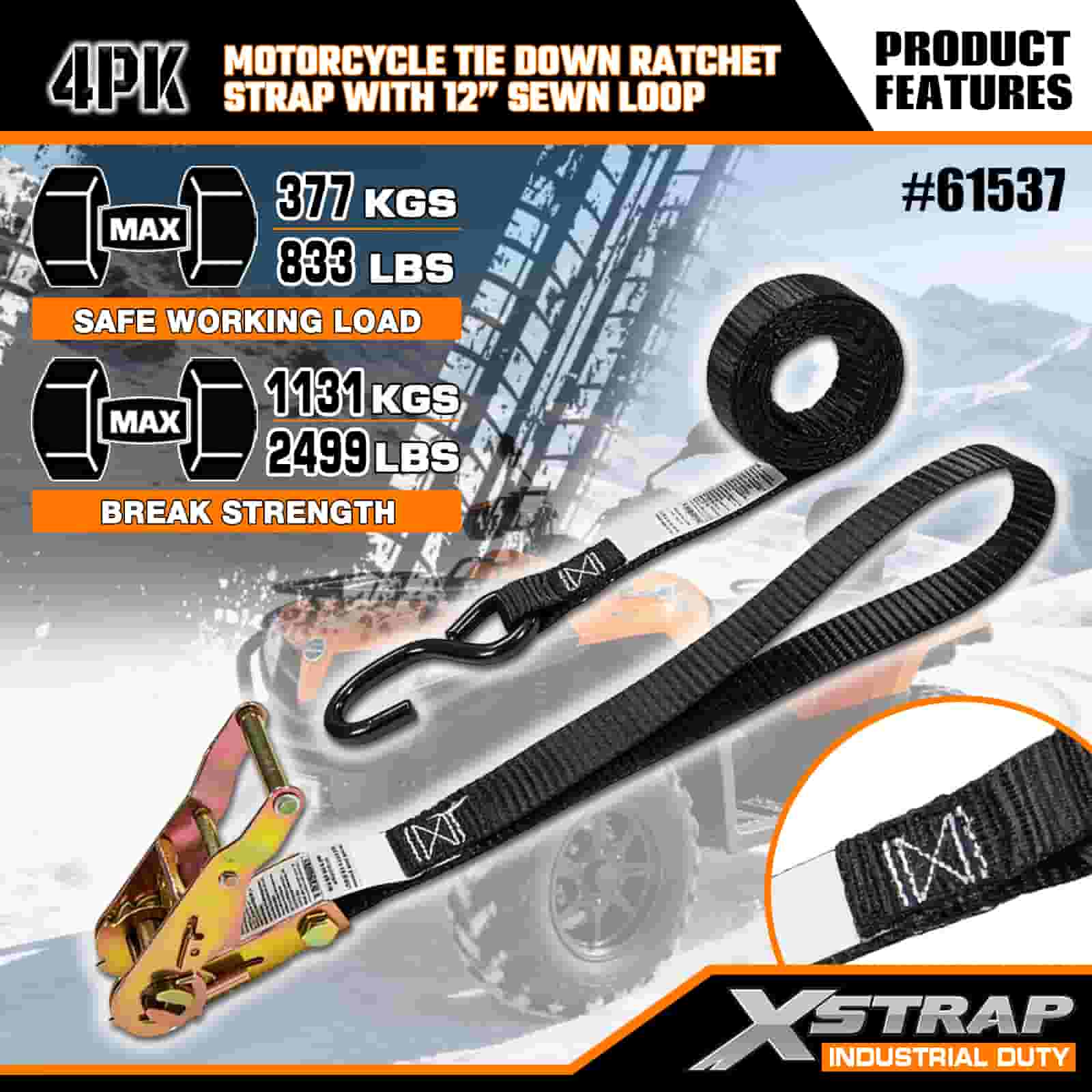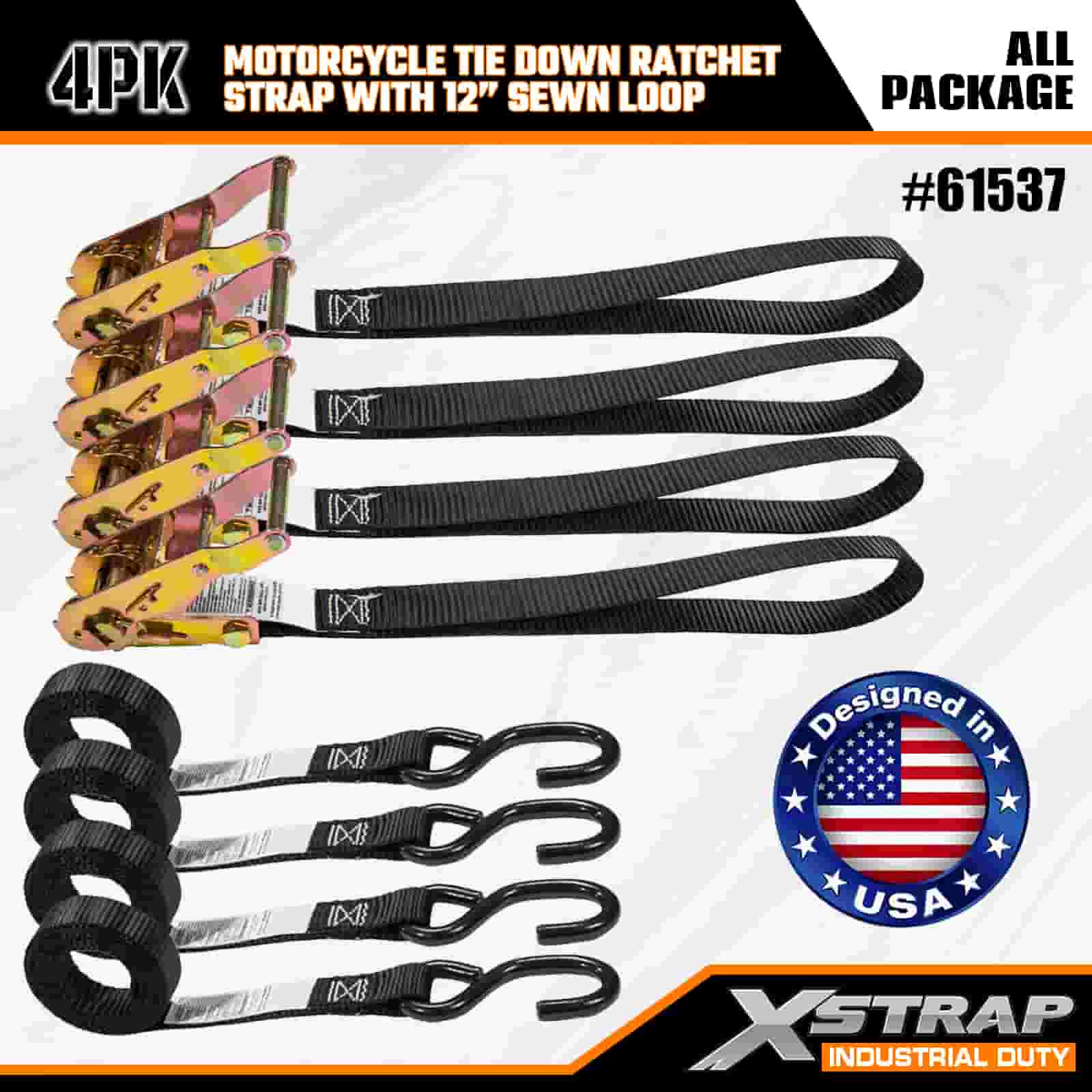 Xstrap 4PK moottoripyörän solmittava räikkähihna, jossa 12" ommeltu silmukka, 1" x 6" polyesterisidontahihna, vetoräikkähihna, 833 lbs:n kuormankiinnityshihnat S-koukulla vakavalle ammattilaiselle tavaran perävaunun kiinnittämiseen, pieni S-vaunuvaunu.
