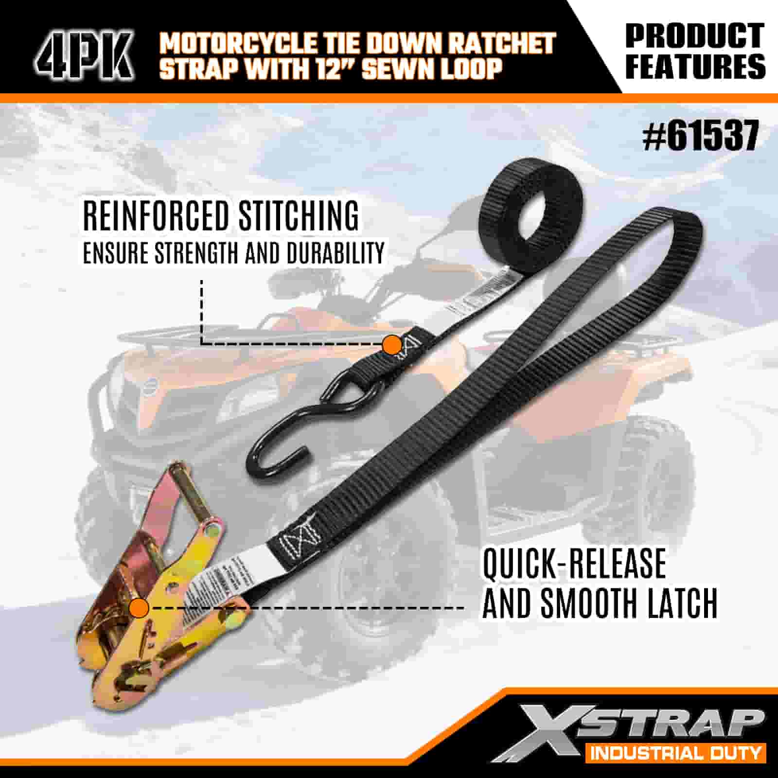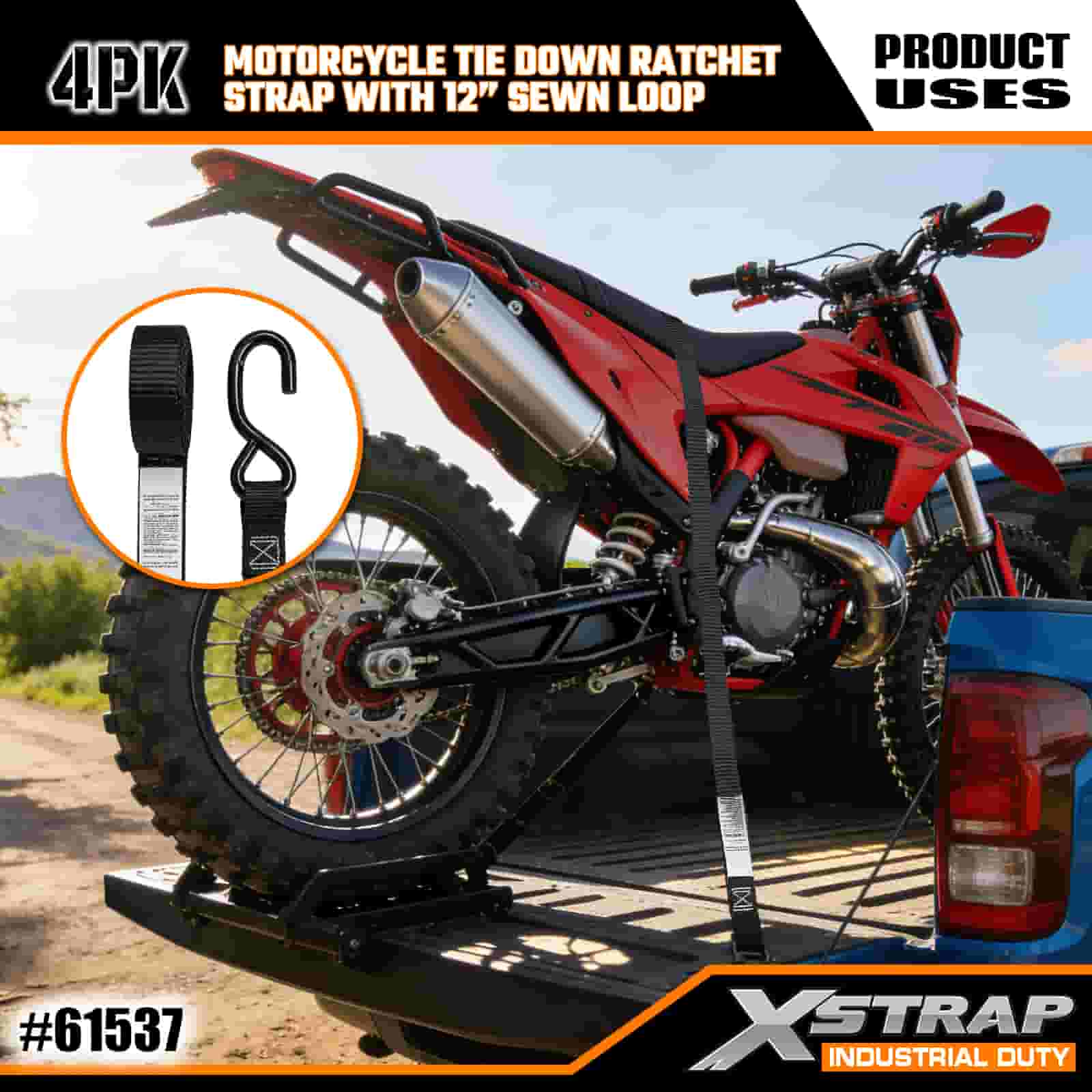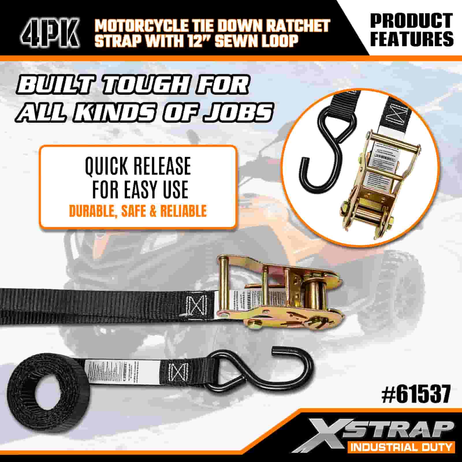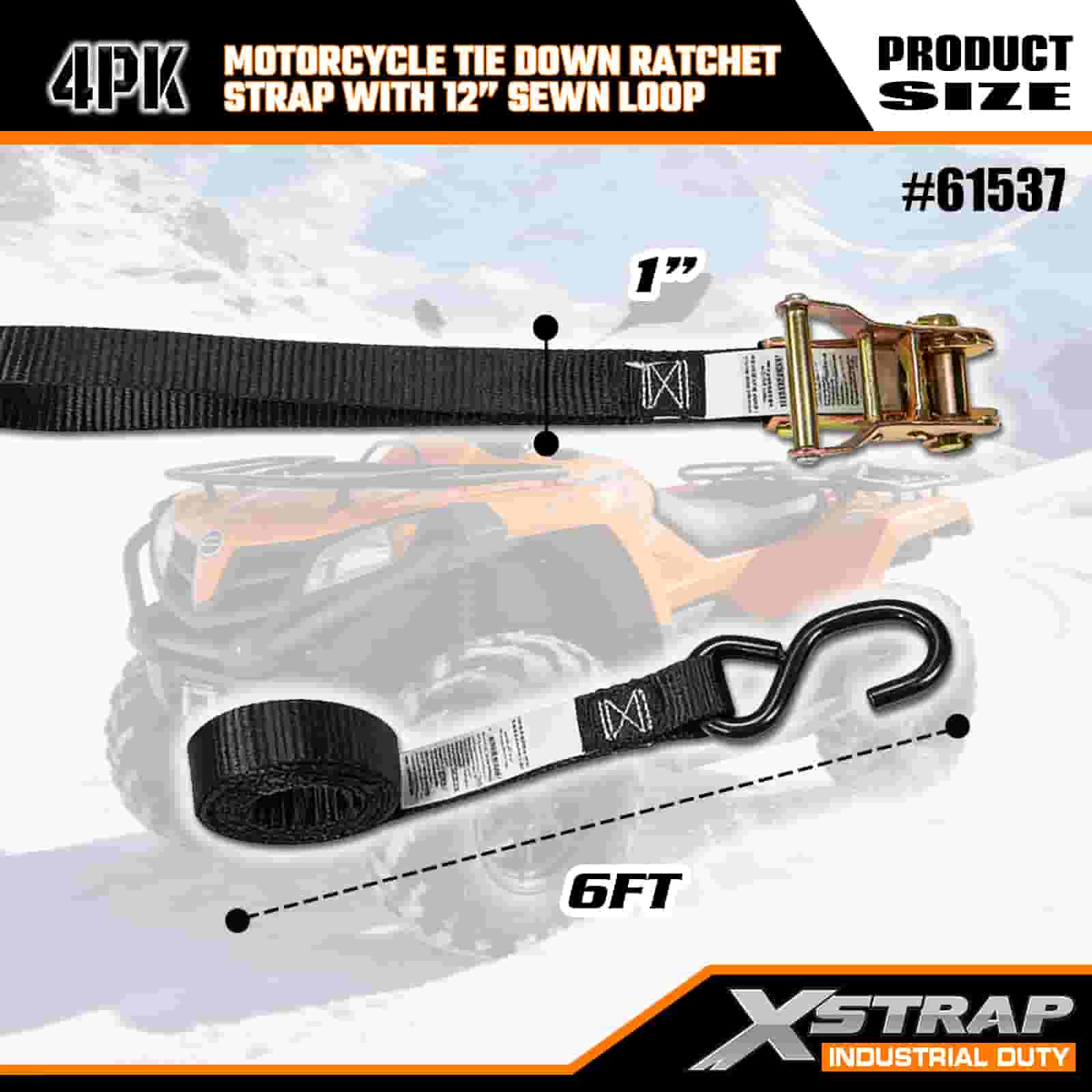 - 4-pack 6FT -hihnat moottoripyörän kiinnitykseen: myydään 4-hihnaisena sarjana (1 tuuman leveys × 6 jalkaa pitkä), ihanteellinen moottoripyörien, mönkijöiden ja pienten varusteiden kiinnittämiseen kuorma-auton sänkyihin tai kuljetuksen aikana.