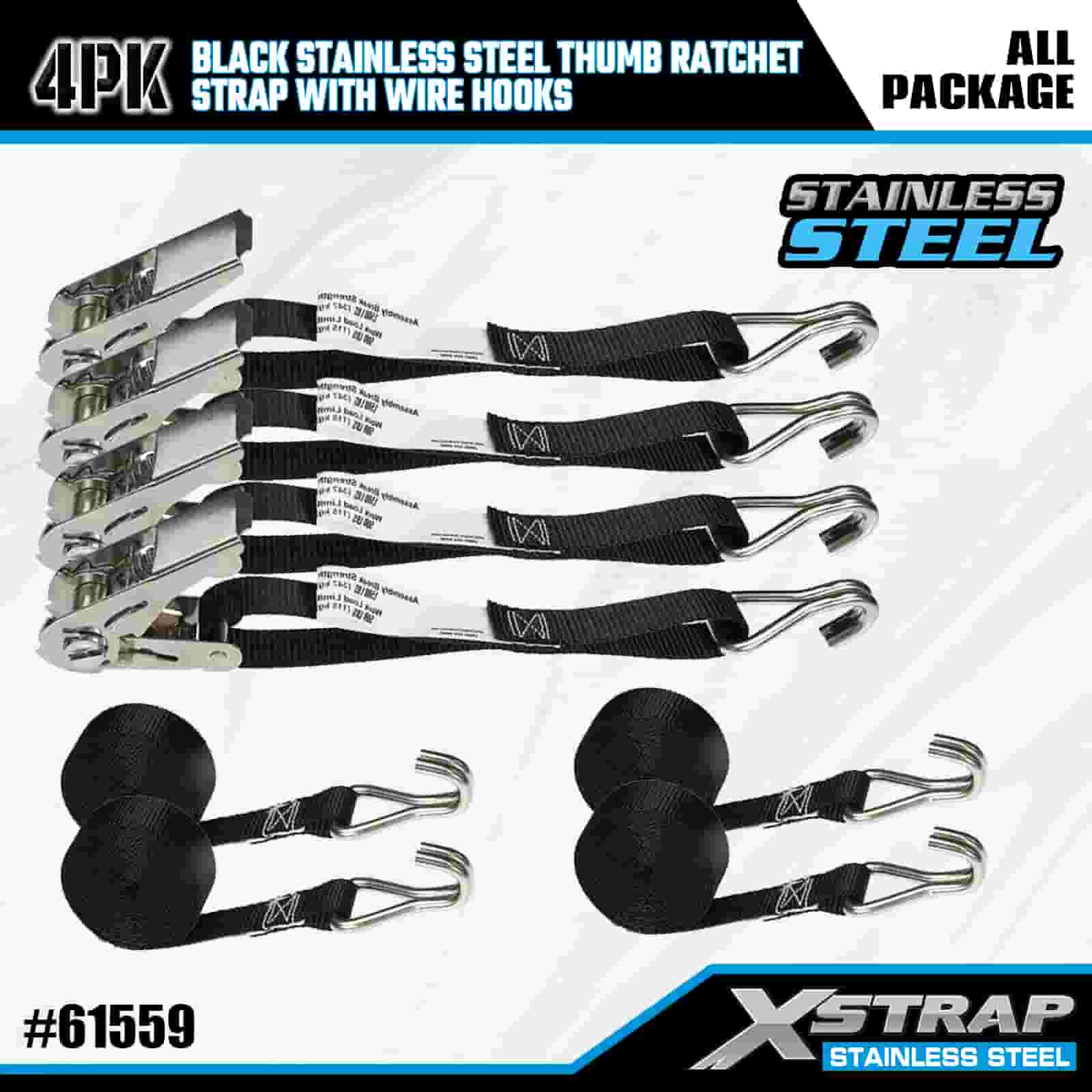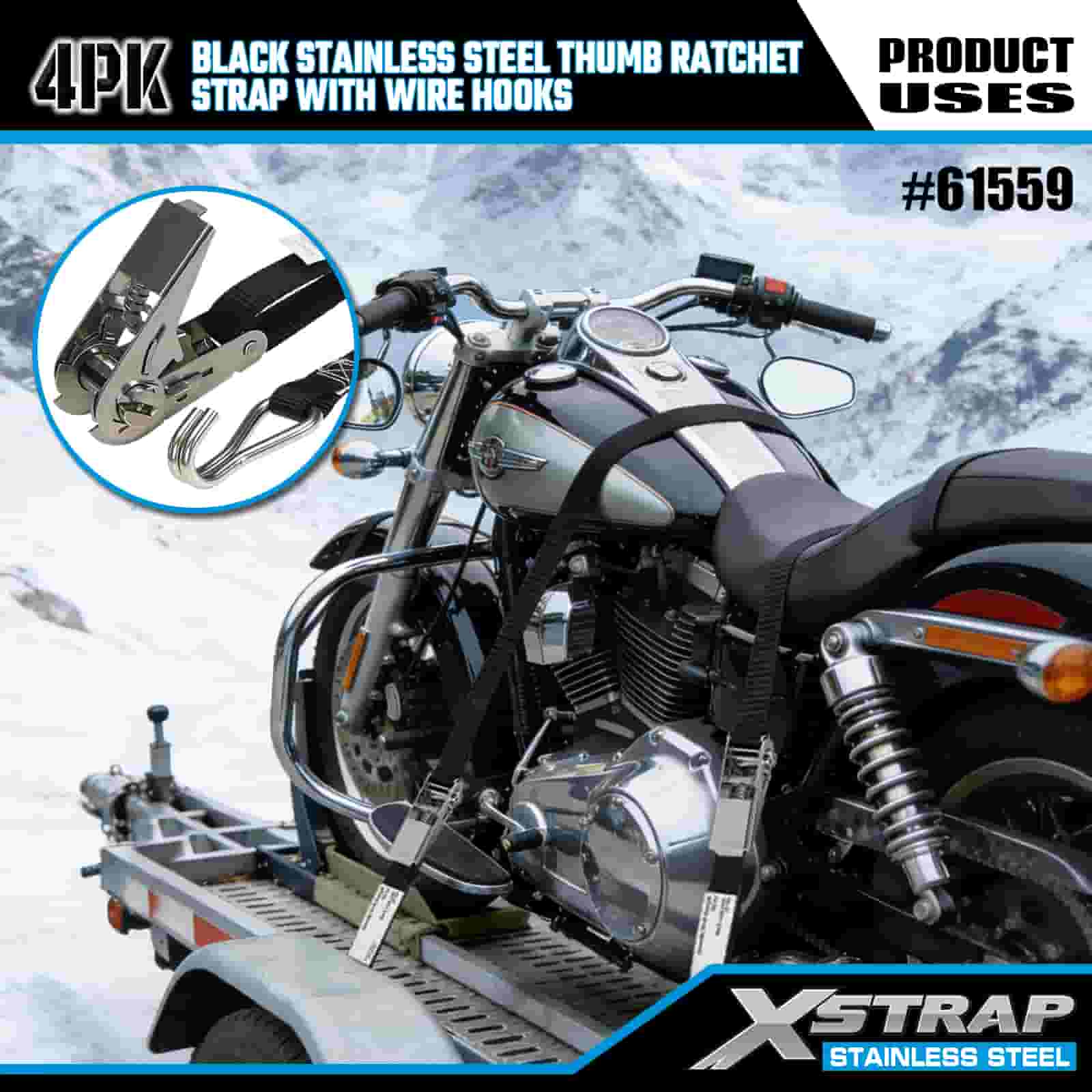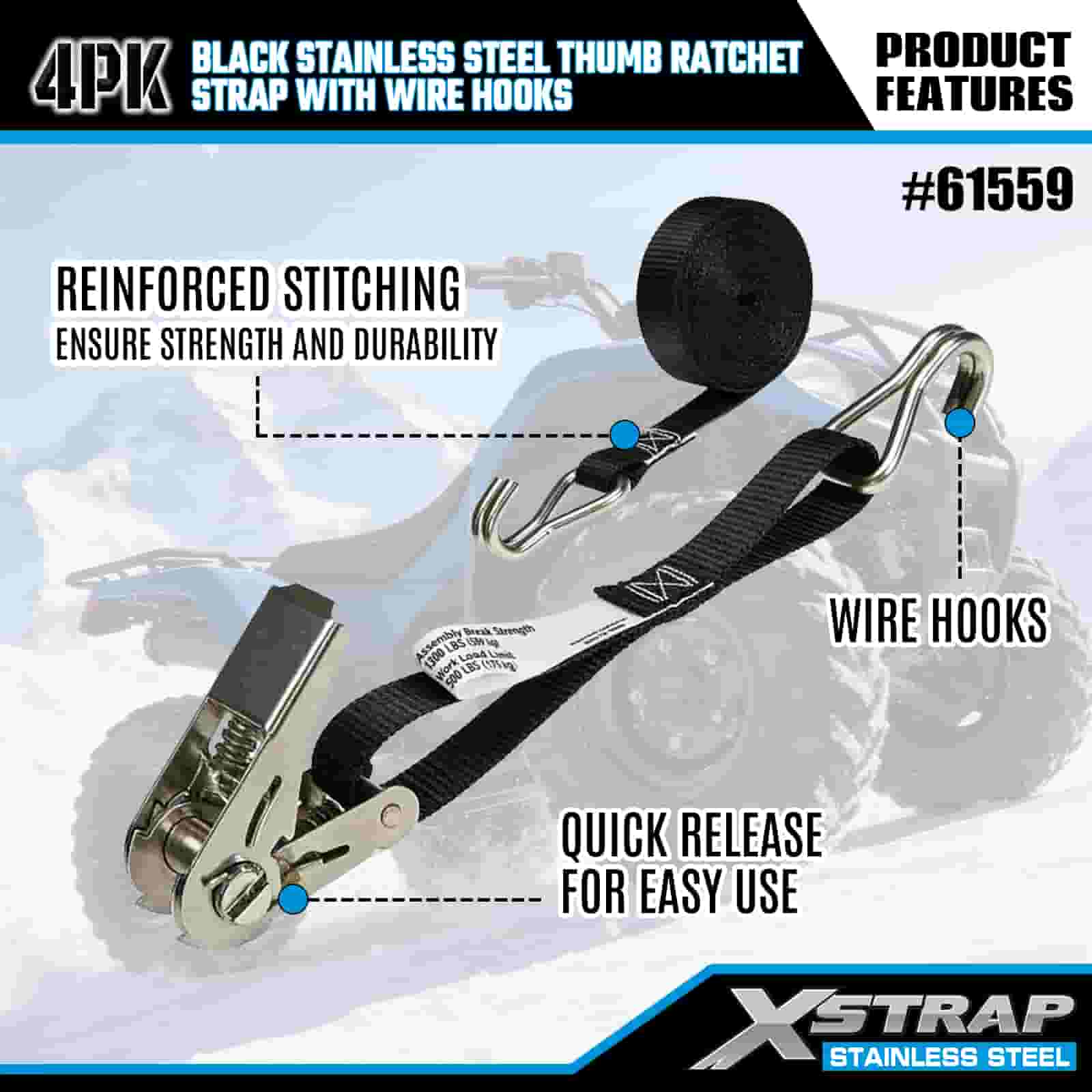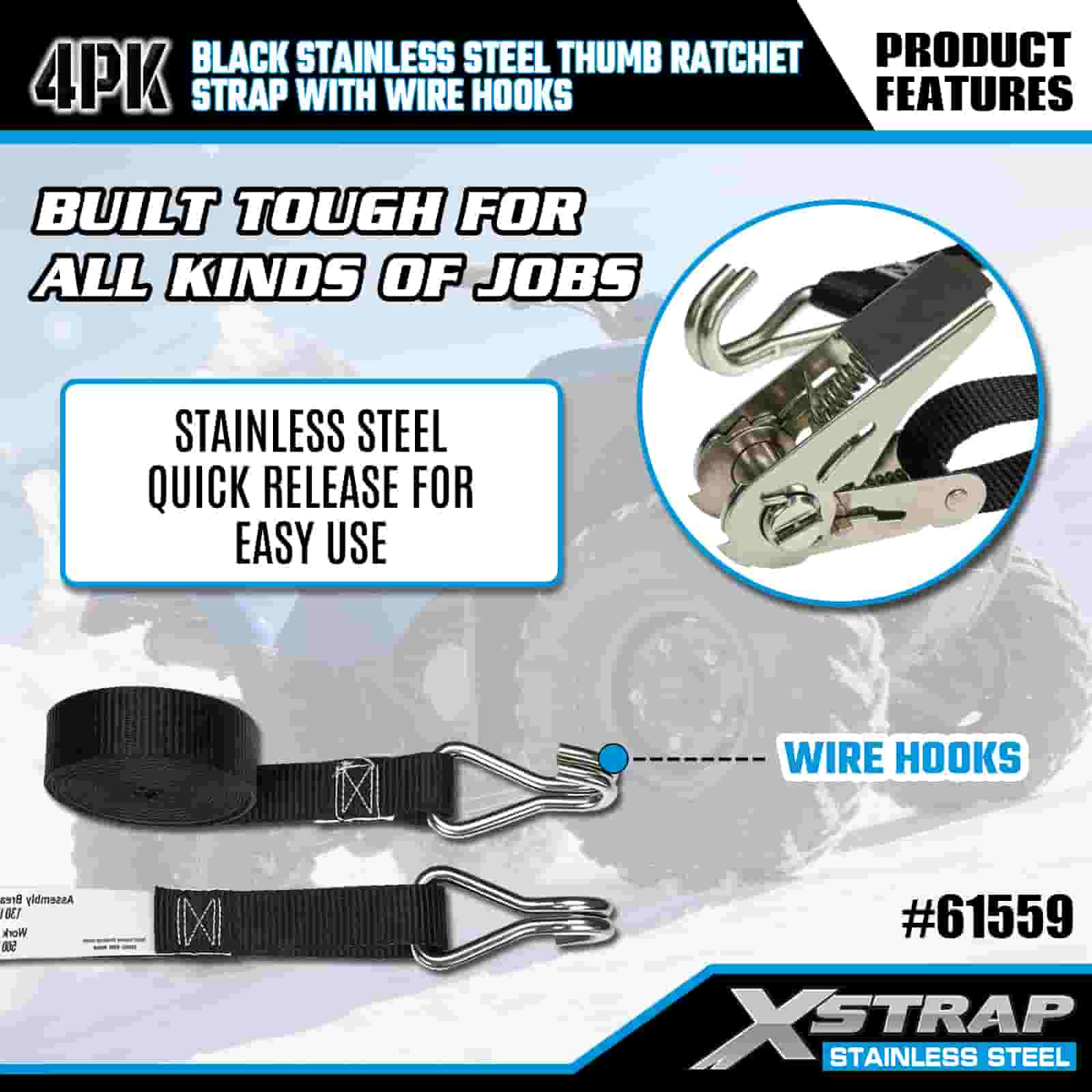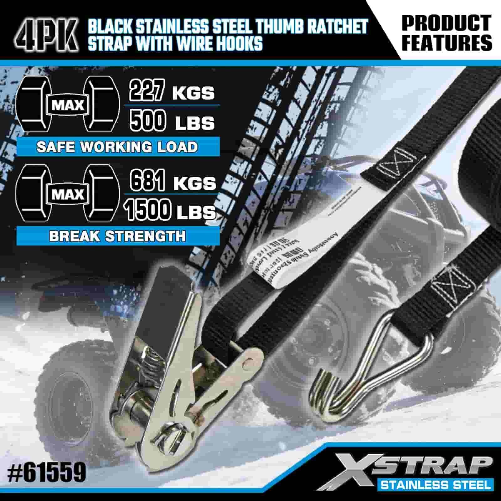 Xstrap 4PK musta ruostumattomasta teräksestä valmistettu peukaloräikä lankakoukuilla, 1" x 10" polyesterisidontahihna, räikkähihna, 500 lbs:n kuormankiinnityshihnat lankakoukuilla peräkärryyn, tasainen perävaunu, hiihtovene, pieni auto, raskaat varusteet.