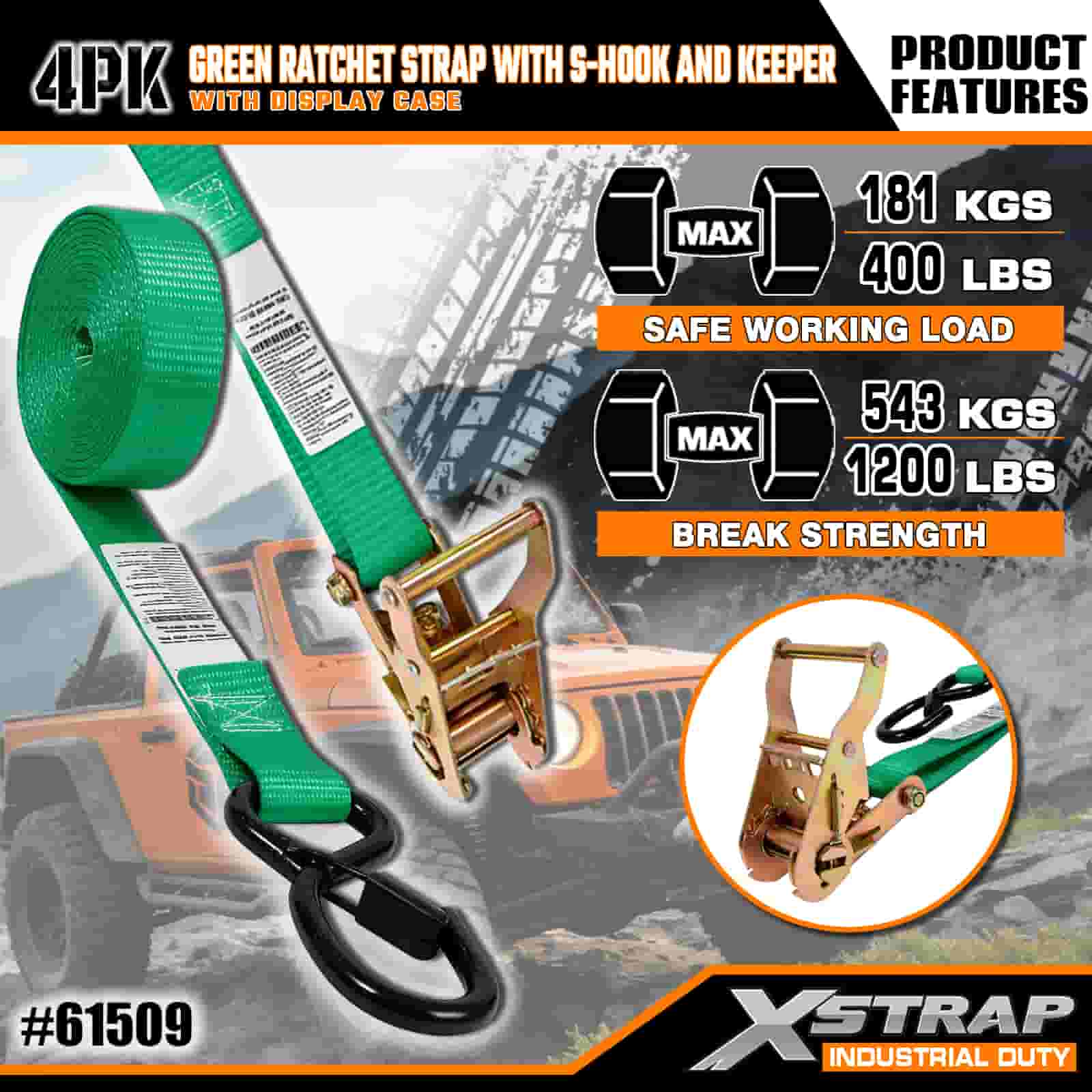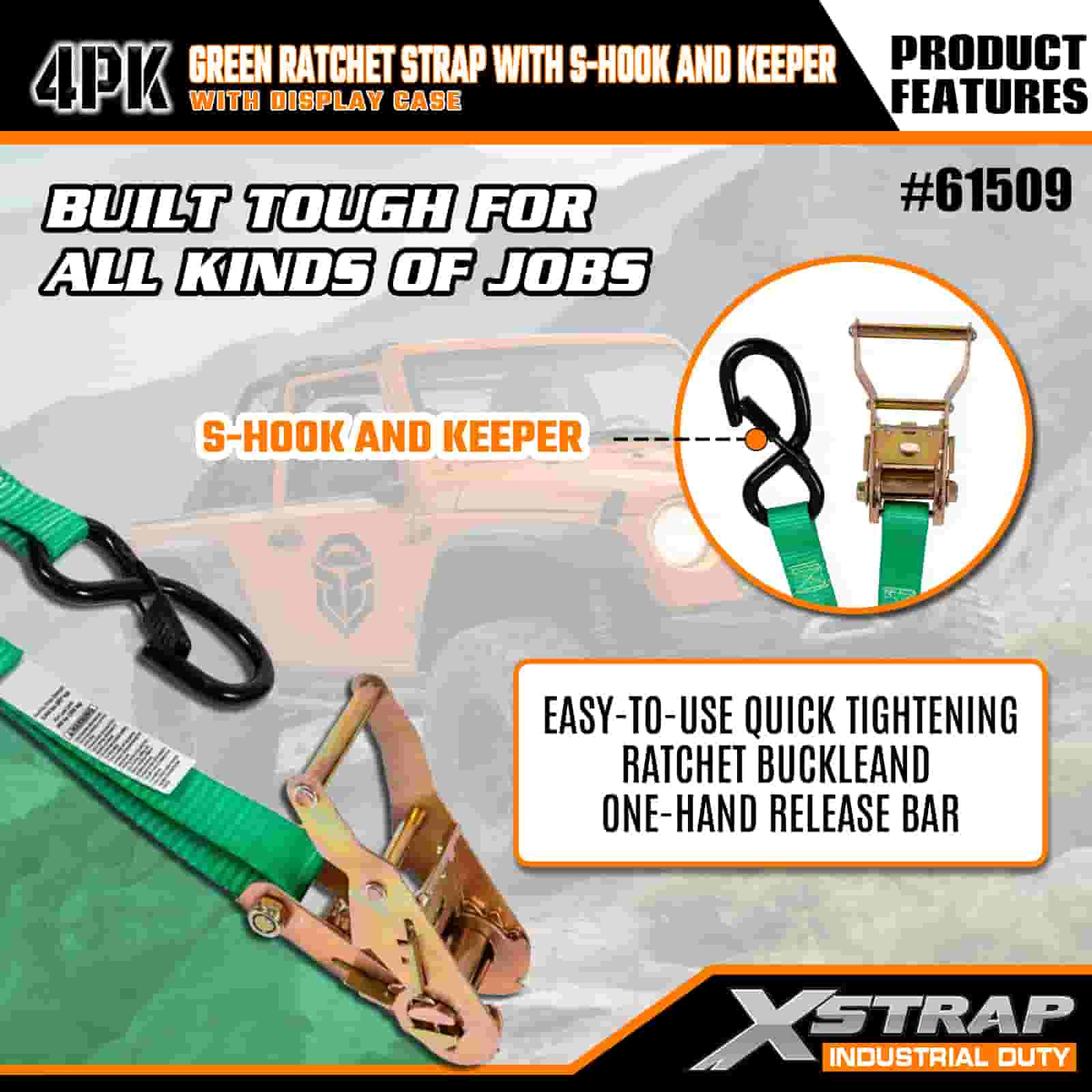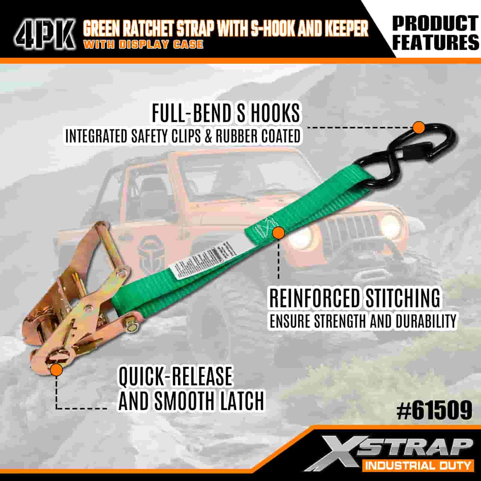 Xstrap 4 Pack räikkähihna turva-S-koukuilla, 1" x 15" polyesterisidontahihna, vetoketjullinen räikkähihna, 400 lbs:n kuormankiinnityshihnat S-turvakoukuilla vakavalle ammattilaiselle rahtiperävaunun kiinnittämiseen, tasainen perävaunu, autohiihtovene, pieni auto.