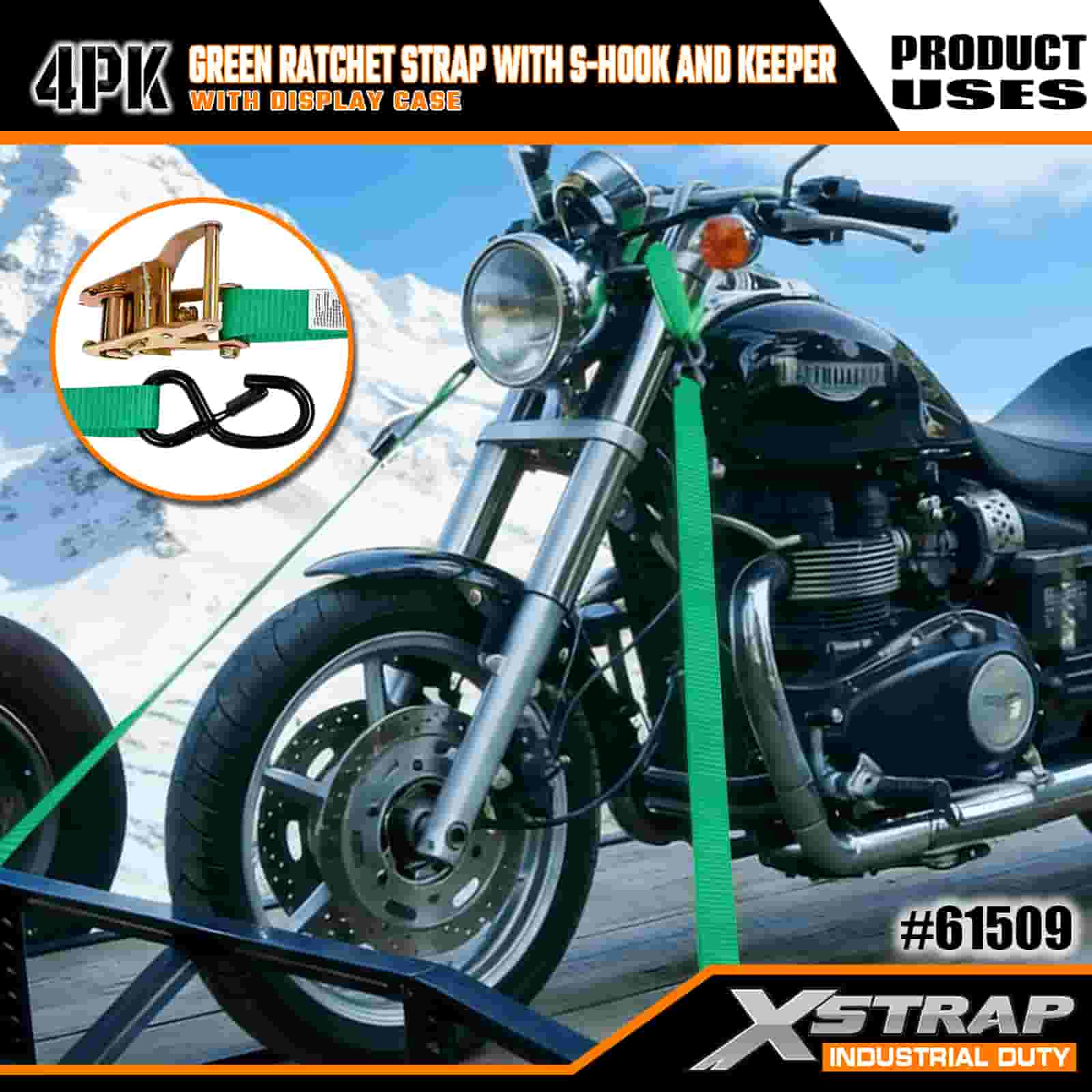 - 4-pakkaus, jossa on järjestetty säilytys: Myydään 4-hihnaisena settinä (näyttöpakkauksessa), jossa on sisäänrakennetut säilytyskelat siististi säilytystä varten. Se on kooltaan 1 tuuma leveä × 15 jalkaa pitkä, joten se on ihanteellinen moottoripyörien, ulkoiluvarusteiden ja tavaratavaran kiinnittämiseen.