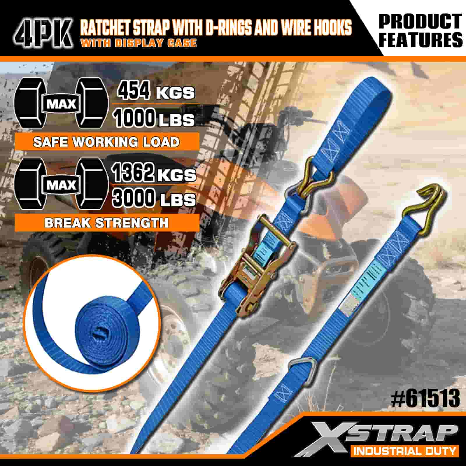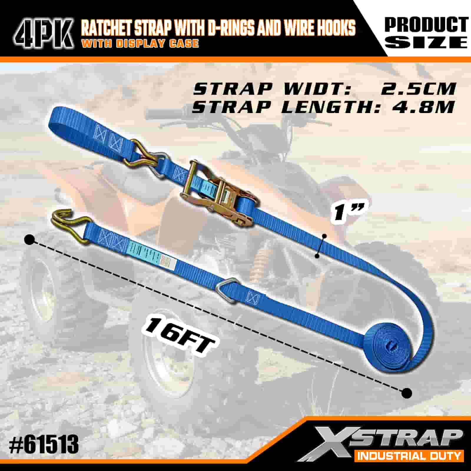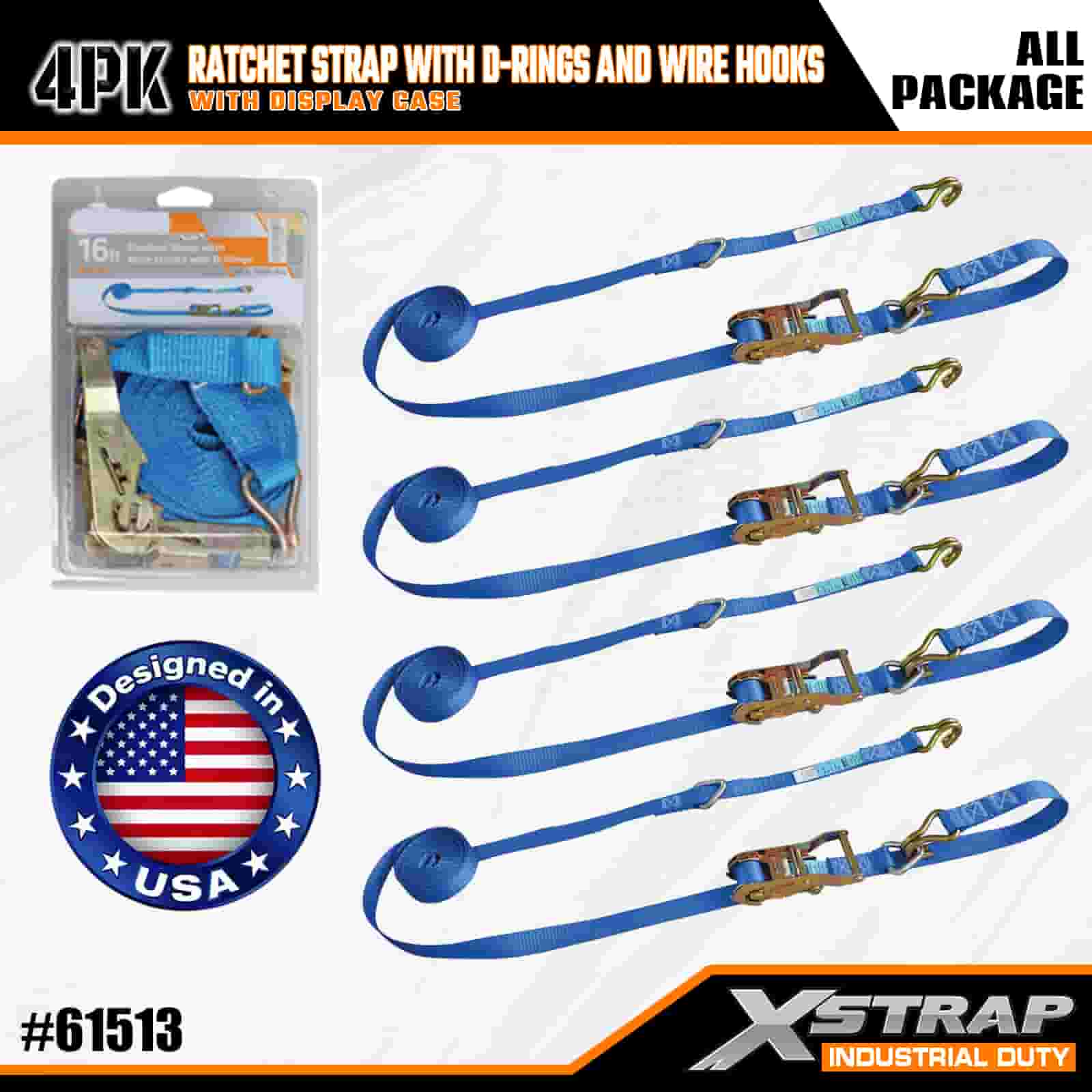 - 16 FT pituus järjestetyllä pakkauksella: Myydään 4-hihnaisena sarjana (näyttöpakkauksessa), jossa on sisäänrakennetut säilytyskelat; jokainen hihna on kooltaan 1 tuuma leveä × 16 jalkaa pitkä, ihanteellinen moottoripyörien, raskaan lastin ja teollisuuslaitteiden kiinnittämiseen.