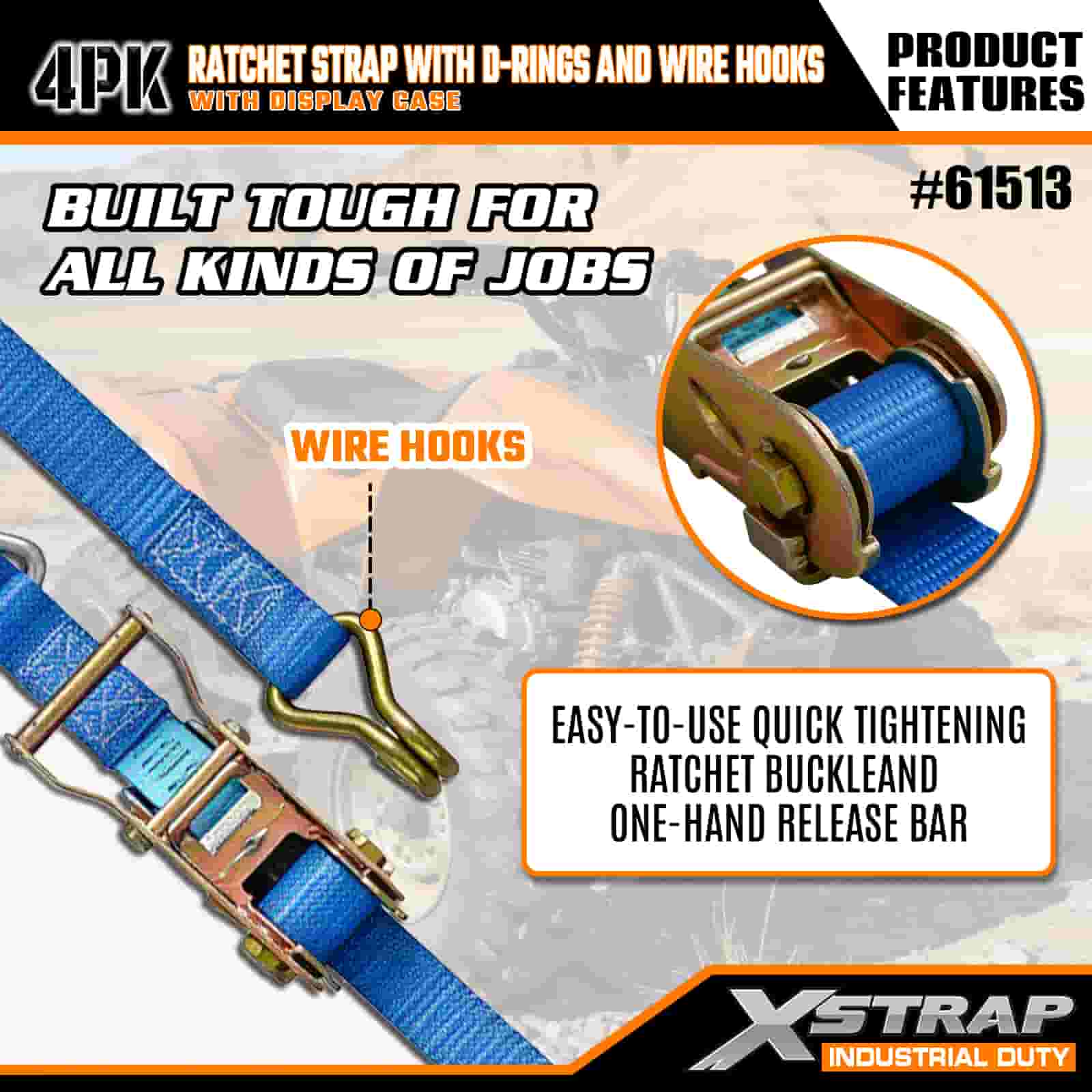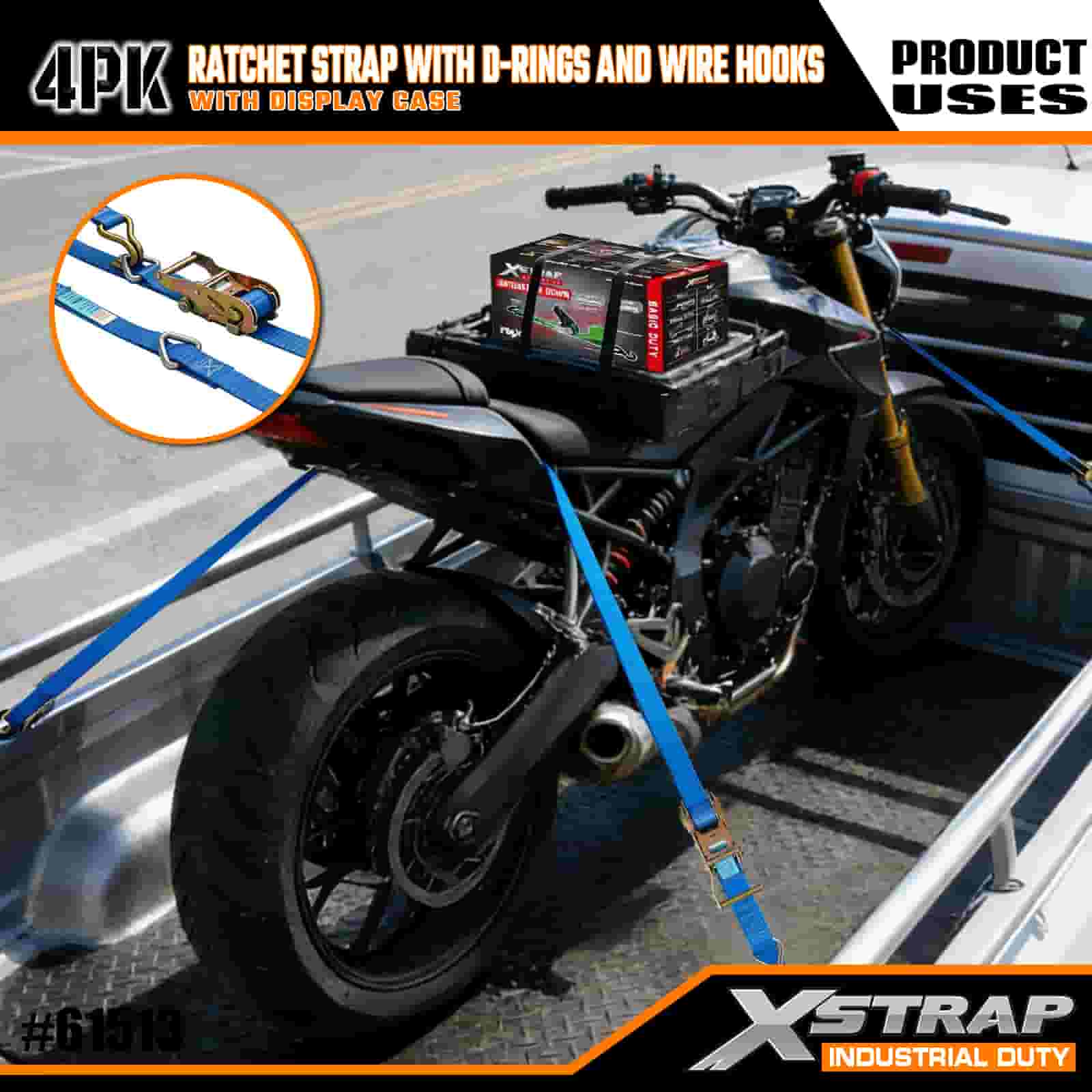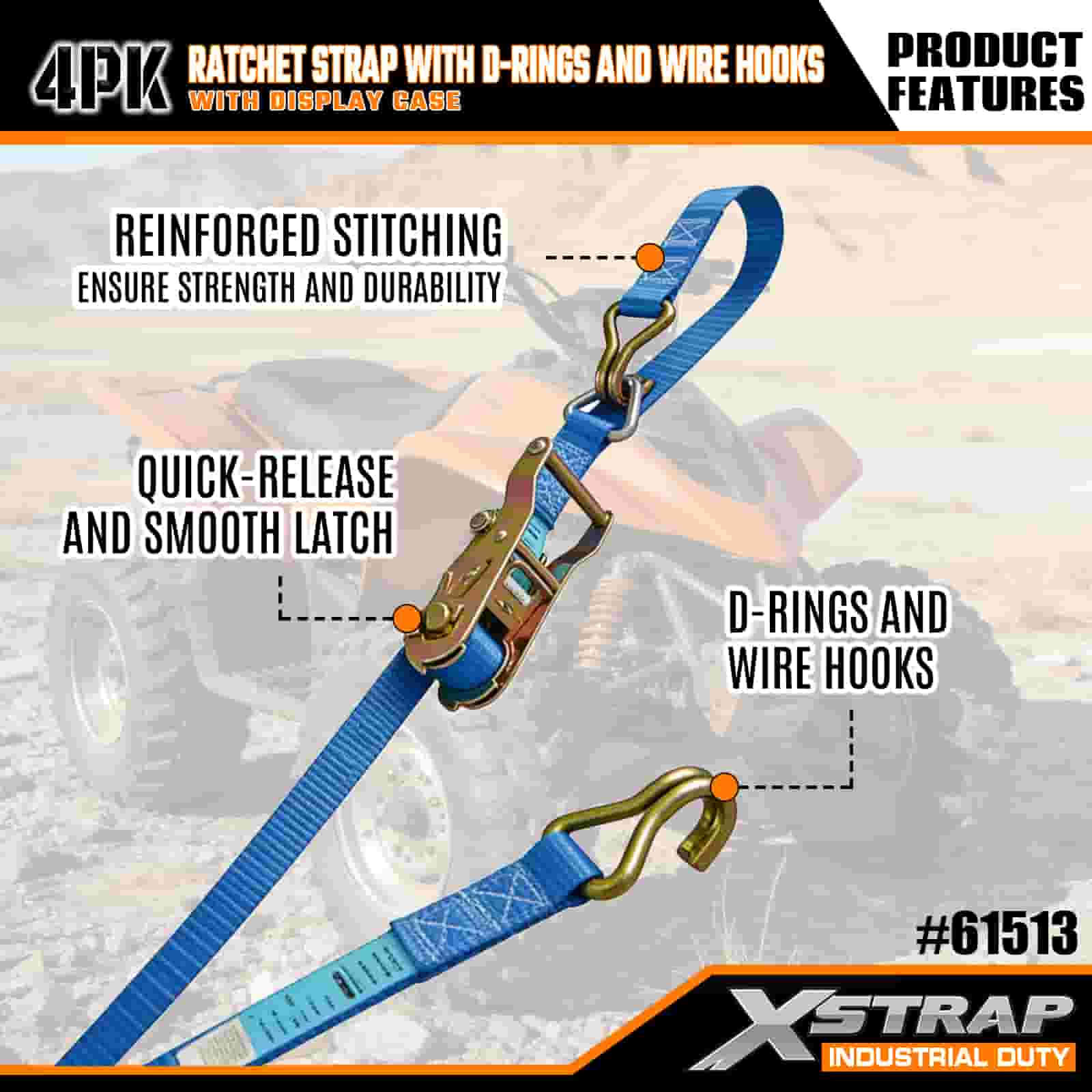 - 16 FT pituus järjestetyllä pakkauksella: Myydään 4-hihnaisena sarjana (näyttöpakkauksessa), jossa on sisäänrakennetut säilytyskelat; jokainen hihna on kooltaan 1 tuuma leveä × 16 jalkaa pitkä, ihanteellinen moottoripyörien, raskaan lastin ja teollisuuslaitteiden kiinnittämiseen.