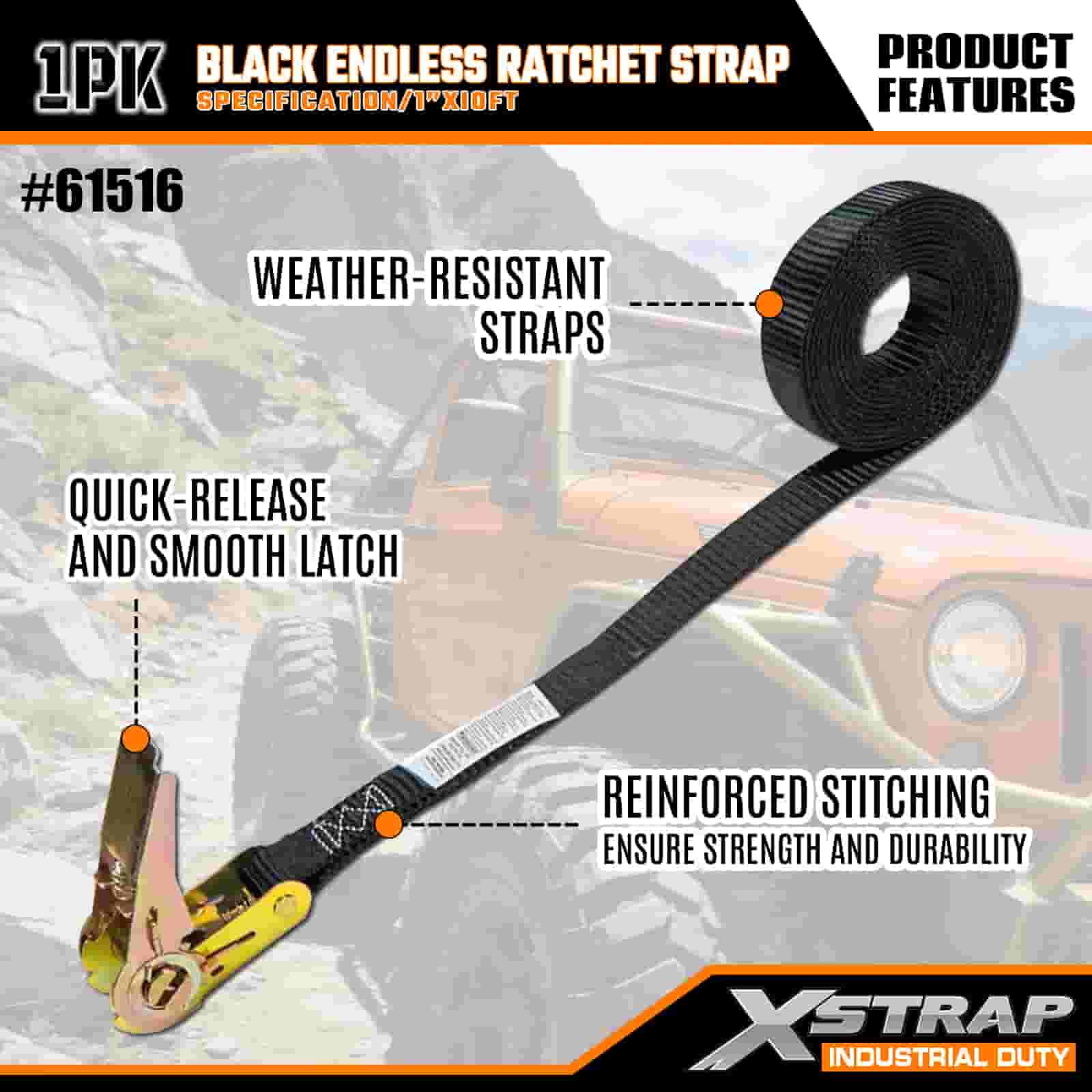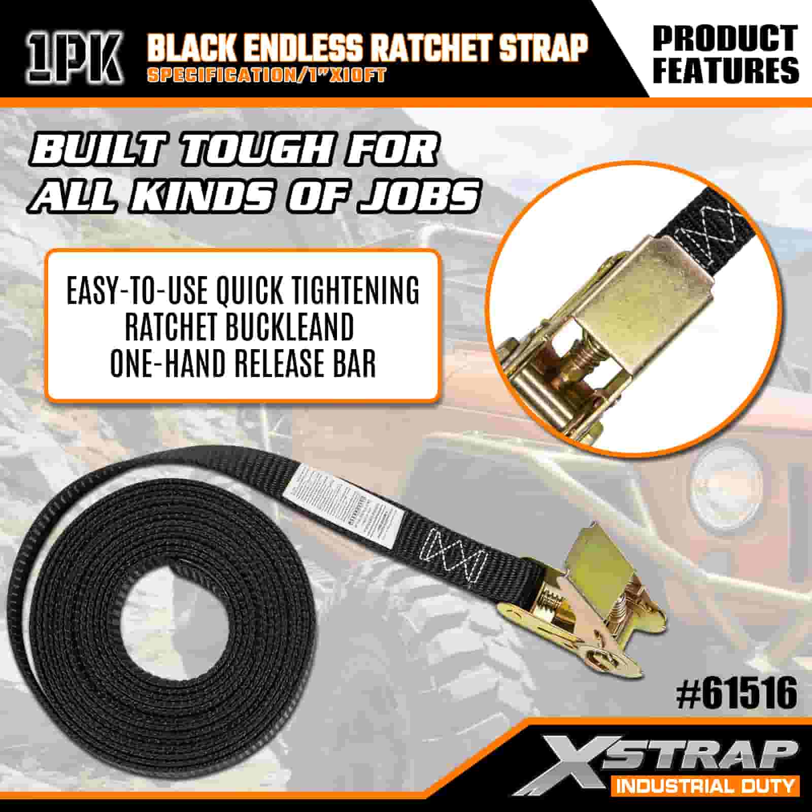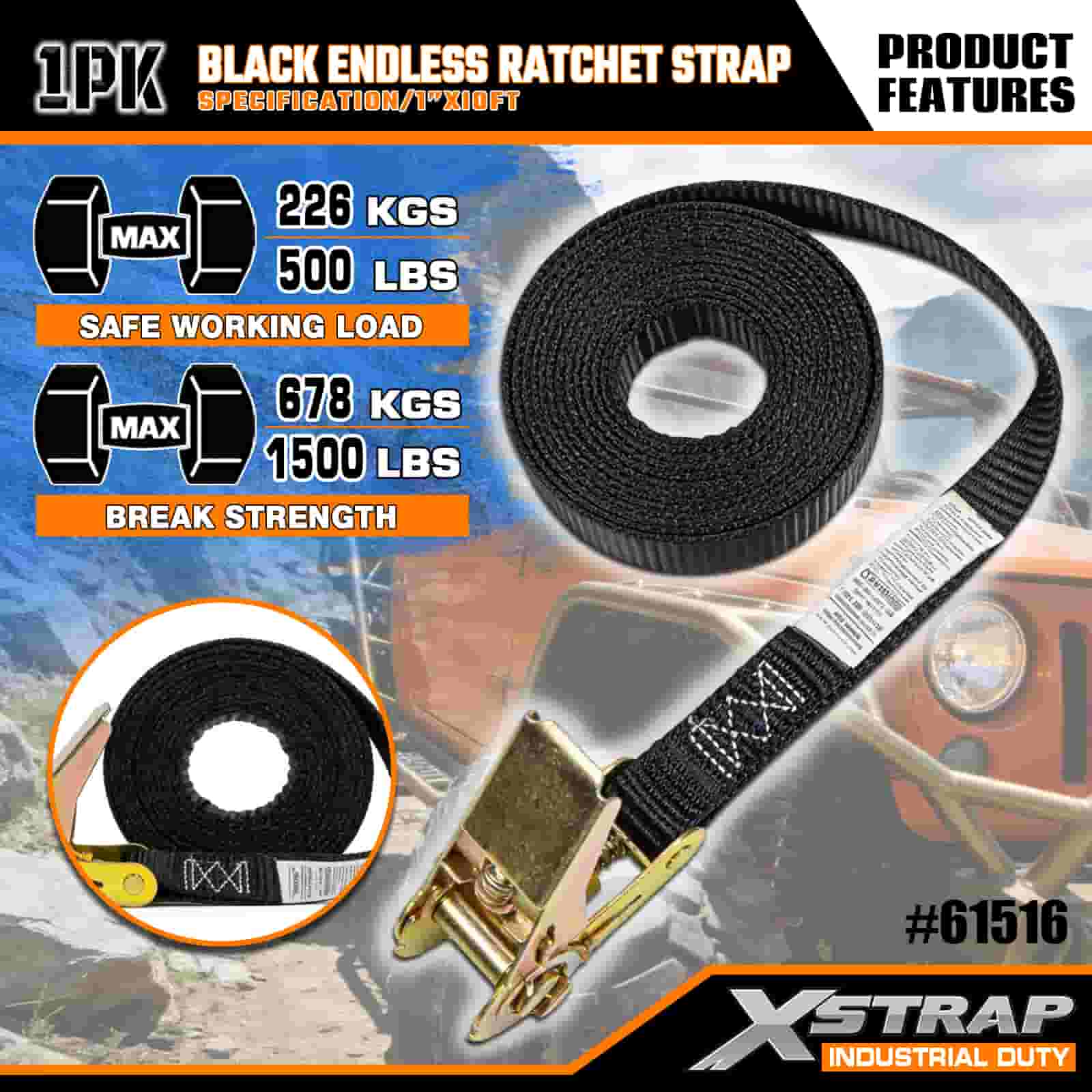 Xstrap musta päätön räikkähihna, 1" x 10" polyesterisidottu räikkähihna, 500 lbs:n kuormankiinnityshihnat vakavalle ammattilaiselle perävaunun kiinnittämiseen, tasainen perävaunu, hiihtovene, pieni auto.
