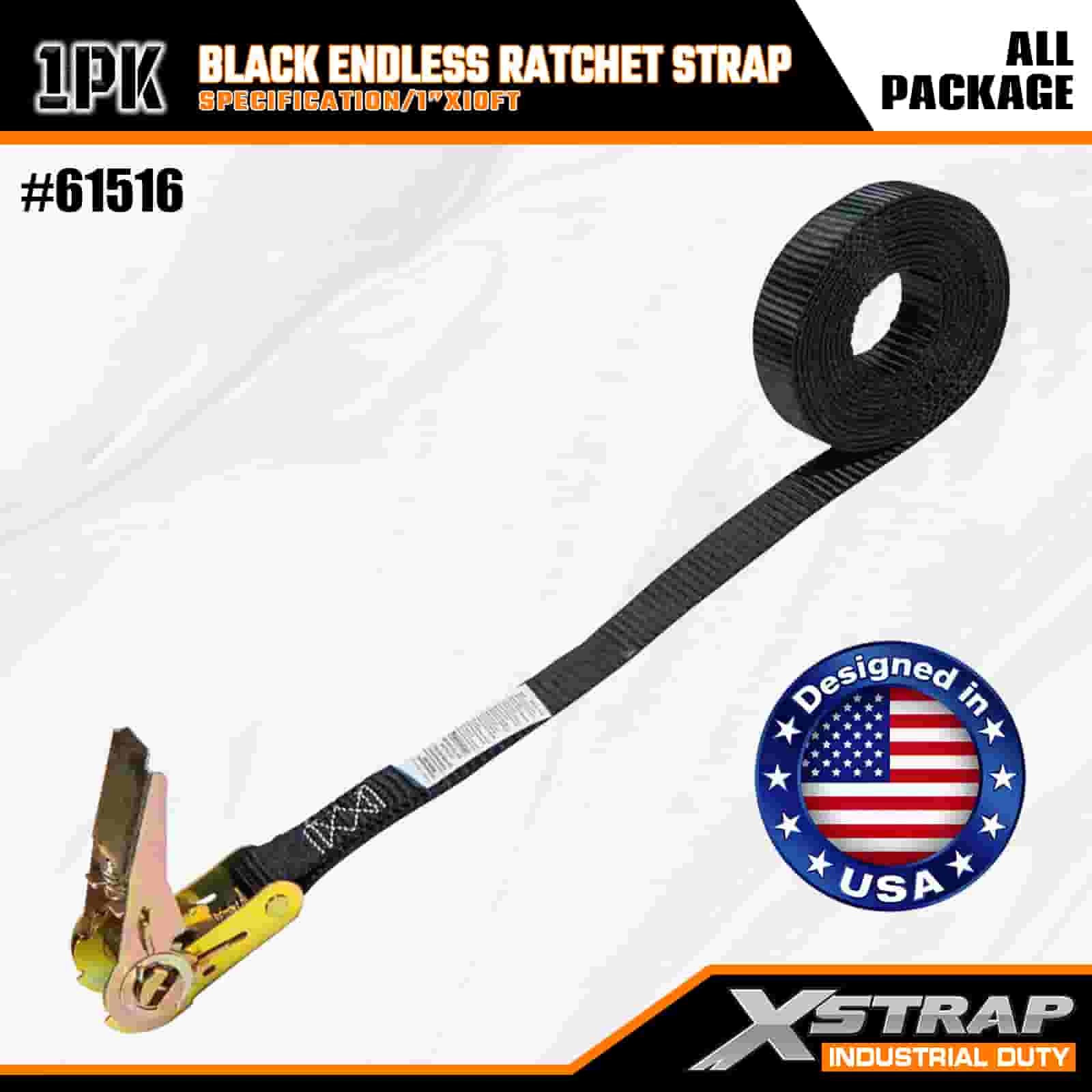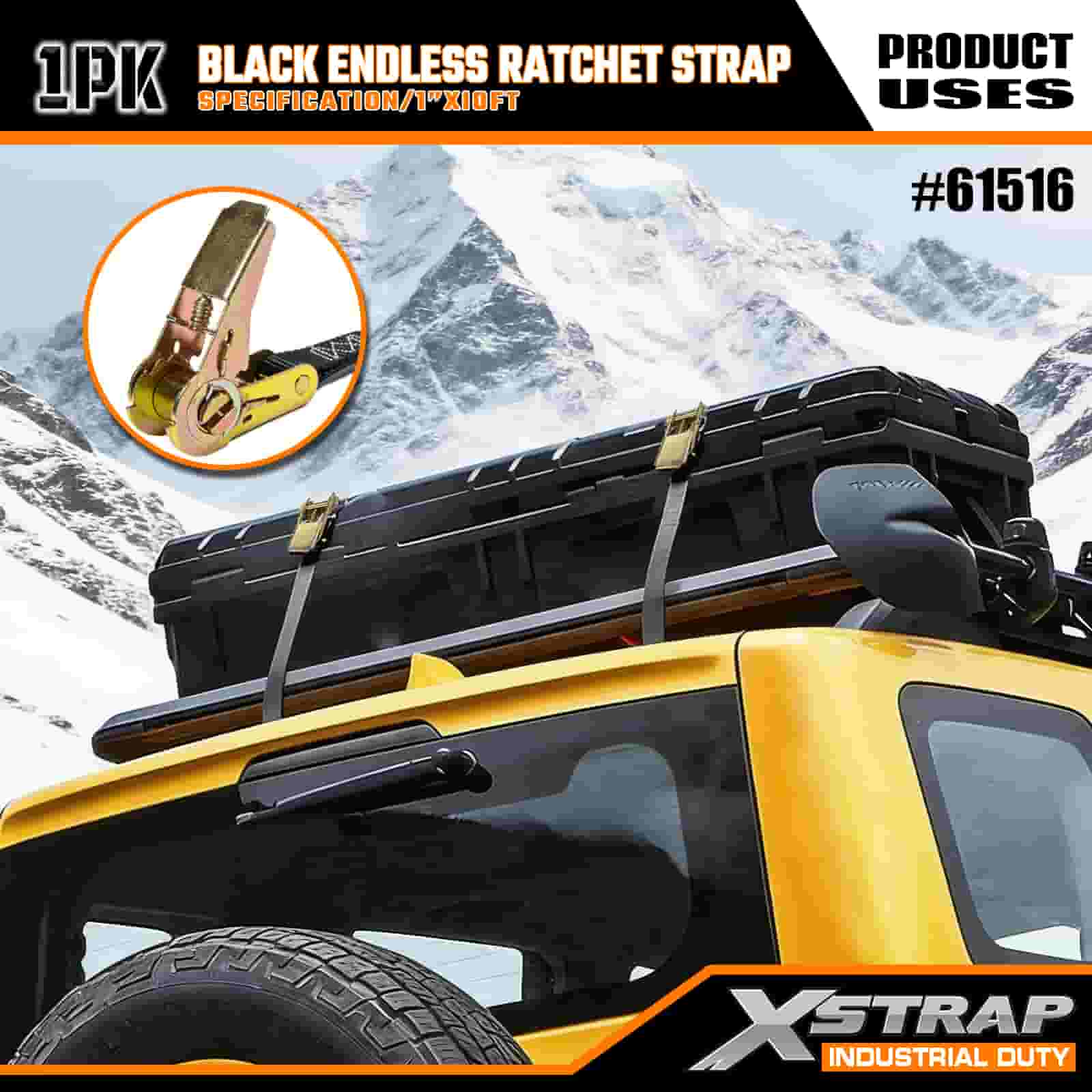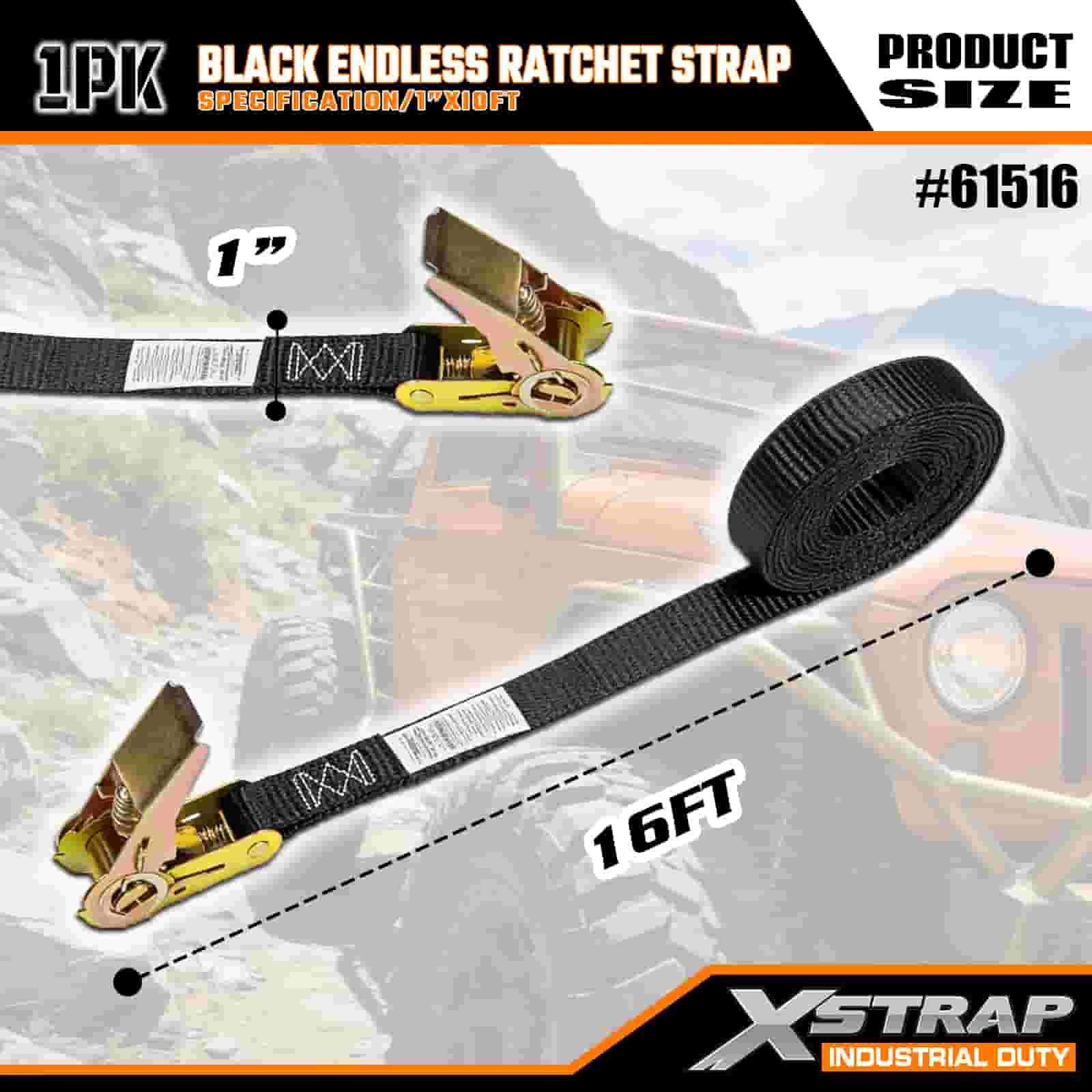 Xstrap musta päätön räikkähihna, 1" x 10" polyesterisidottu räikkähihna, 500 lbs:n kuormankiinnityshihnat vakavalle ammattilaiselle perävaunun kiinnittämiseen, tasainen perävaunu, hiihtovene, pieni auto.