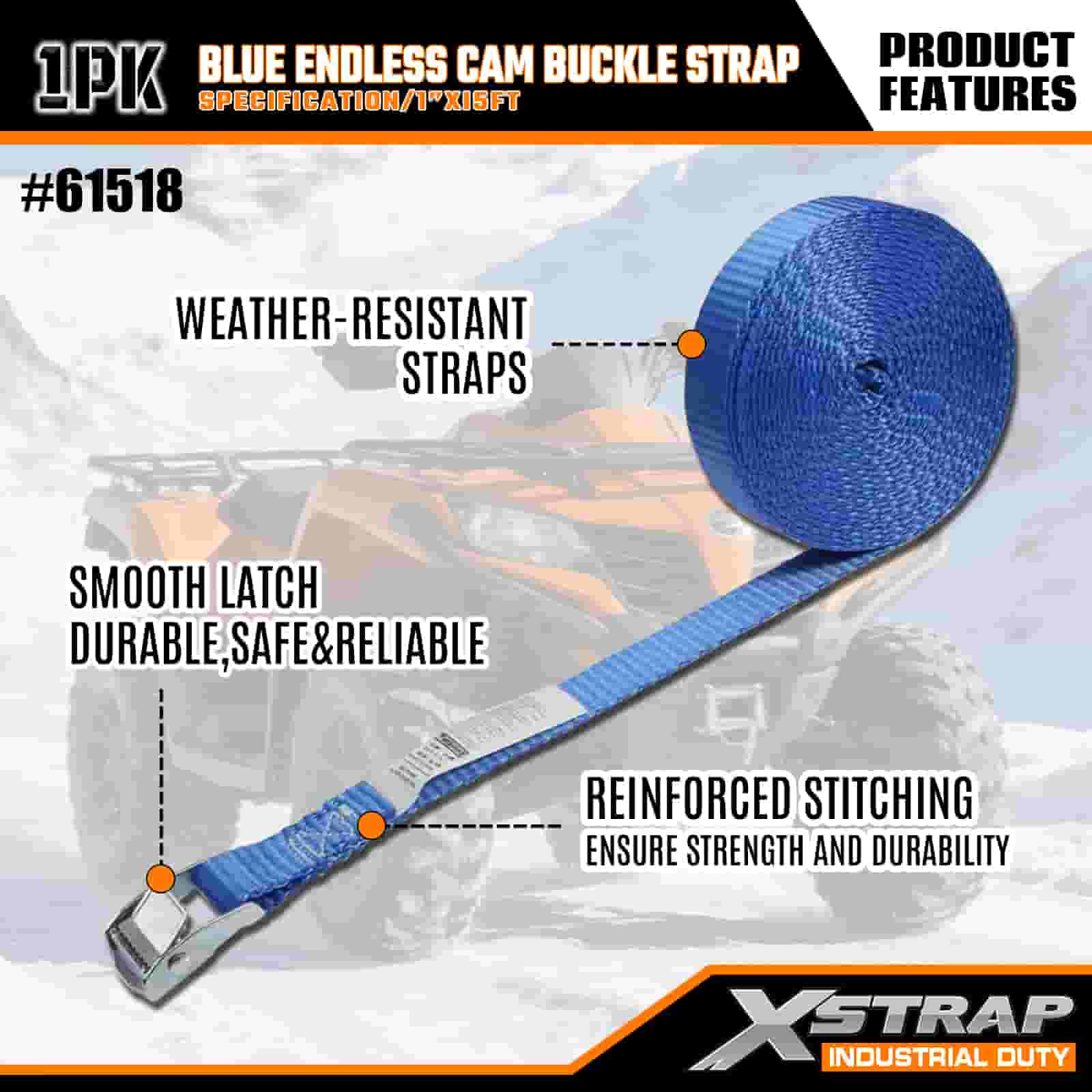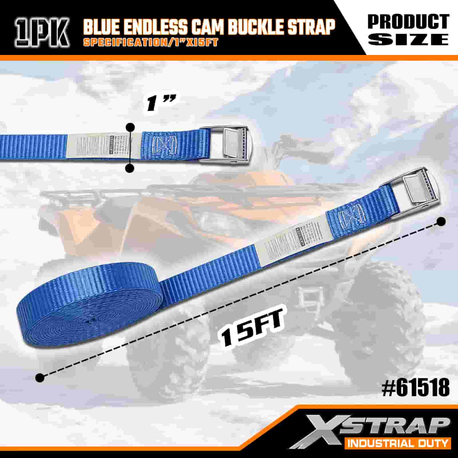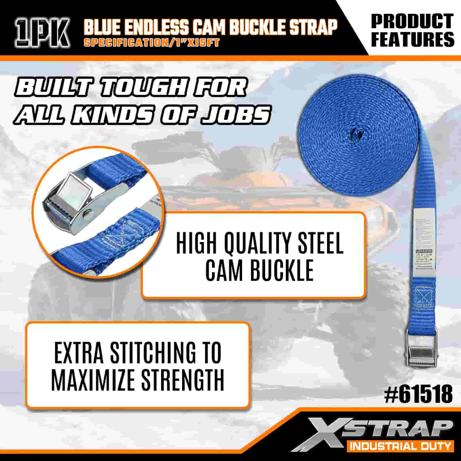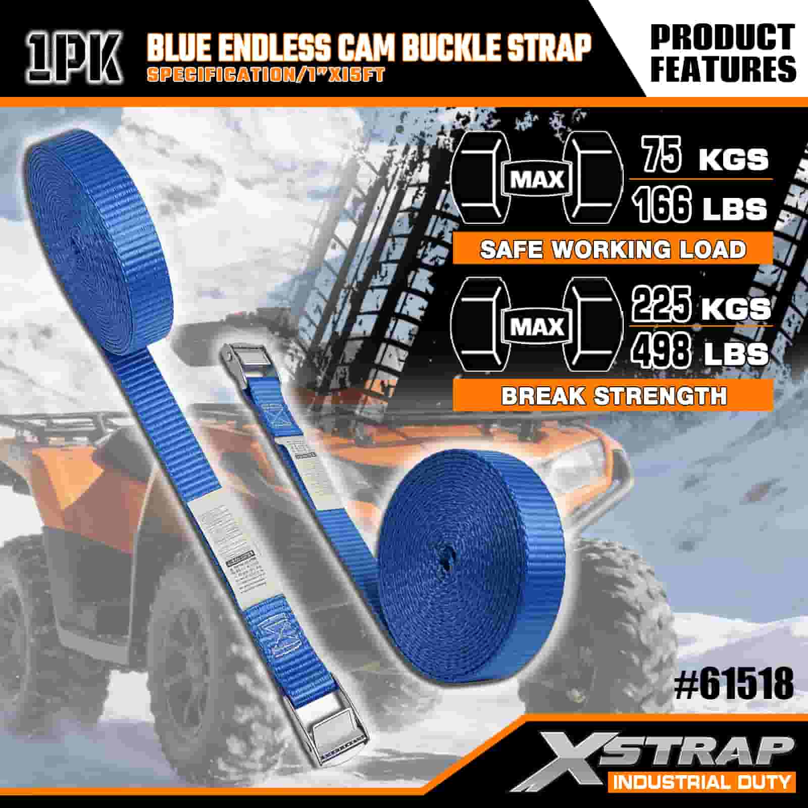 Xstrap Sininen Endless Cam-solkihihna, 1” x 15 tuumainen polyesterisidontahihna, vetoräikkähihna, 166 lbs:n kuormankiinnityshihnat vakavalle ammattilaiselle tavaravaunun kiinnittämiseen, tasainen perävaunu, hiihtovene, pieni auto.