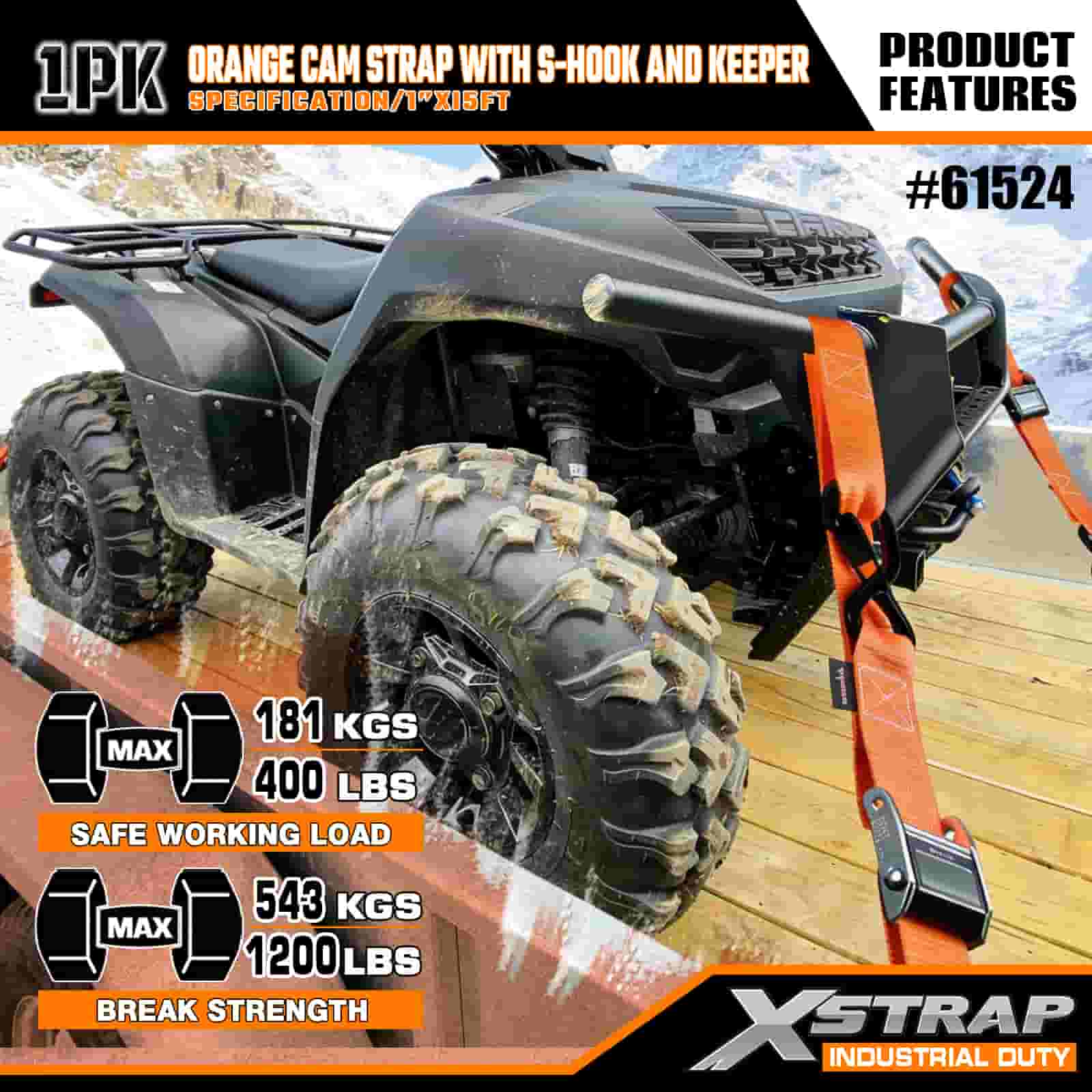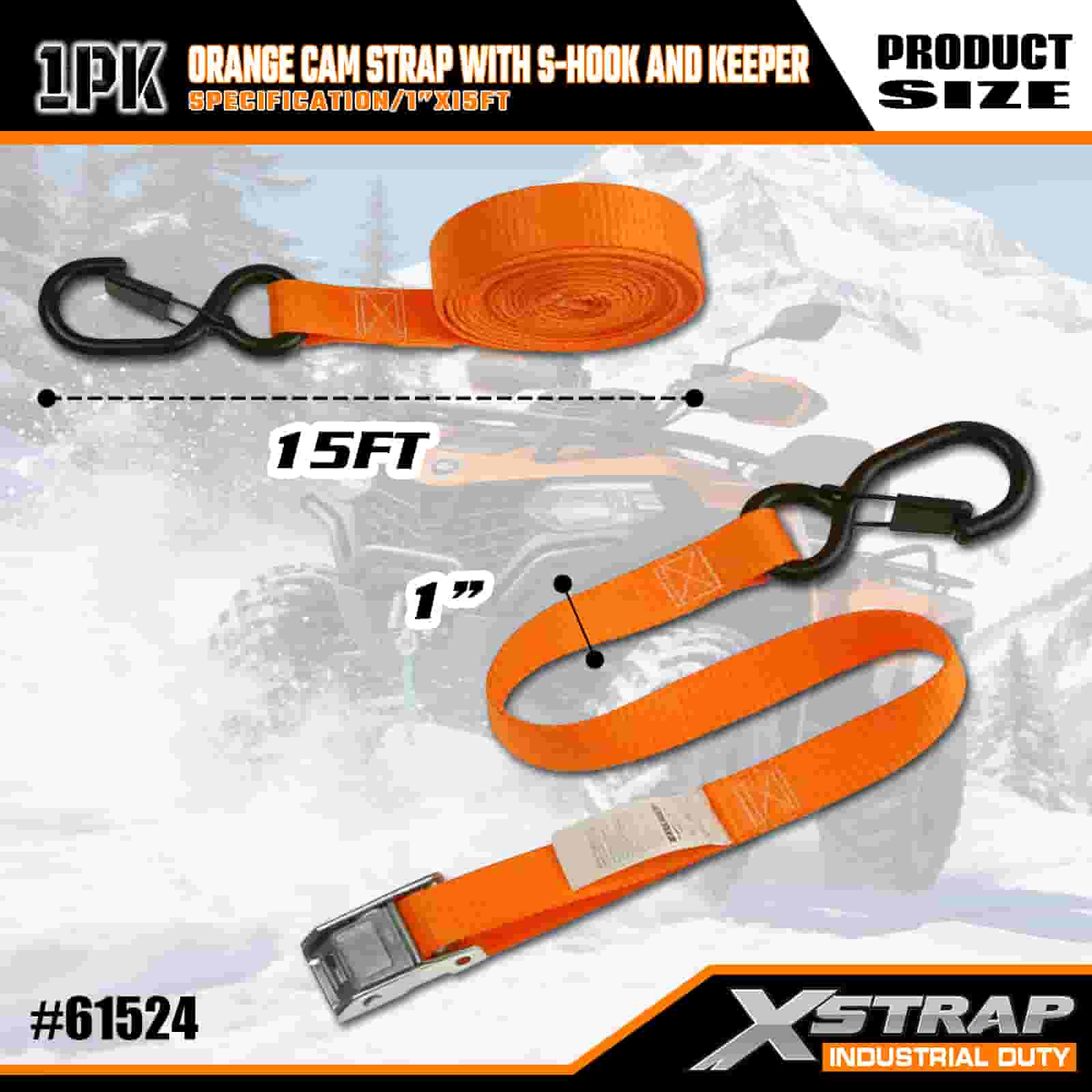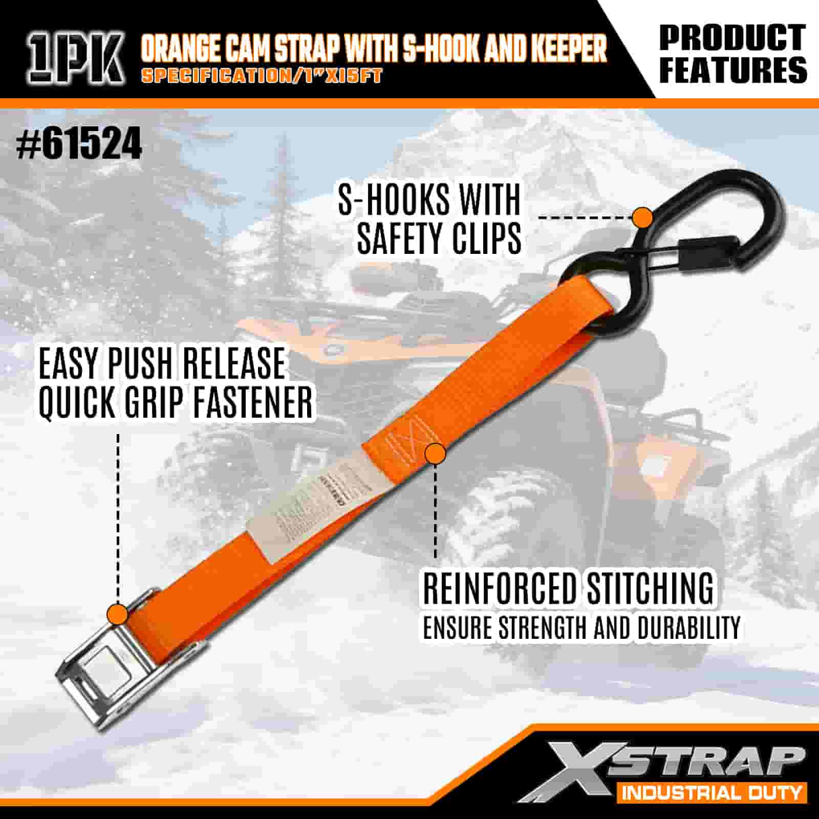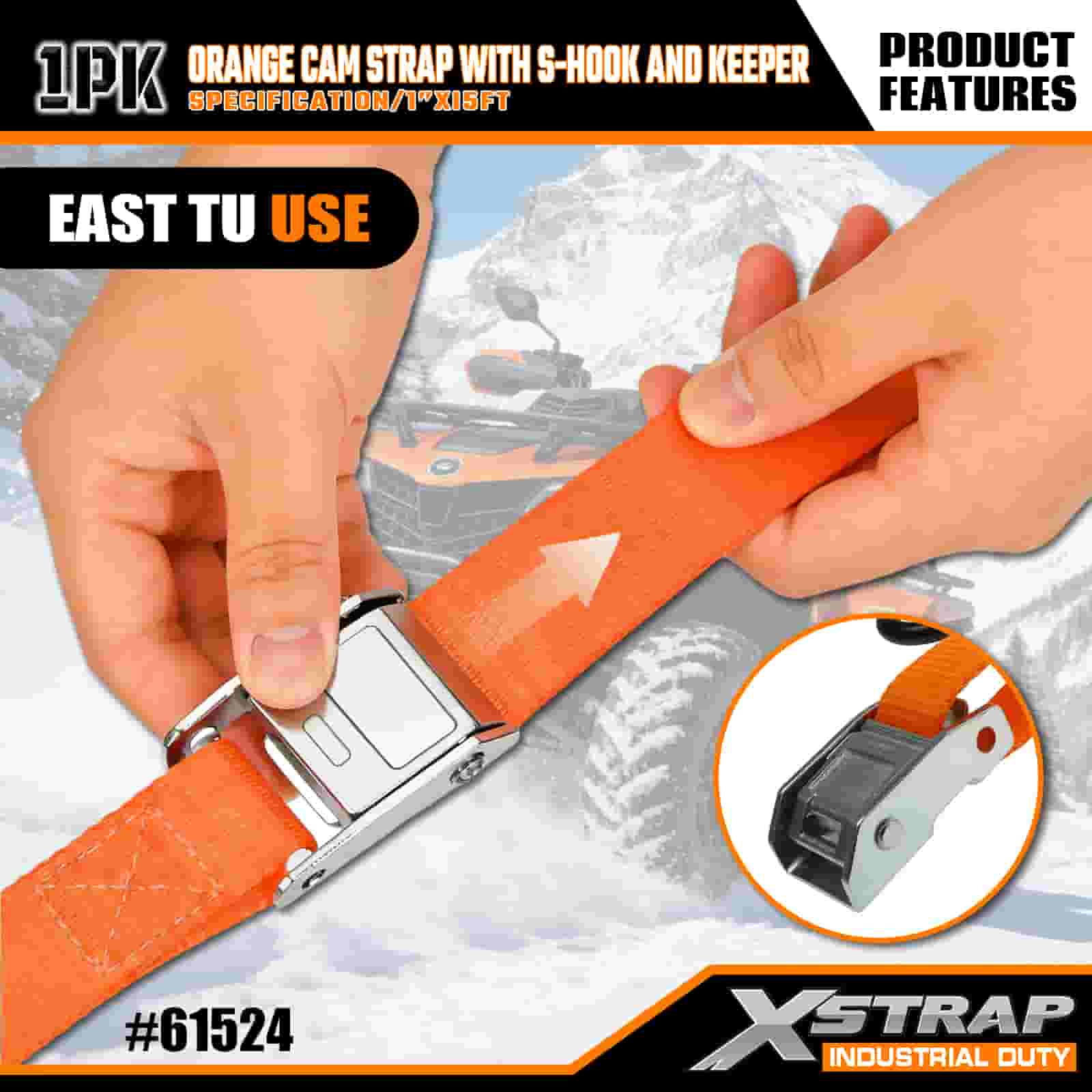 Xstrap Qrange -kamerahihna S-koukulla ja pidikkeellä, 1" x 15" polyesterisidontahihna, vetoräikkähihna, 400 lbs:n kuormankiinnityshihnat S-turvakoukuilla vakavalle ammattilaiselle perävaunun kiinnittämiseen, tasainen perävaunu, hiihtovene, pieni auto.