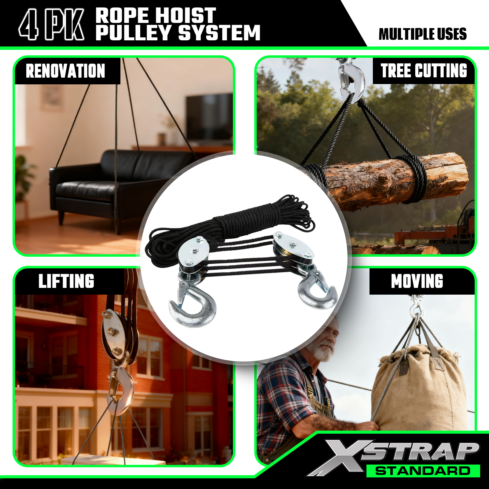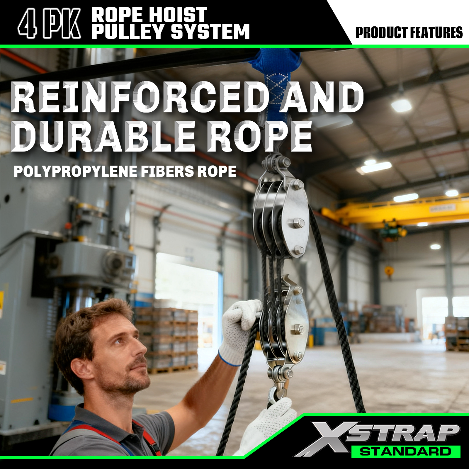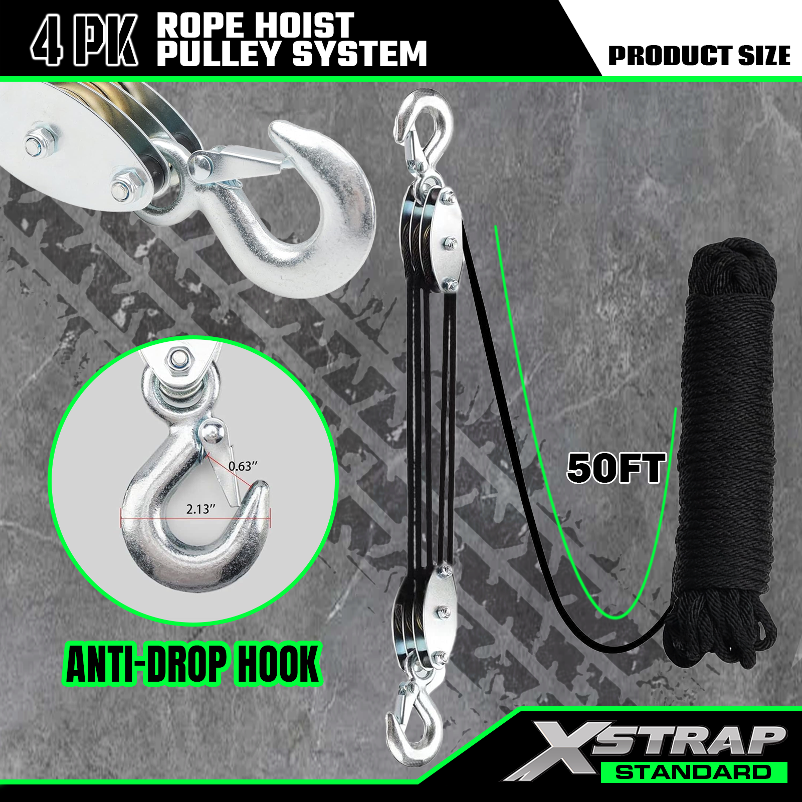 Tämä on Xstrap Standard Rope Hoist Pulley System. Kapasiteetti on 1000 paunaa, murtolujuus 2000 paunaa. 5:1 nostovoima 50 jalkaa raskaaseen käyttöön tarkoitettu hihnapyöräblokki metsästykseen, raskaiden esineiden nostamiseen liukumattomilla työkäsineillä, 2 kpl pehmeitä silmukoita.