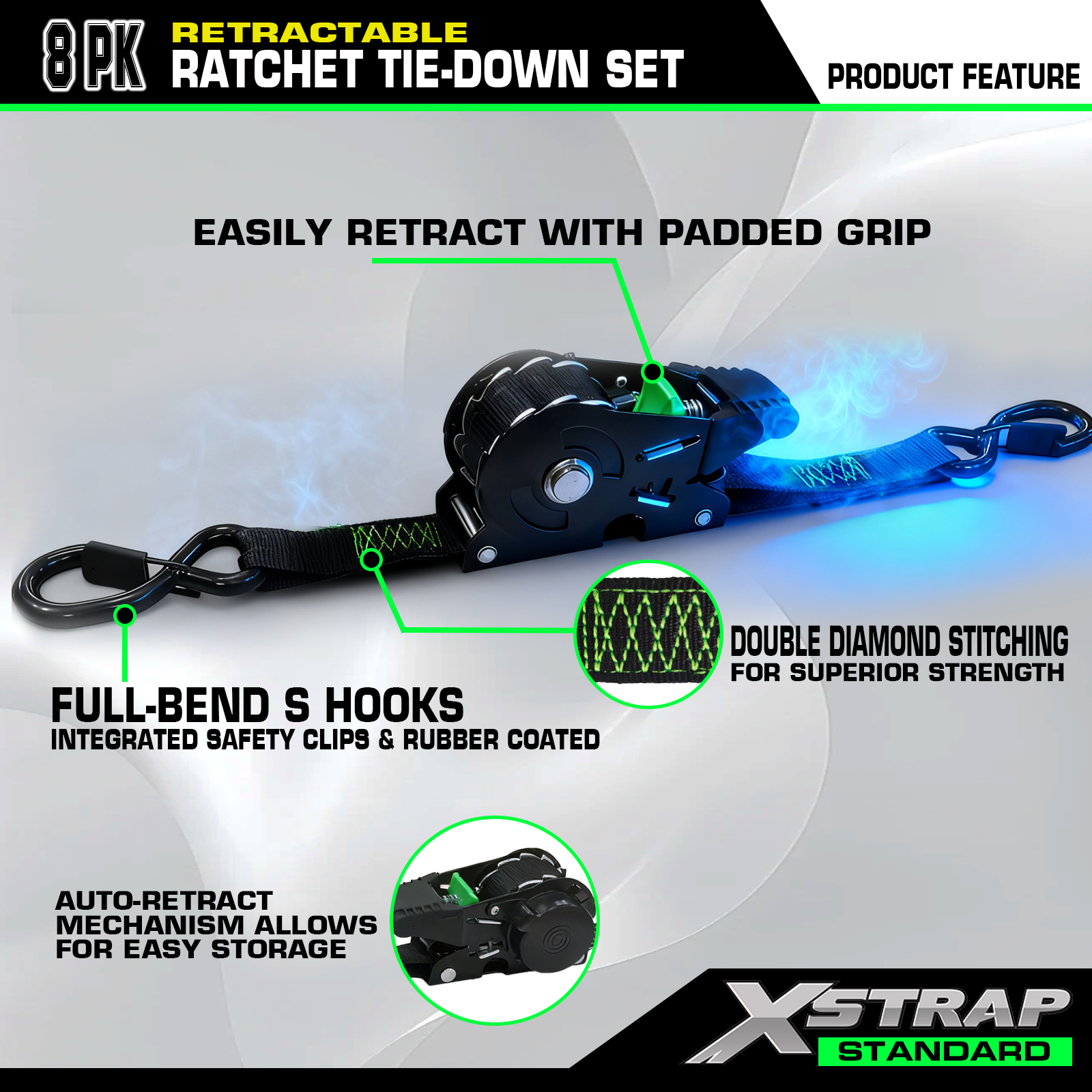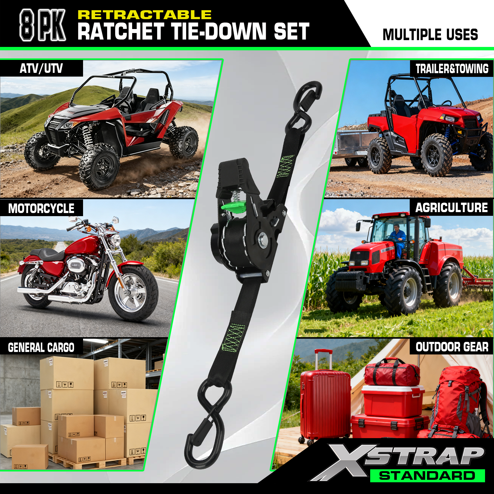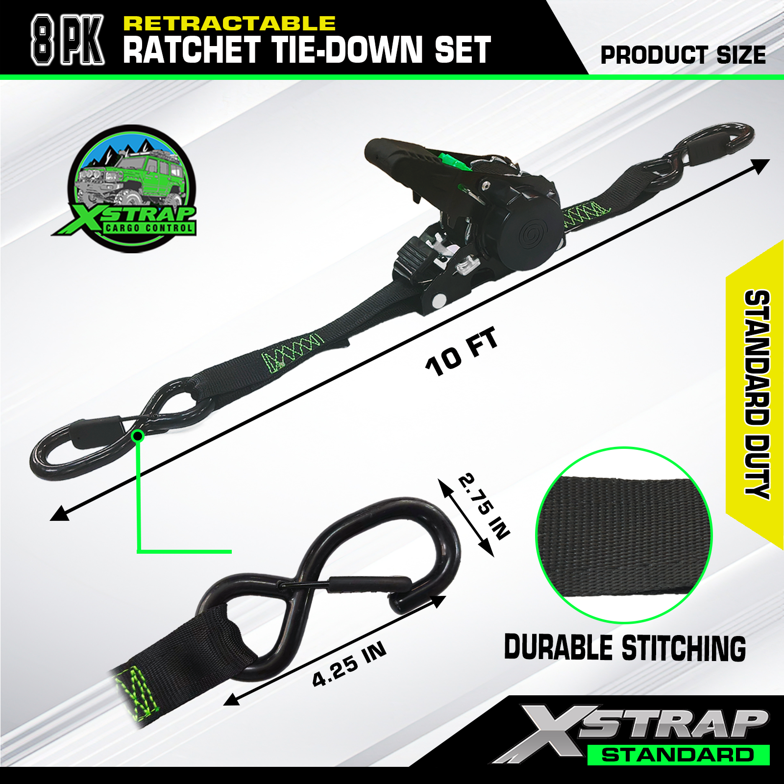 Sisäänvedettävässä räikkähihnassa on sisäänrakennettu automaattinen kelausmekanismi, jonka avulla hihna vetäytyy tasaisesti takaisin koteloonsa käytön jälkeen. Tämä ei vain pidä hihnaa siistinä ja suojattuna, vaan myös vähentää huomattavasti valmistelu- ja puhdistusaikaa. 10 jalan polyesterinauha tarjoaa vahvan jännityksen ja luotettavan lujuuden moottoripyörille, mönkijöille, polkupyörille ja UTV:ille. Ergonominen räikkäkahva on mukava käyttää, mikä tarjoaa paremman otteen ja vähemmän vaivaa kuormaa kiristäessä.