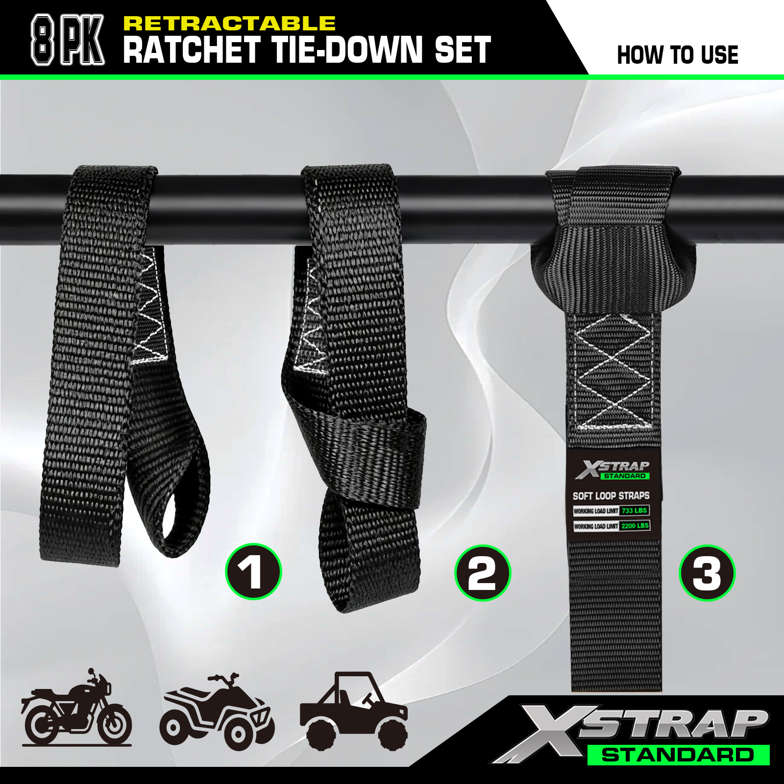 - Sisältää 4 pehmeää silmukkasidontaa - pehmeät silmukat voivat auttaa luomaan kiinnityspisteitä kattotelineiden, kuorma-autojen sänkyihin ja ohjaustankoon. Joten voit käyttää sisäänvedettäviä räikkähihnojamme monissa tilanteissa.
