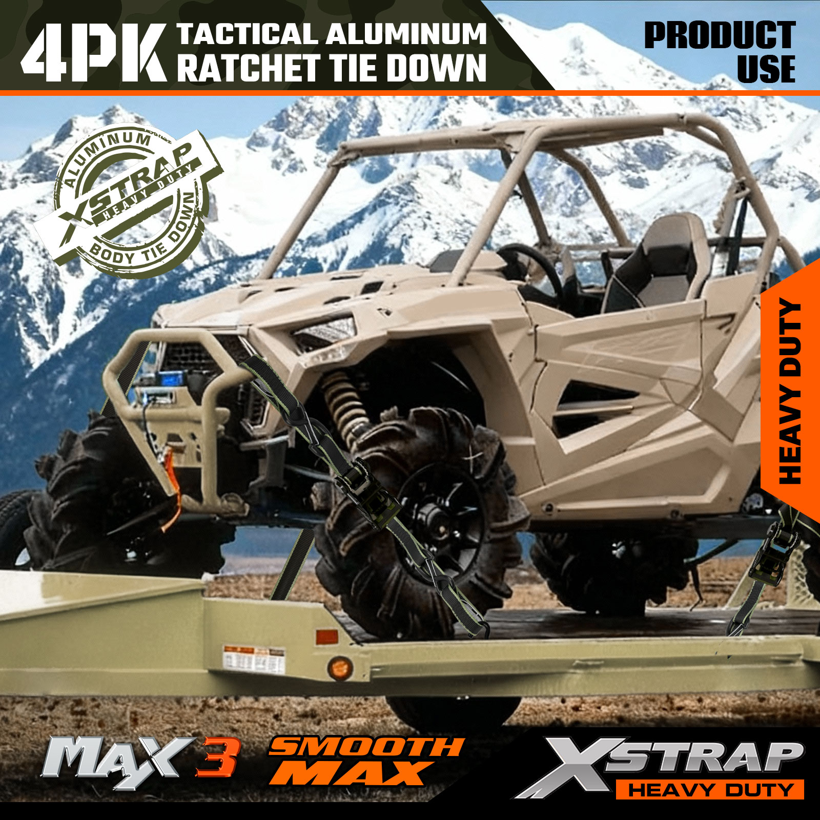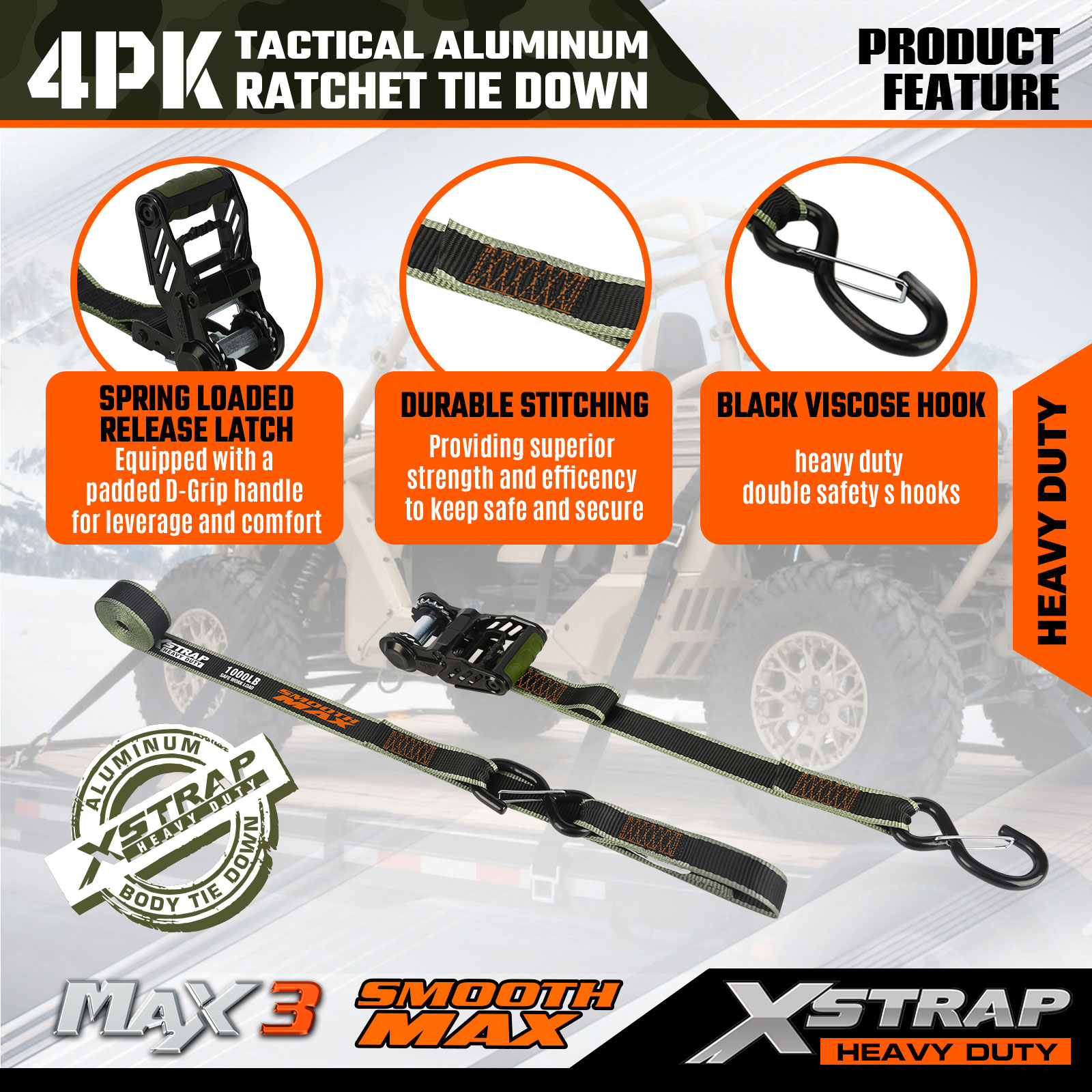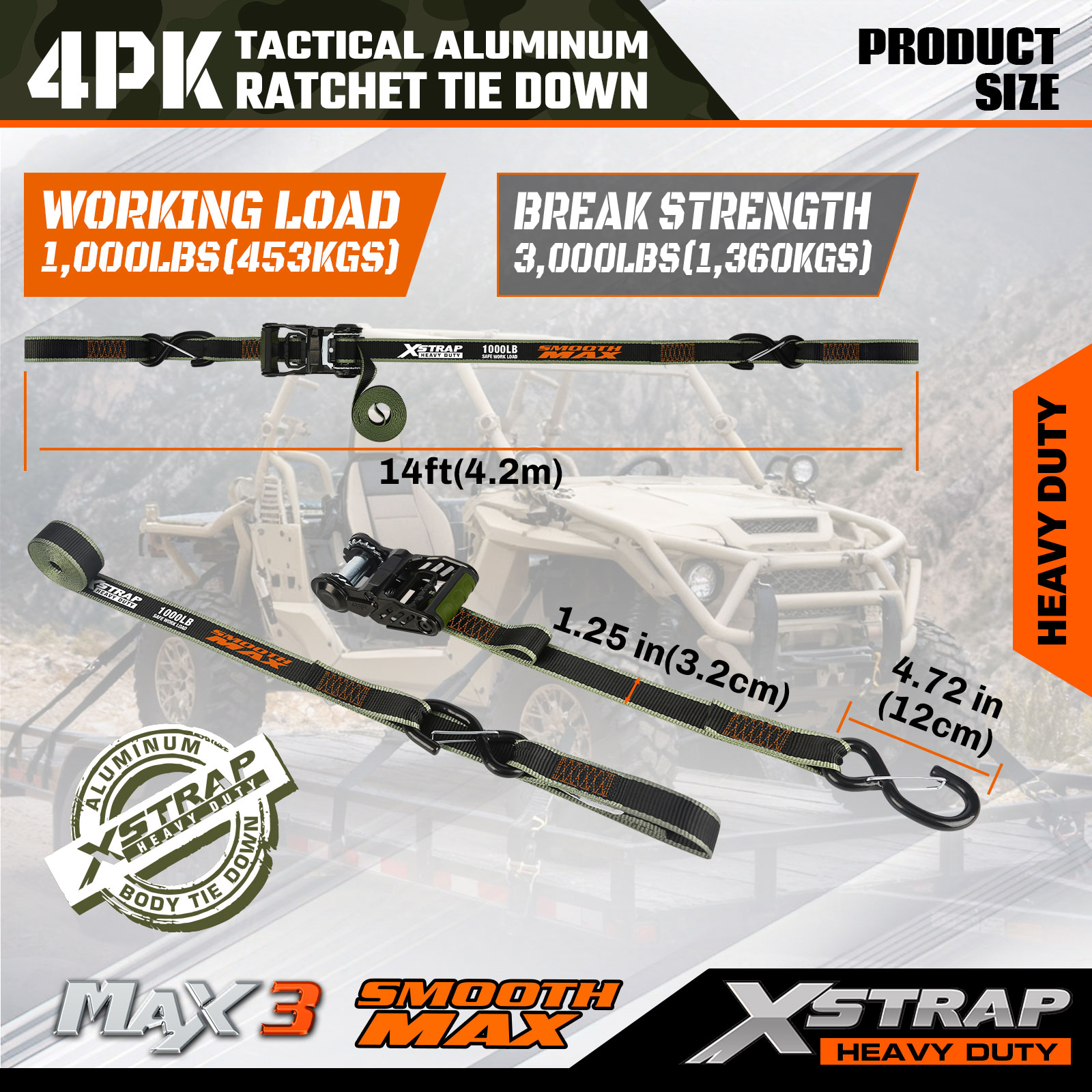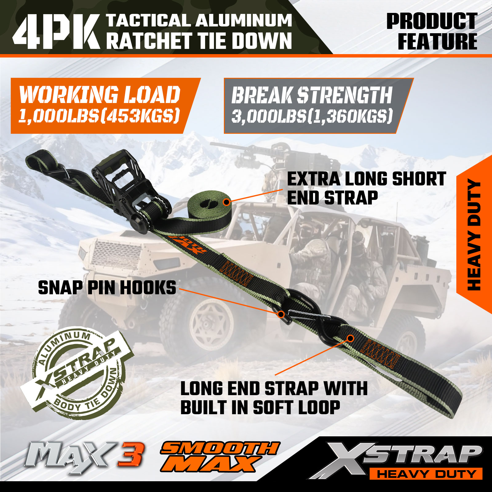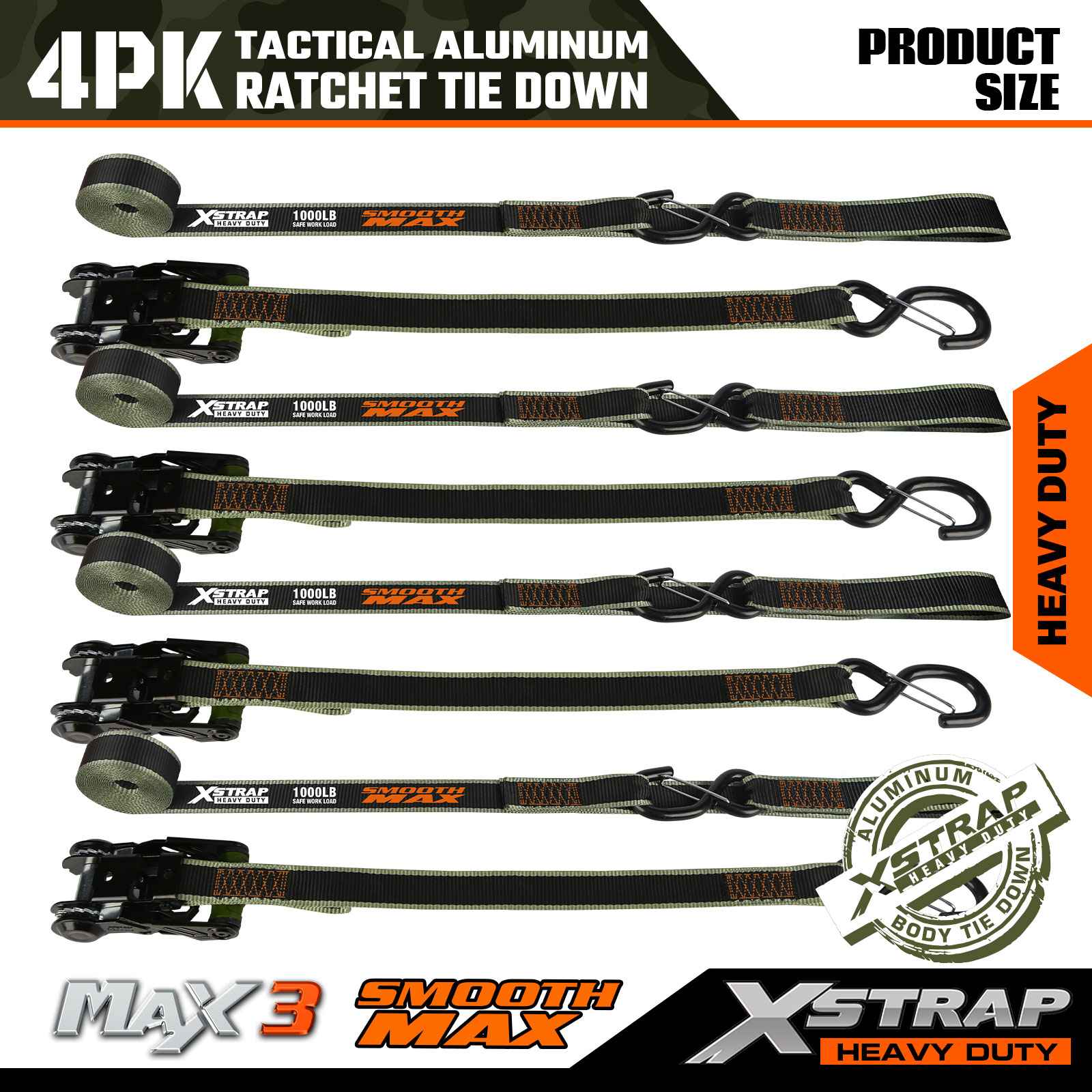 Xstrap Tactical Ratchet Tie Down on 1,25 tuumaa x 12 jalkaa, turvallinen työkuorma on 1000 paunaa ja murtolujuus 3000lbs.