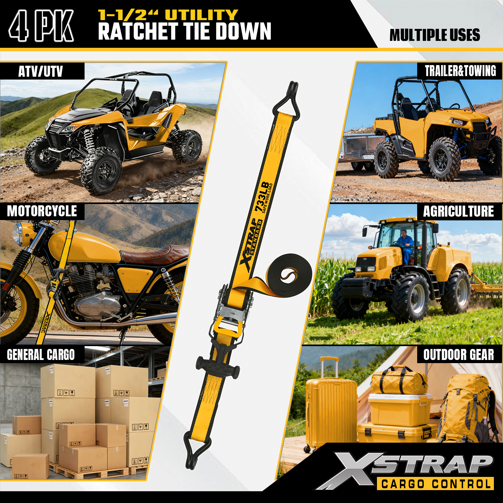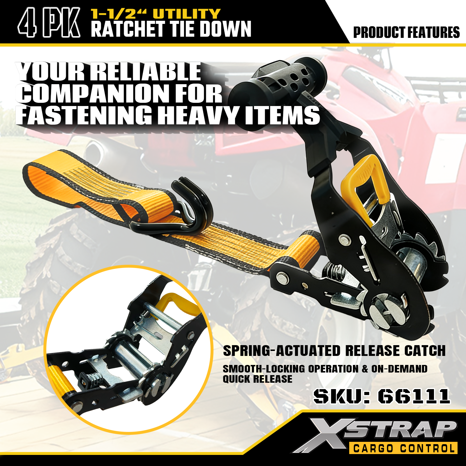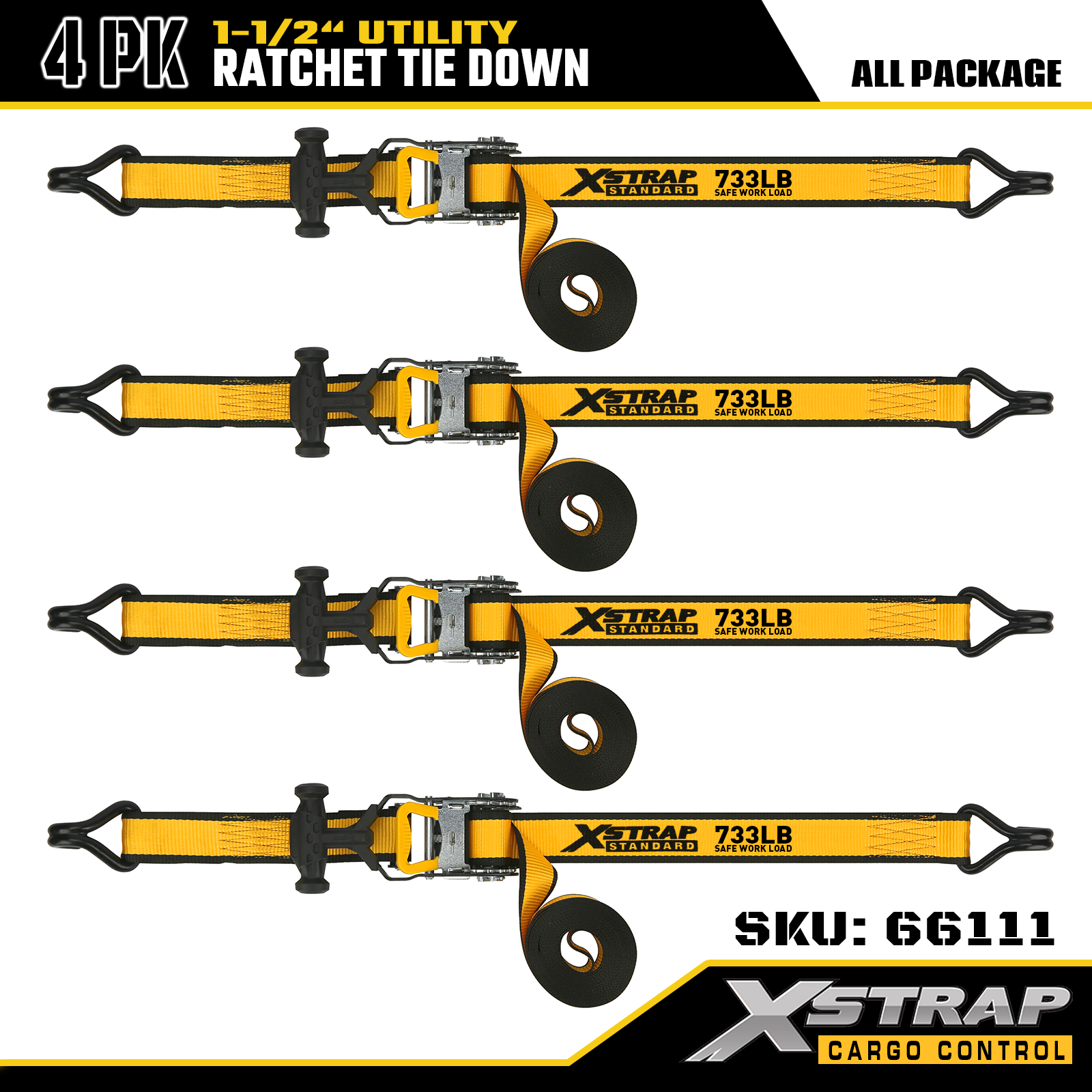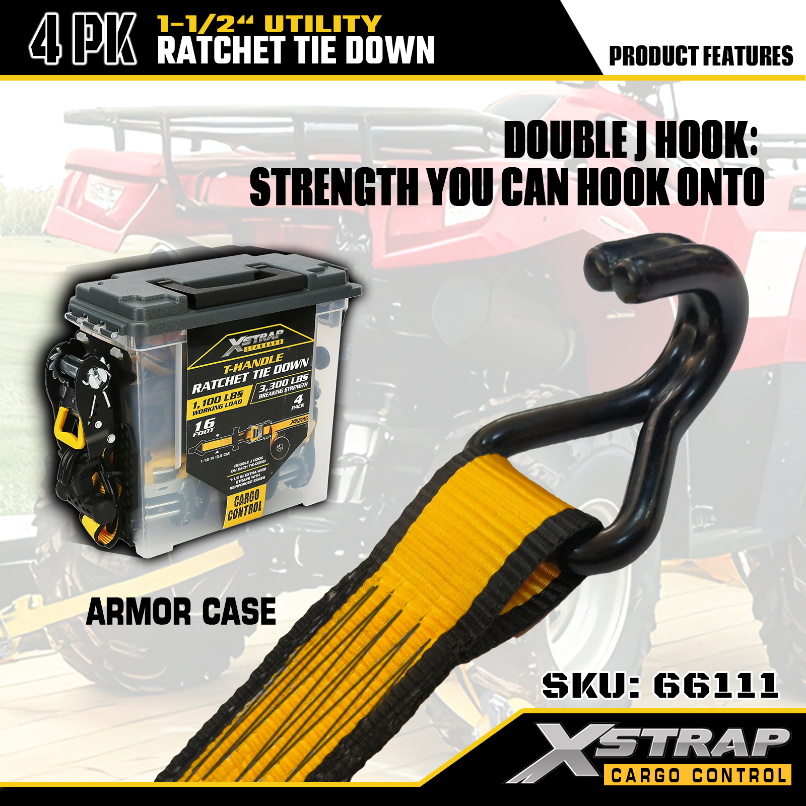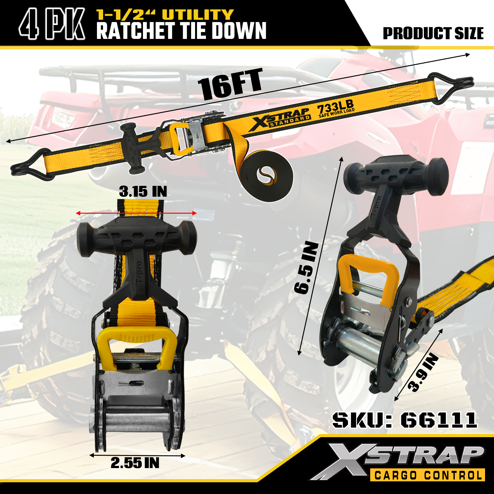 Xstrap T-kahvan Ratchet Tie Down on 1,5 tuumaa x 16 jalkaa, turvallinen työkuorma on 1100 paunaa ja murtolujuus 3300lbs.