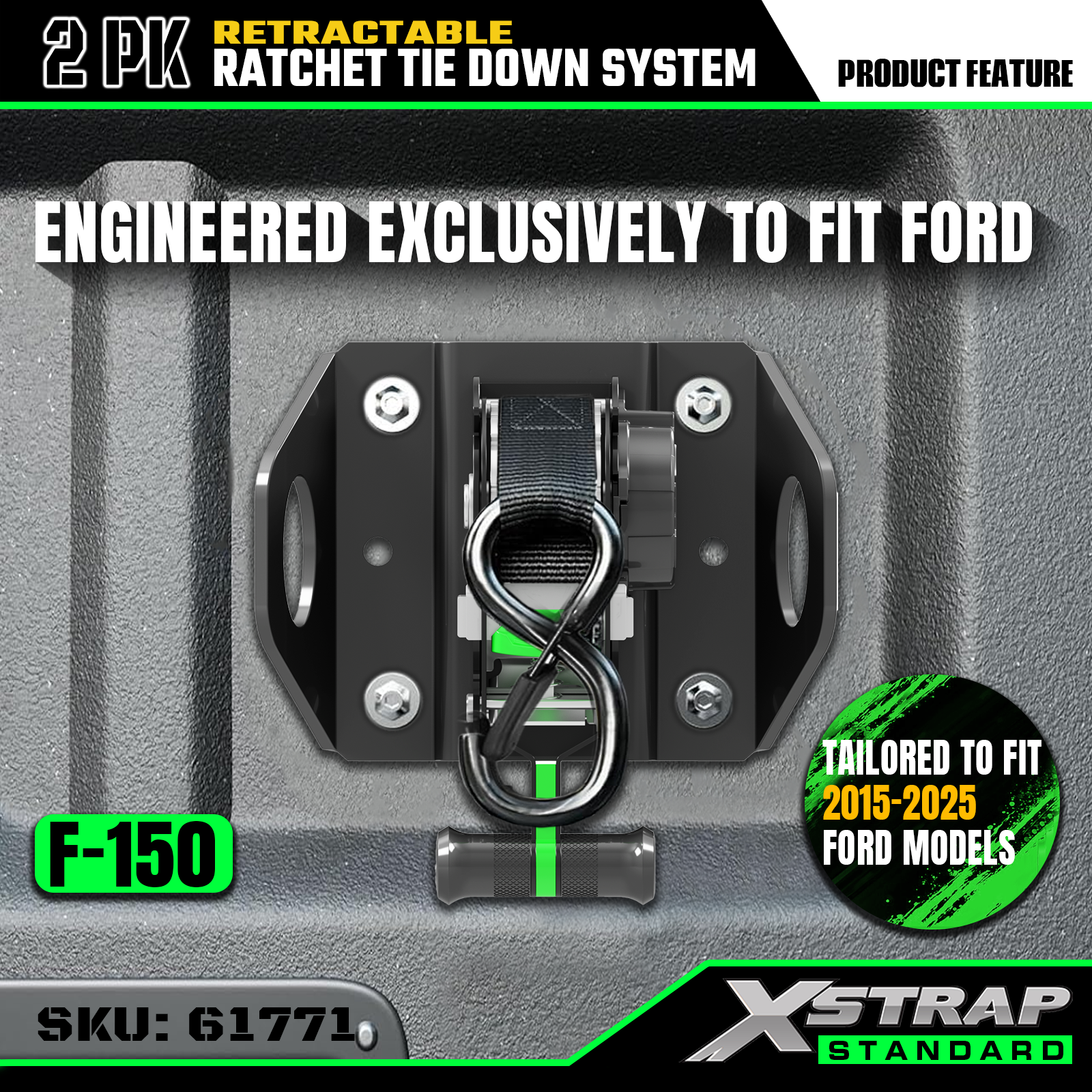 Tämä on Xstrap sisäänvedettävä solmittava hihna, joka sopii F150 2015-2026 Fordiin turva-S-koukuilla. Turvallinen työkuorma on 500 paunaa ja murtolujuus 1500 paunaa.