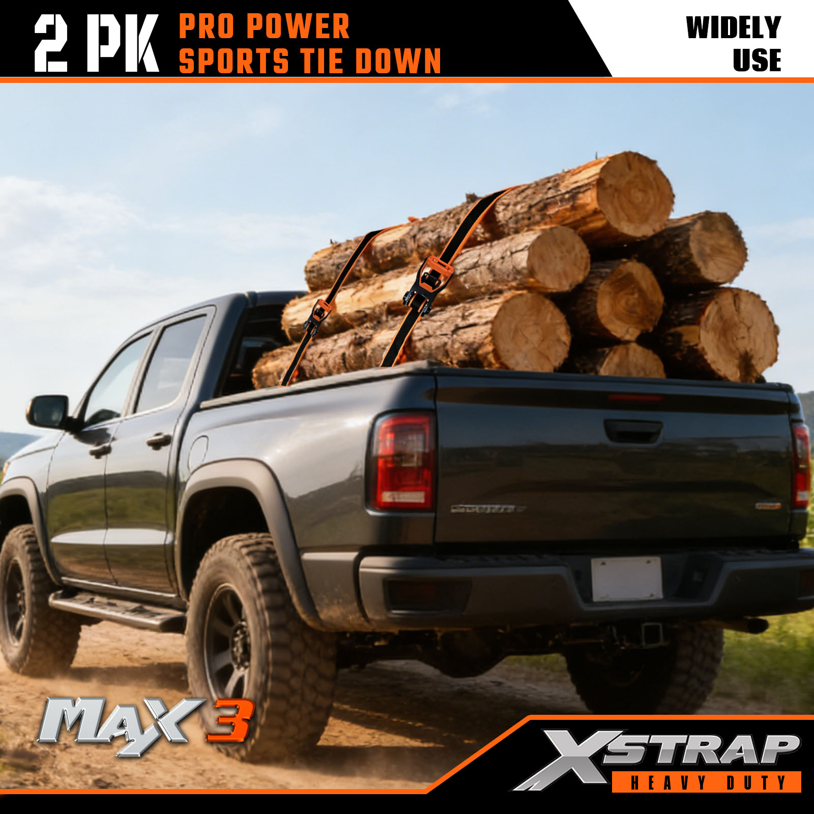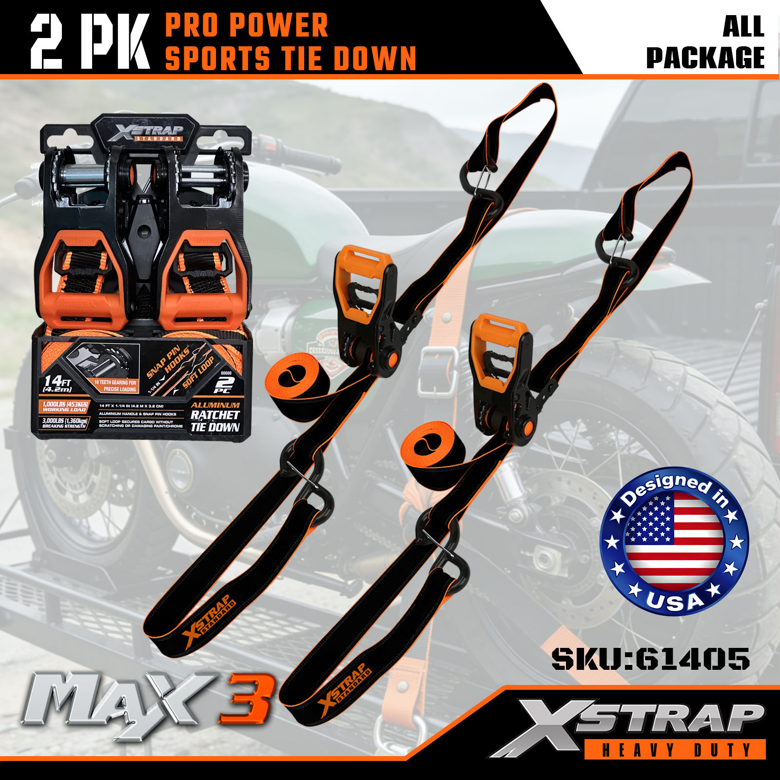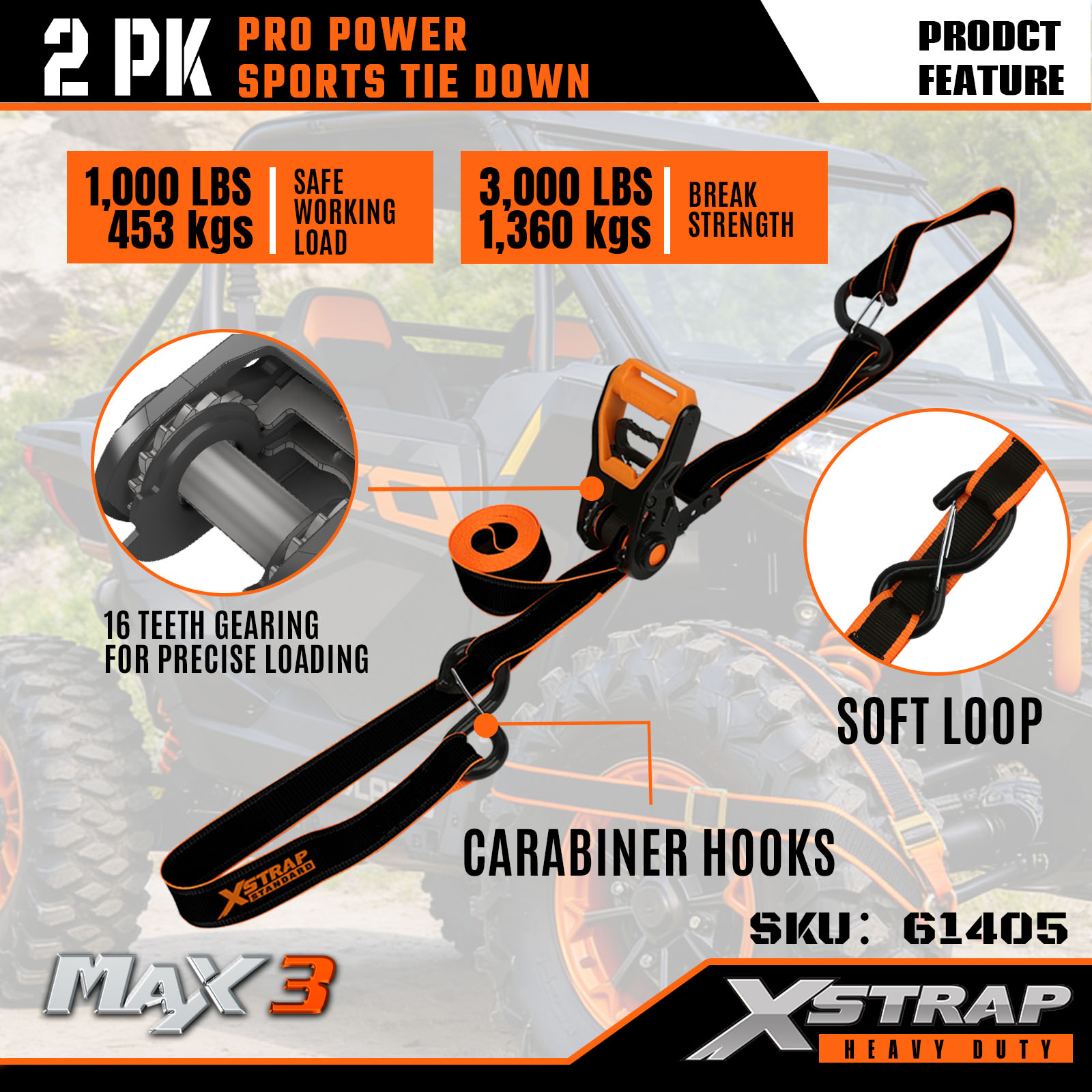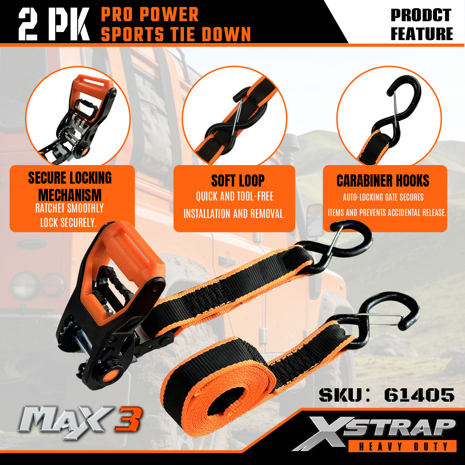 Xstrap 2 Pack PRO Power Sports Sidottavat hihnat, 1–1/4” x 14 tuuman polyesterisidontahihna, vetoräikkähihna, 1000 lbs:n kuormankiinnityshihnat karabiinikoukuilla kuorma-autoille, maastoautoille, autotelineisiin moottoripyöriin.