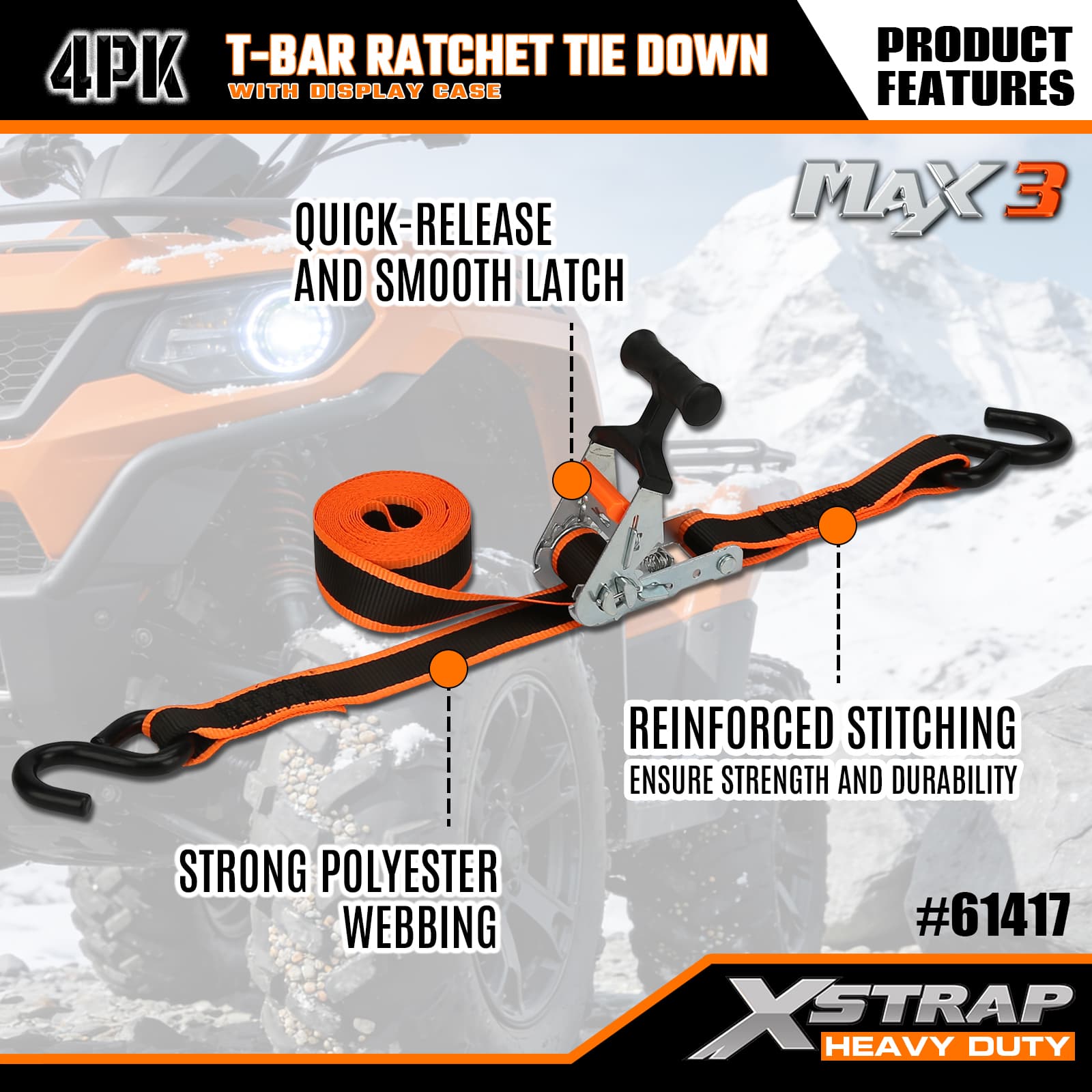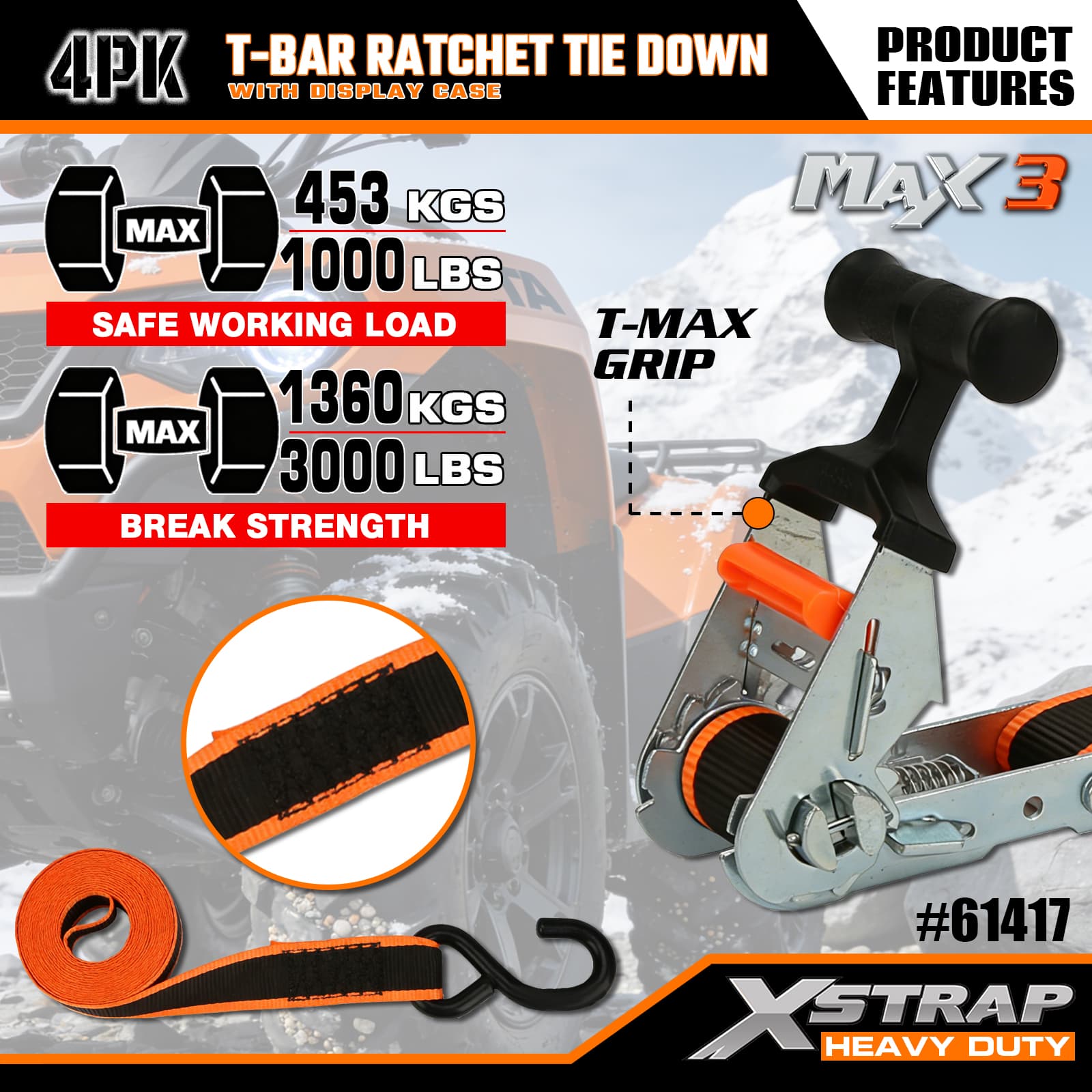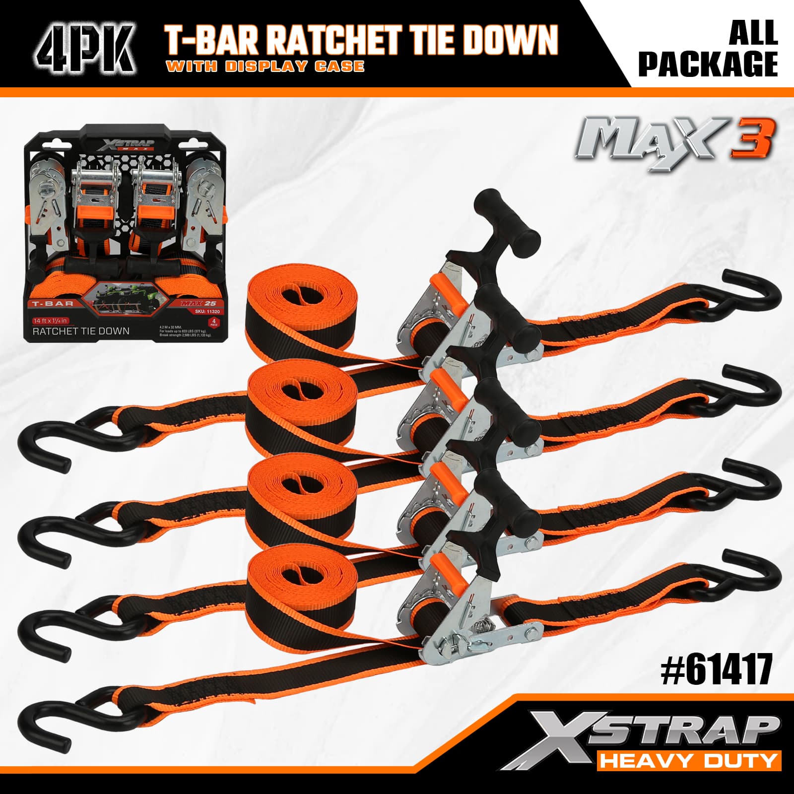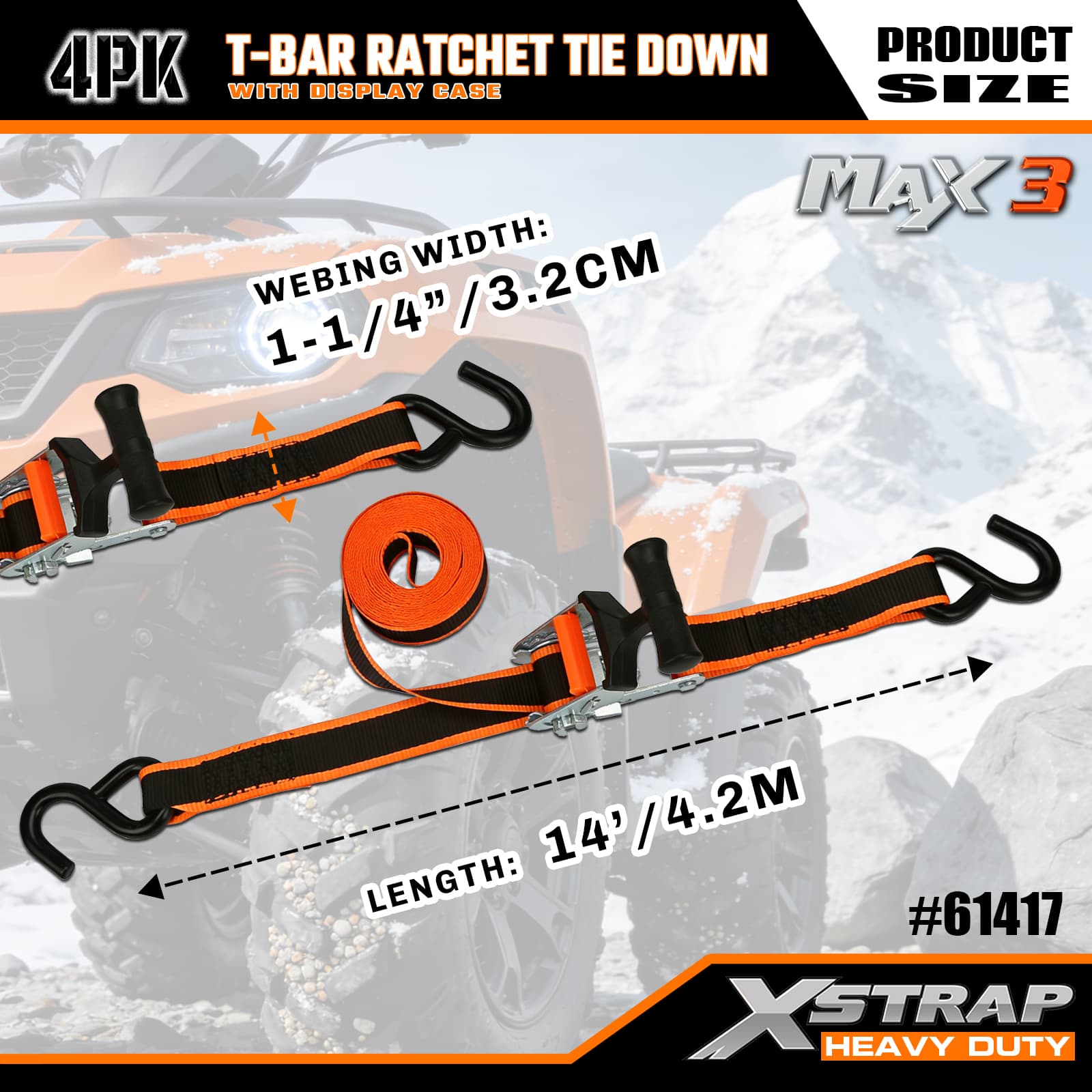 Xstrap 4 Pack T-Max Grip -räikkä, 1-1/4" x 14" polyesterisidontahihna, vetoräikkähihna, 1000 lbs:n kuormankiinnityshihnat S-koukuilla lava-autoille, maastoautoille, autotelineille, katumaasturille, moottoripyörälle, jetille.