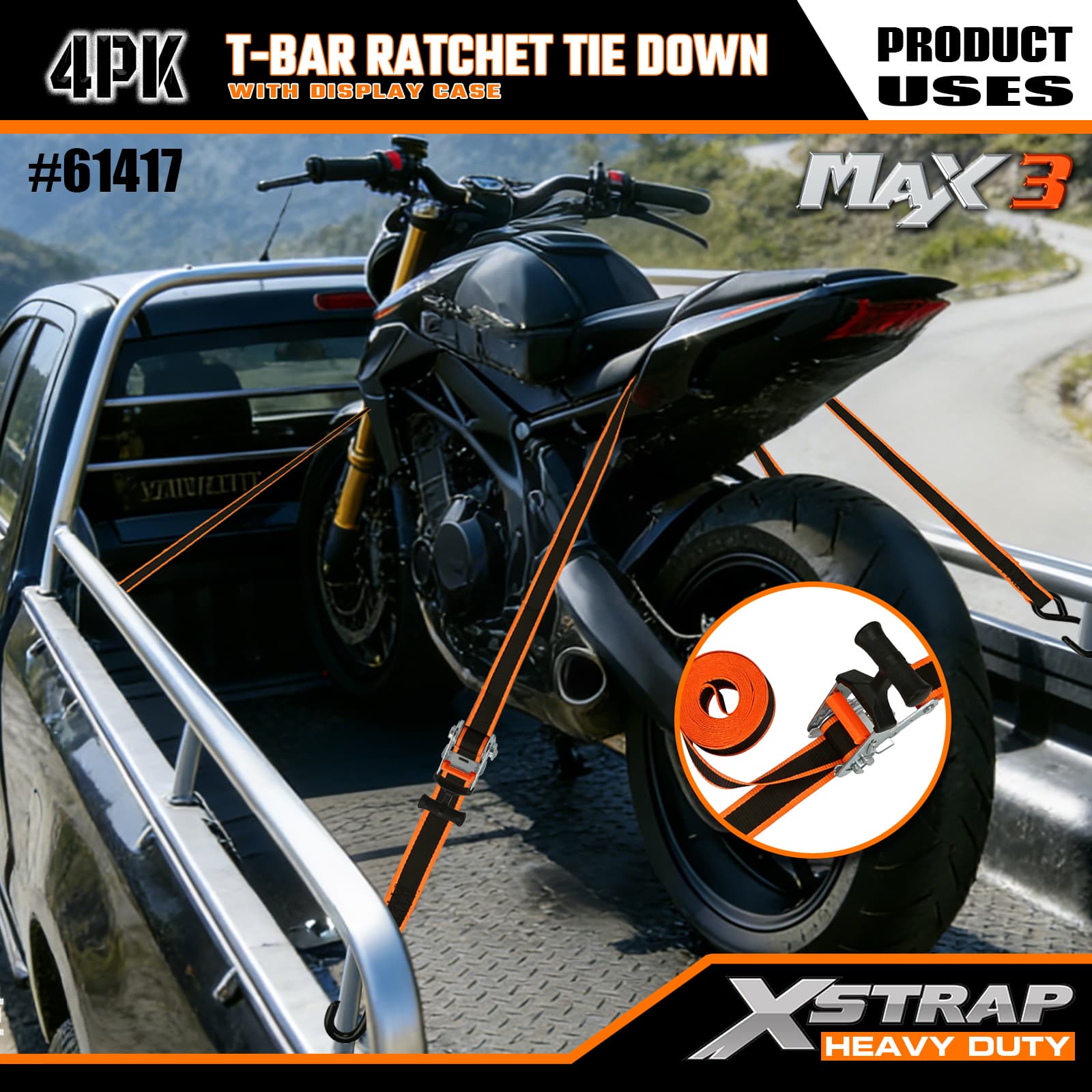 - Max Grip T-tangon räikkämekanismi: Sisältää ergonomisen T-tangon kahvan, joka tarjoaa parannetun vipuvoiman tasaiseen ja kevyeen kiristykseen – intuitiivinen käyttö, joten kaiken tasoiset käyttäjät voivat kiinnittää lastin nopeasti.