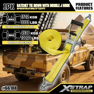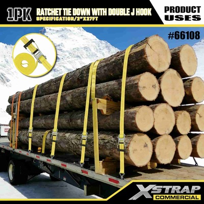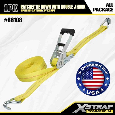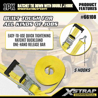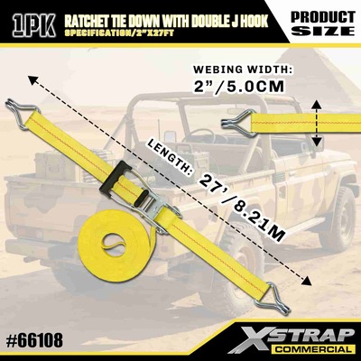 Xstrap-räikkäsidonta, jossa kaksinkertainen J-koukku, 2" x 27" polyesterisidontahihna, vetoräikkähihna, 3333 paunaa kuormankiinnityshihnat, joissa on kaksois-J-koukut kuormanhallintaan tarkoitettua lava-autoa, katumaasturia, auton ylätelinettä.