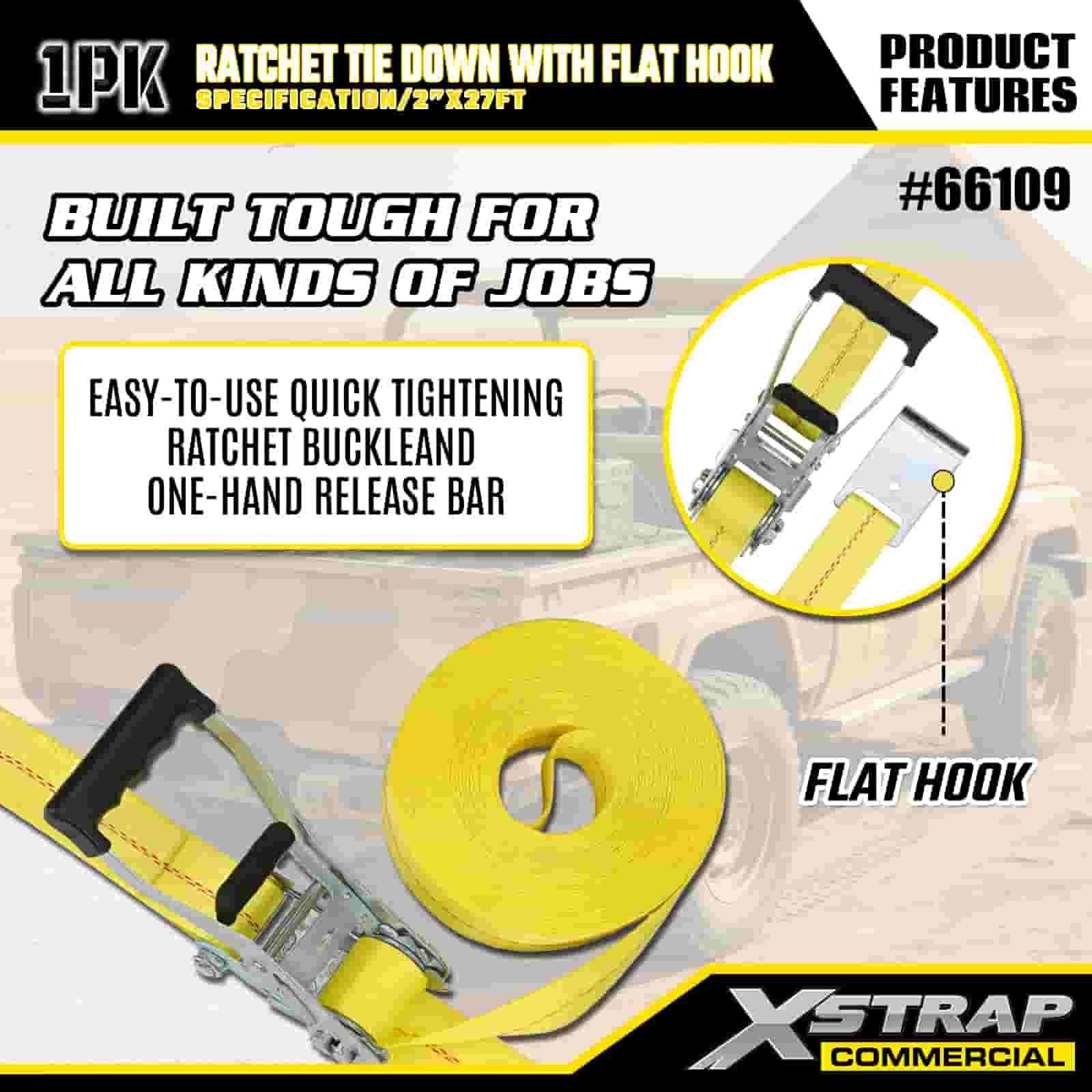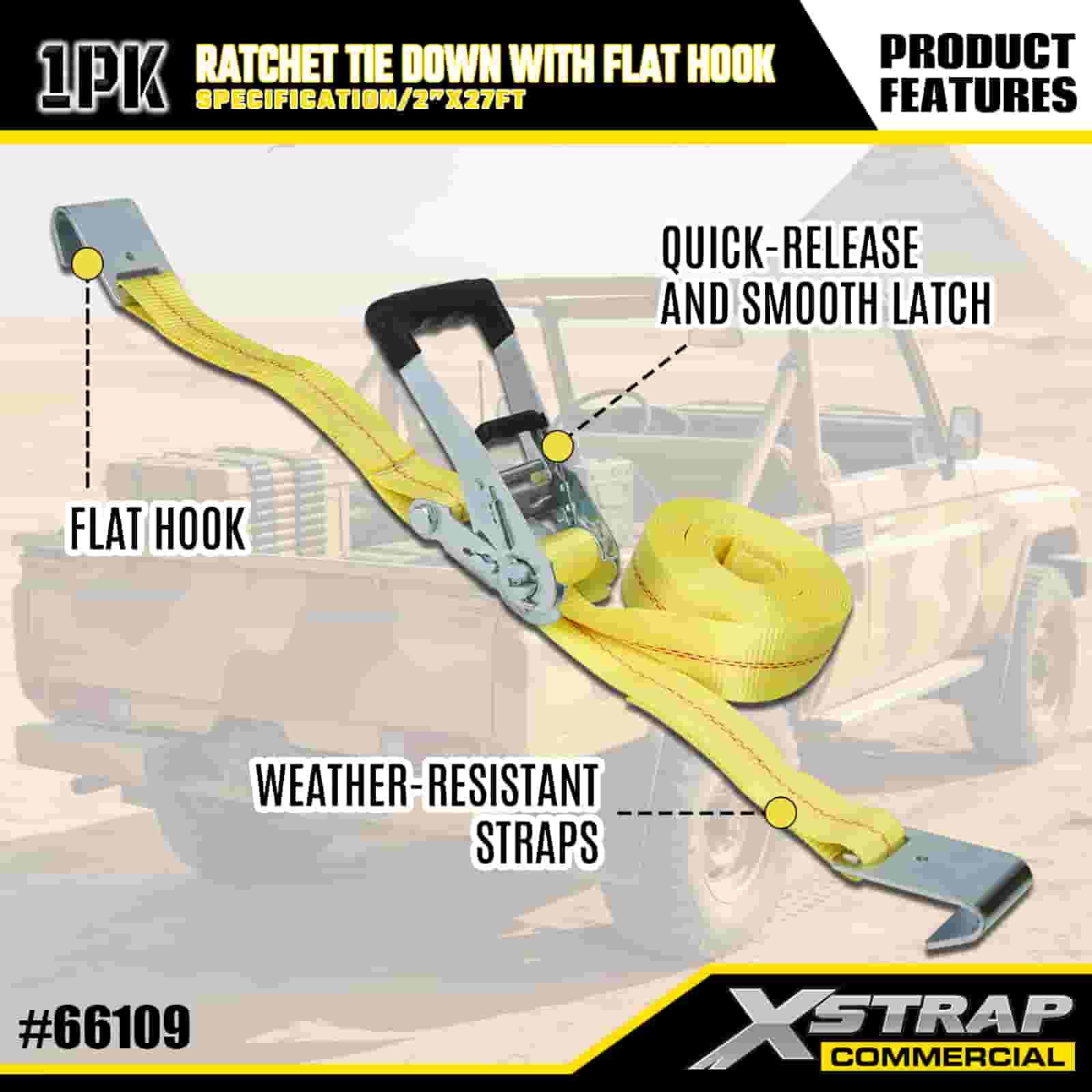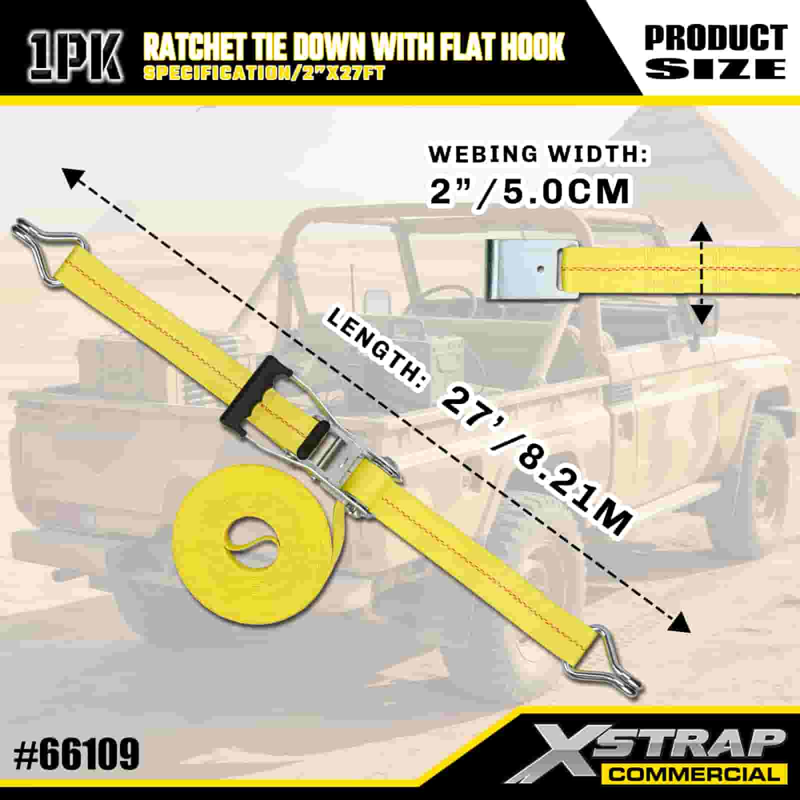 Xstrap Ratchet Solmittava litteillä koukuilla, 2" x 27" polyesterisidontahihna Vetoräikkähihna, 3333 lbs:n kapasiteetti lastinkiinnityskiinnityshihnat litteillä koukuilla lastinhallintaan tarkoitettuun lava-autoon, maastoautoon, auton ylätelineisiin moottoripyörään.