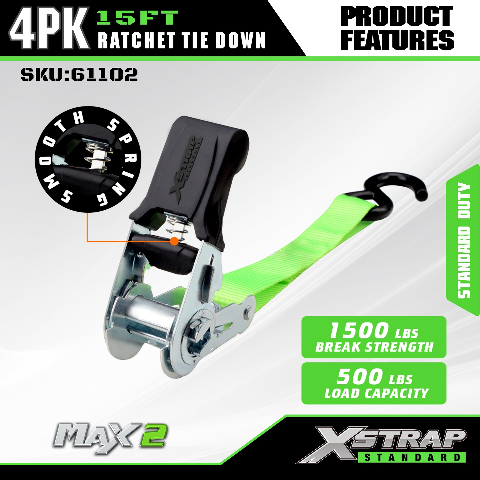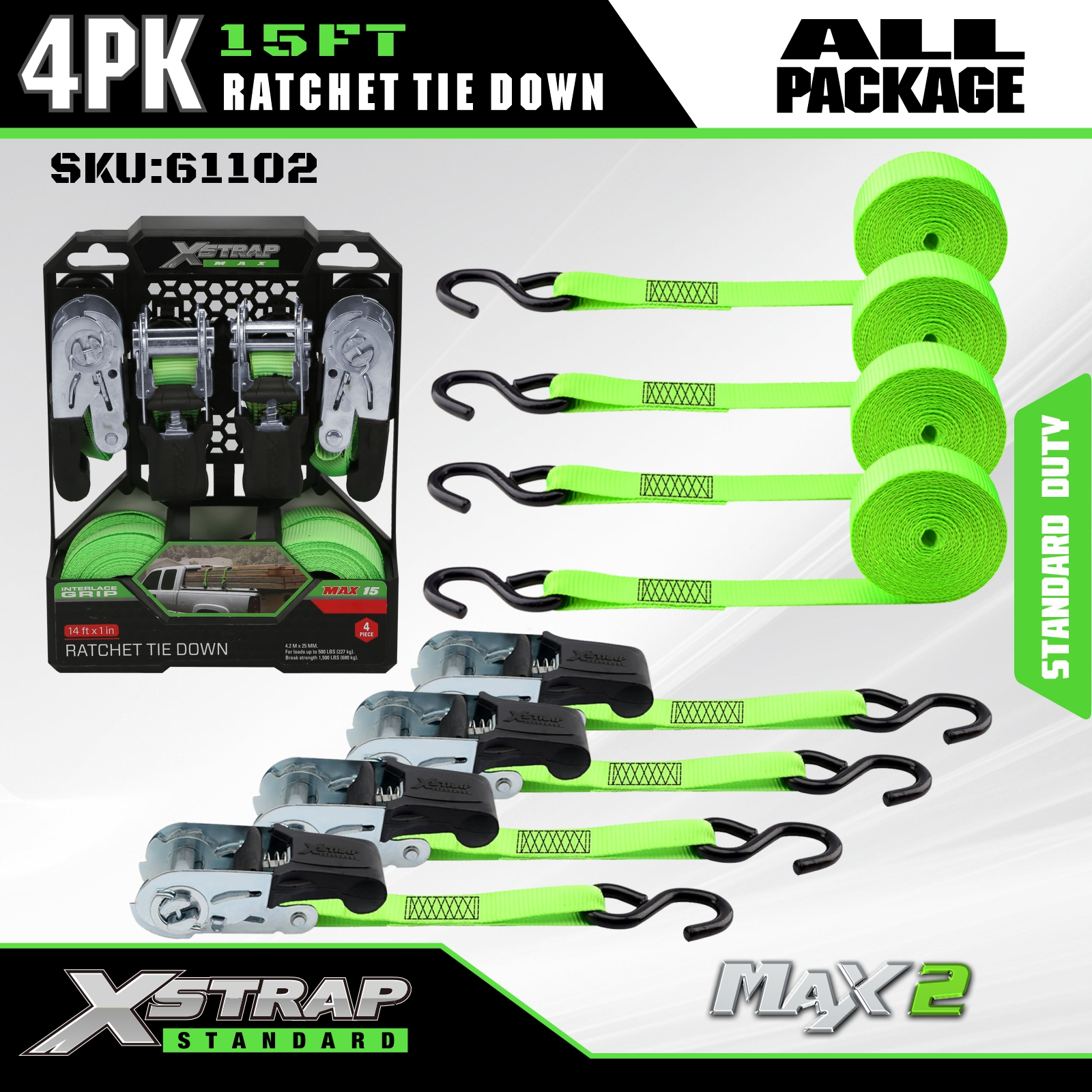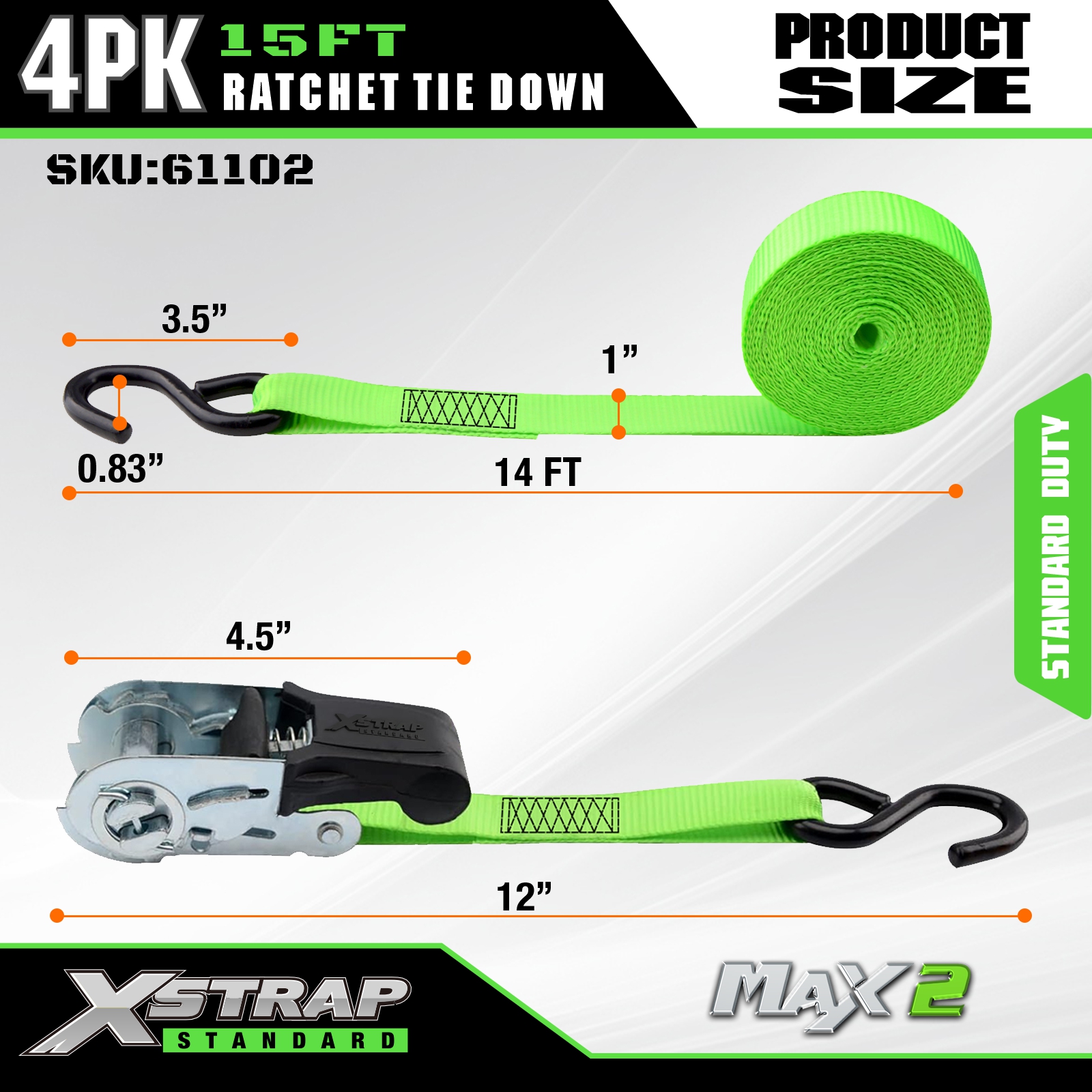 Xstrap Ratchet Kiinnityshihnat 4 PK 15Ft- 500 Lbs Kantavuus 1500 Lbs murtumislujuus-lastihihnat liikkuviin laitteisiin, nurmikon varusteisiin, moottoripyöriin.