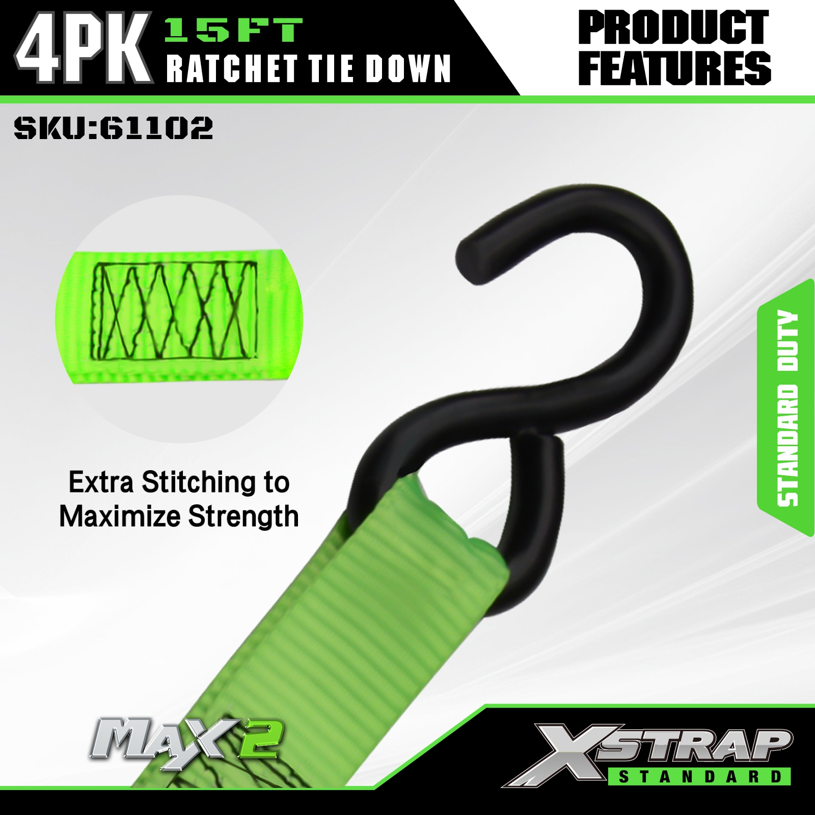 - Suojaavat kumipäällysteiset S-koukut: Varustettu kumipäällysteisillä teräksillä varustetuilla S-koukuilla, jotka estävät tehokkaasti naarmuja ja vaurioita lastin ja ajoneuvon pinnoille. Ihanteellinen kuormien kiinnittämiseen liikkuvissa kuorma-autoissa, UTV:issä, mönkijöissä, maastopyörissä, moottoripyörissä ja välttämättöminä kuorma-autojen lisävarusteina.